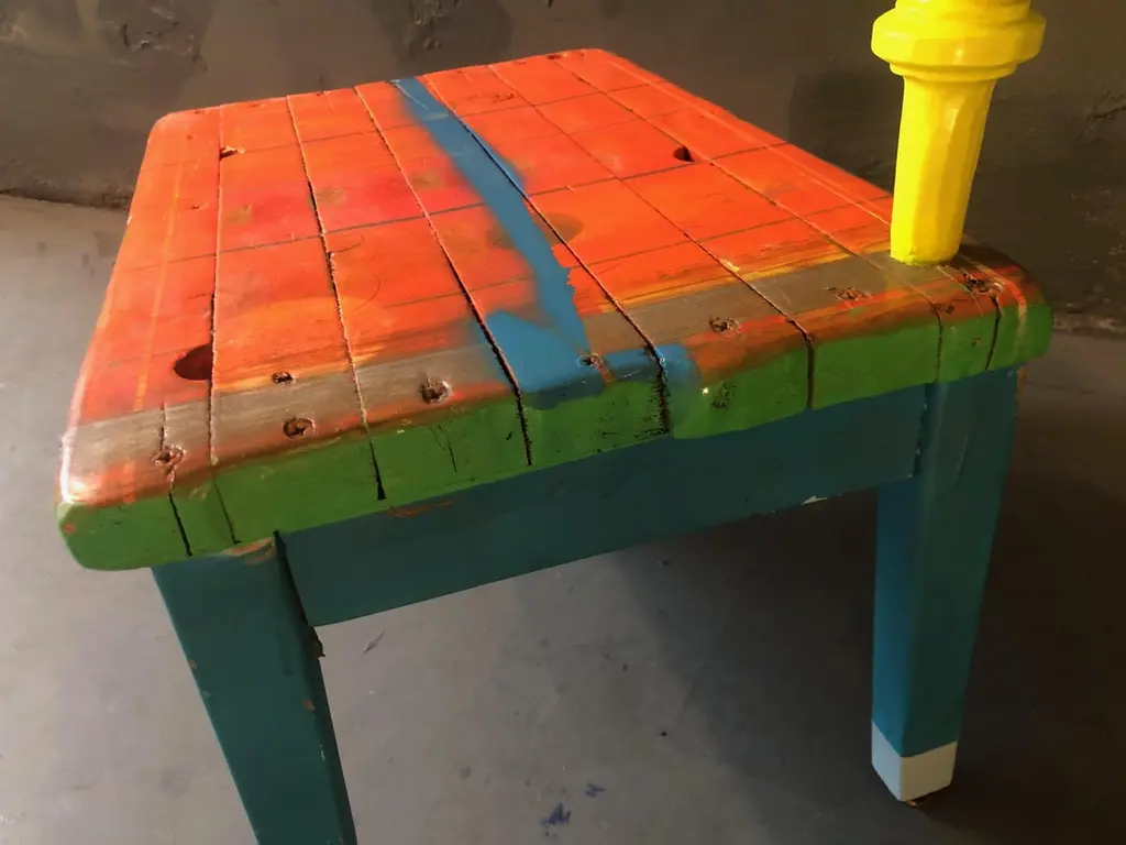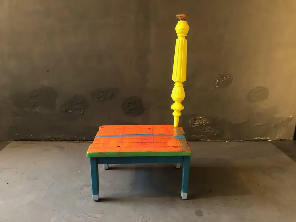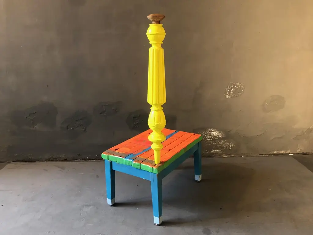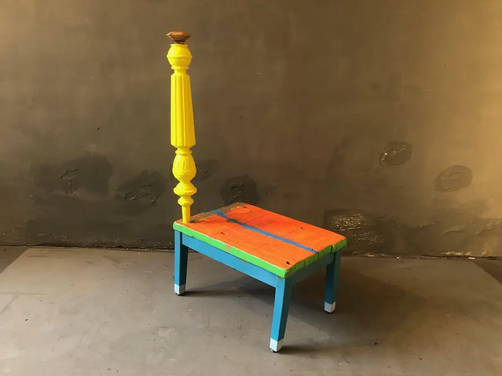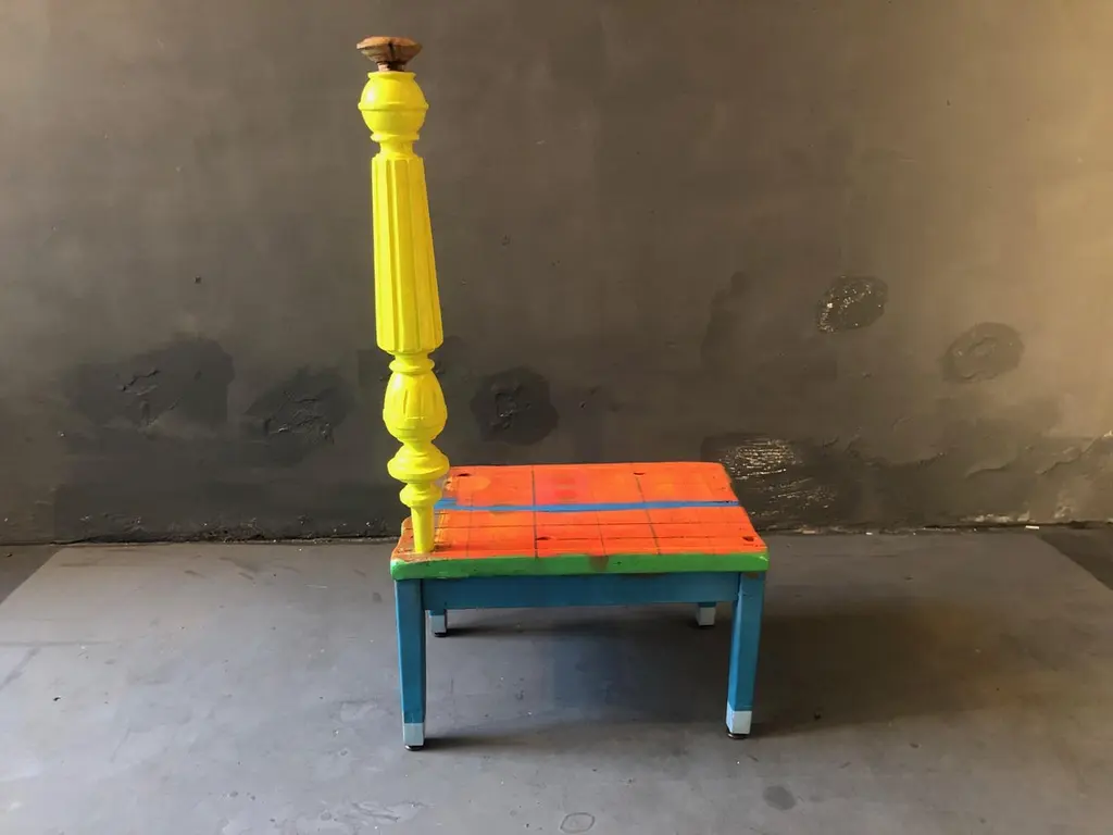 Stummer Diener Stool by Markus Friedrich StaabOne of a KindDimensions: D 30 x W 48 x H 100 cm.Materials: Wood, lacquer, paint.De-constructed low stool, painted and multi-lacquered.Markus Friedrich StaabFurniture has always surrounded us. Furniture is not just made up of functional objects. Furniture is an expression of its times. It tells us about something: its use, its worth and its owners, and of its value. A roughly crafted wood-plank chair in a farmer’s kitchen, a fancy dining room chair for formal gatherings, an extroverted Rietveld, or a modern architect’s or design aficionado’s cantilever chair. Each object holds layers of stories, cultural and personal, that live inside its shape and on its surface; fissures, chips, and other signs of use and wear.Objekts we surround ourselves are representatives of being, expressions of taste. They show what we like, what we respect, what we like to have around us, and what they mean. Through their presence, I take a stance. These pieces of furniture are the starting point of my work.Factory produced functional objects are liberated from their original meaning, condition and do undergo a transformation that becomes an art object with singular intrinsic value.I work with carefully curated chairs, different types of furniture, objects that were possibly left unnoticed, unappreciated. I lift them out of mundane existence, try to free them from disregard, careless handling, and a general state of being overlooked. These are my aspirations!