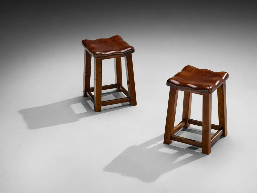 Stools, walnut, Italy, 1970sBeautifully handcrafted stools made in Italy in the 1970s, these pieces embody the perfect balance of rustic charm and a sense of robustness. Constructed from rich walnut wood, they showcase a natural warmth. The seats are particularly distinctive with their wavy, sculpted design, imparting an organic feel. The thick, solid legs that are slightly tapered ensure stability and add a structural rhythm to the design. Their understated elegance and bucolic character make them a versatile addition to a variety of settings. Kindly note that the pieces are in good, used condition with signs of age and use. For further details, we encourage you to reach out to our team of design specialists.The listed price is per item.