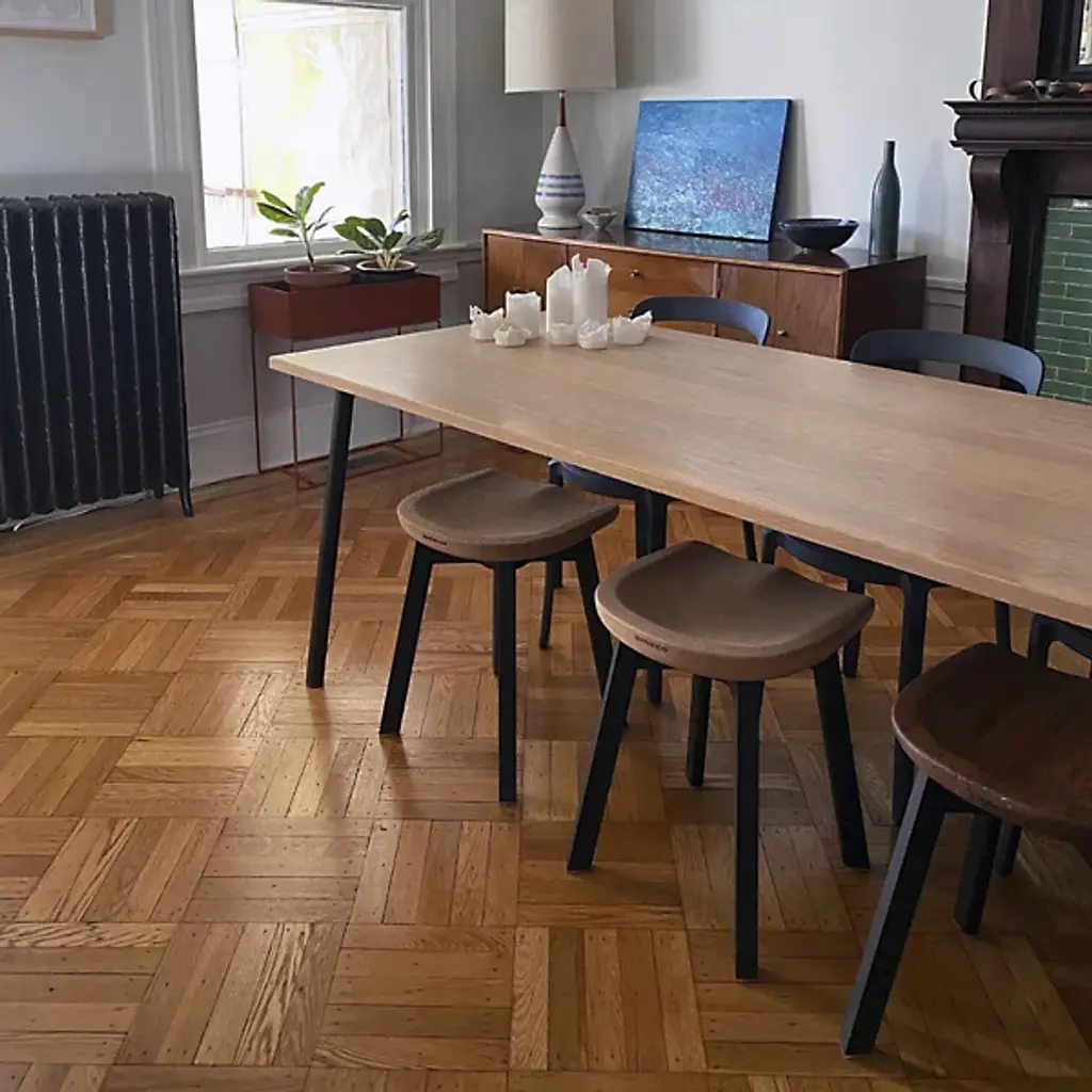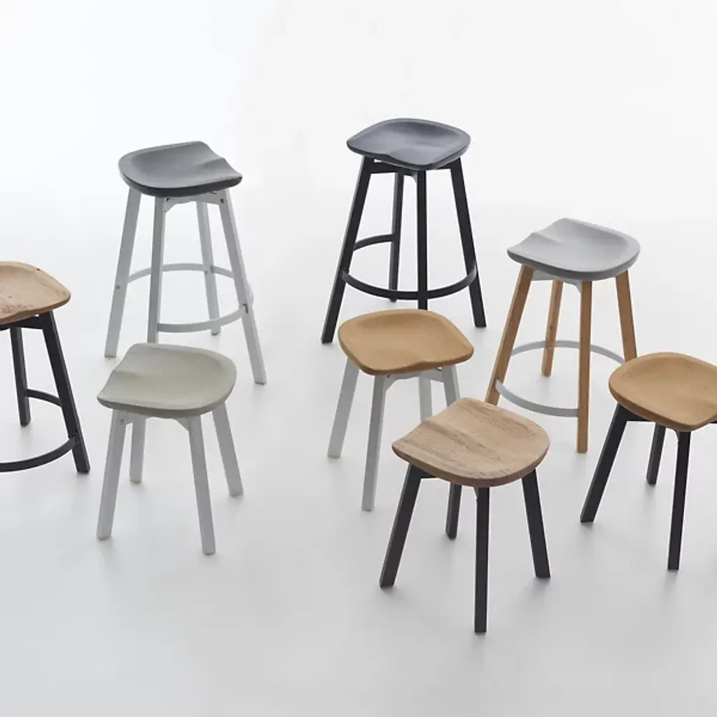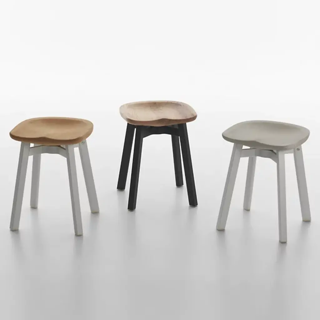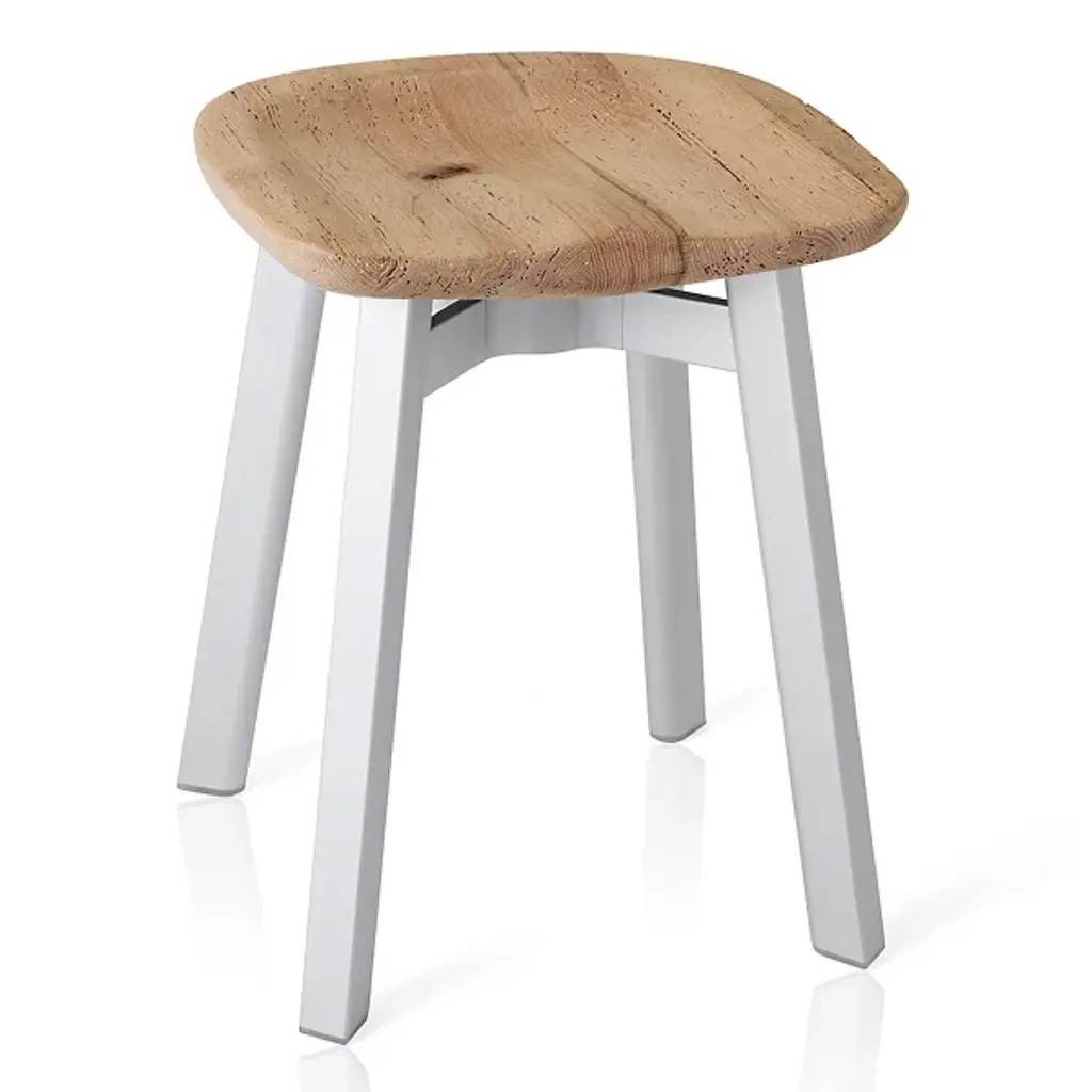 Emeco produced the Su Small Stool, Reclaimed Oak Seat in inspiration of the Japanese aesthetic 'su'. The application of su in Emeco's designs challenges them to engineer furnishings from traditional categories, with strong eco-conscious materials. From fruition to final production, Emeco has re-invented their historical recycled aluminum seating to carry refreshing characteristics, such as reclaimed oak. Su Small Stool, Reclaimed Oak Seat, a genius application of nature and industrial materials, blossoms in timeless environments.