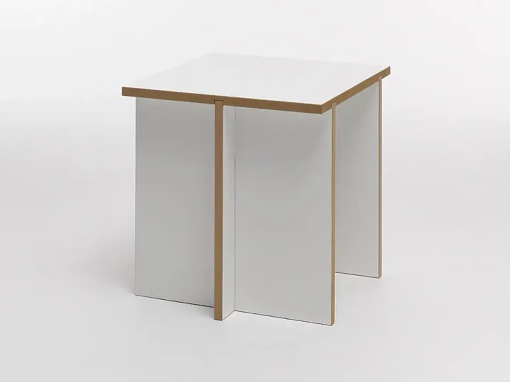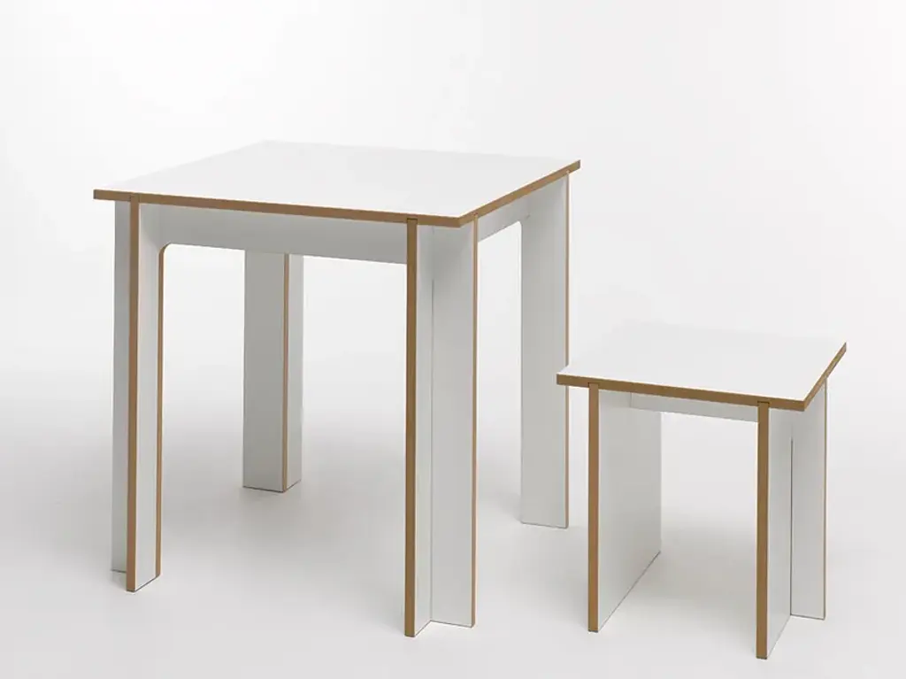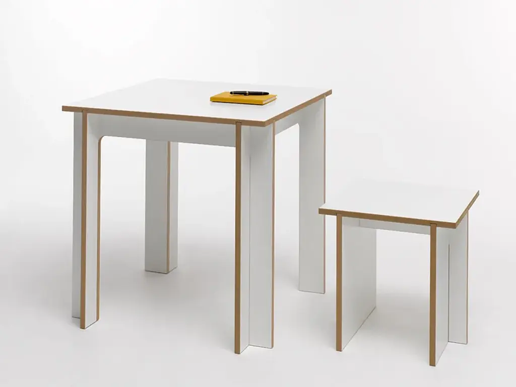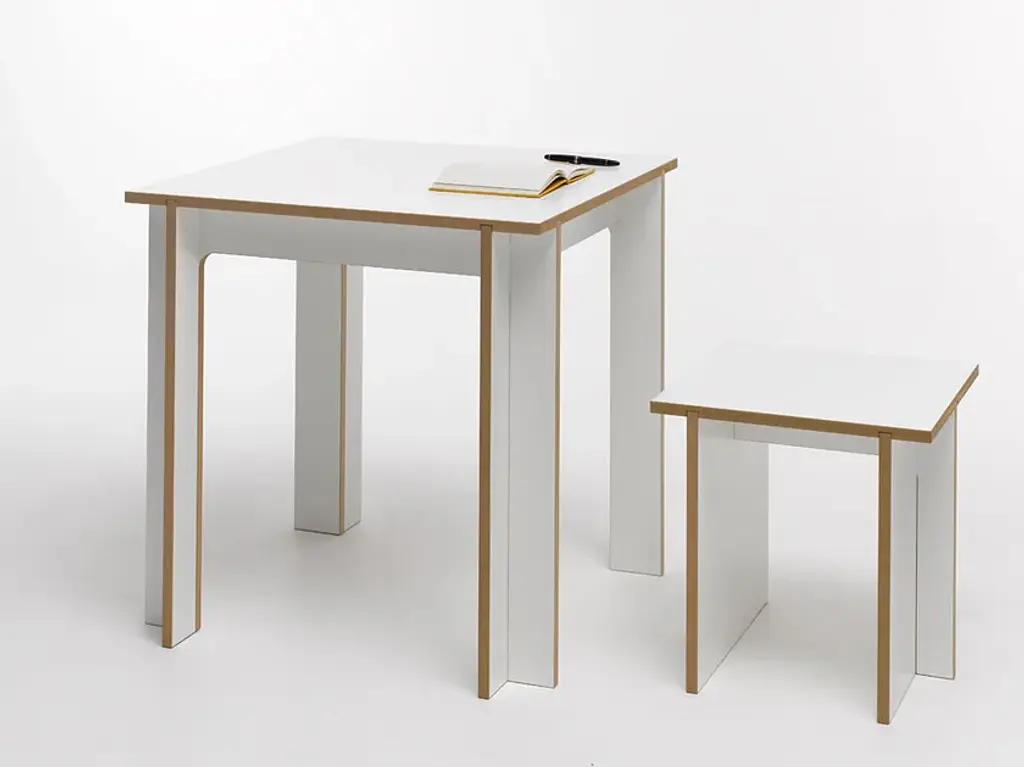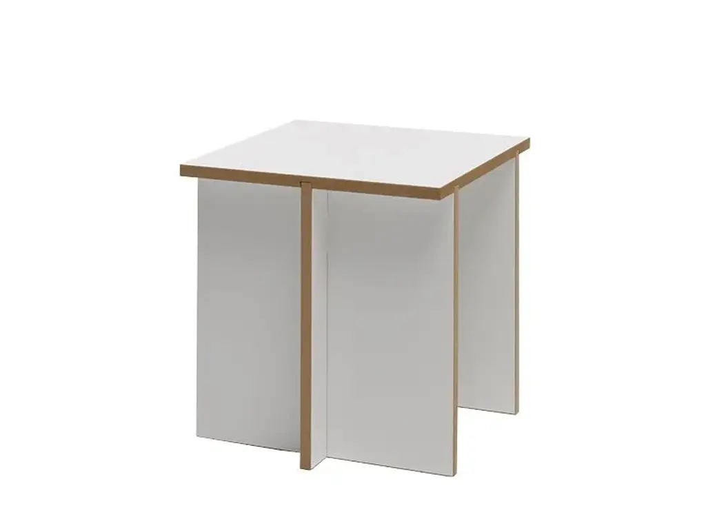 The detachable stool, consisting of only four individual parts,suitably to the table 59,1 x 29,5 inches and 29,5 x 29,5 inches. The stool can be plugged together simply and makes nevertheless a high stability possible of the construction. For the assembly no tools are needed. Folded up all components fit into a cardboard box. Material MDF melamin resin coated, whiteSize L. 17.7'' x W. 17.7'' x H. 17.7''