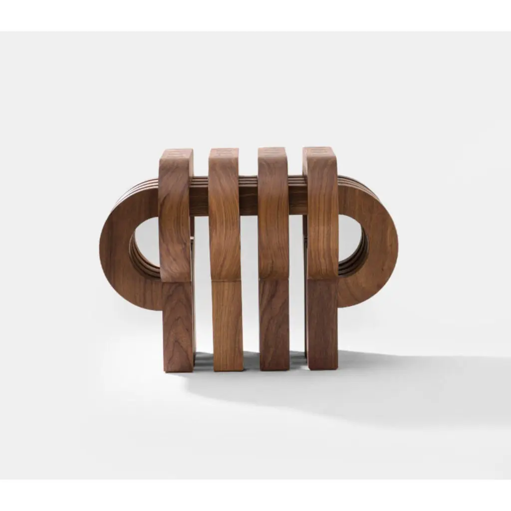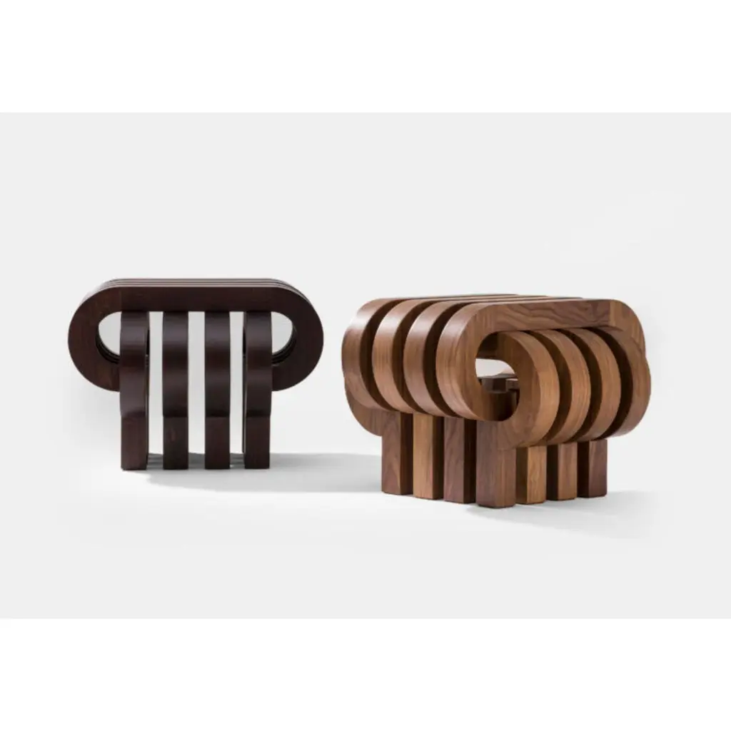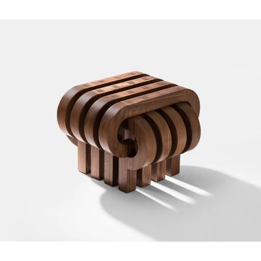 Tamga American Walnut Stool by Tolga SencerDimensions: D 55.5 x W 55.5 x H 40 cm.Materials: American walnut.Available in different wood options (massive american walnut, massive wenge, oak, afromosia or black lacquer with stainless steel details). Please contact us.Tamga Collection is based on a balance of filled and empty spaces composed by the repetition of a linear form in a harmonious rhythm. In this harmonious rhythm, change of dimensions leads to variations of the product. Rotation of this rhythm on a lower layer transforms into a powerful massive effect. Sculpturesque posture of Tamga shows how precise application of basic design principles result in strong, consistent and groundbreaking products. The name “Tamga” comes from the side view resembling the old Turkish tamga symbols.Tolga SencerA turkish interior and product designer, sencer creates furniture collections that ‘feel good’ and reflect his authentic, idiosyncratic aesthetic vocabulary. His process resists the reactionary drive towards instantaneous solutions in modern life, producing designs that take time to reveal themselves. With references to turkish antiquity, he designs linear, sculptural forms that evoke harmony. Combining stark modernity with nature and nostalgia, sencer’s furniture is a unique expression of his personal perspective and is rooted in artisanal production techniques.After graduating from bilkent university with a degree in interior architecture and environmental design, sencer moved to istanbul, where he worked in turkey’s leading architectural firms as an interior designer and project director before founding his own design studio.