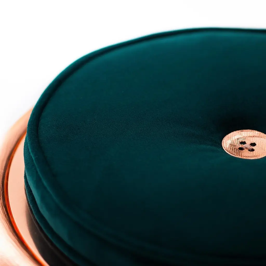 Exuding a refined and sophisticated allure, this stool features a cork shape (from which it takes its name) made of a shiny, brushed copper, and a soft navy blue velvet seat. This original and plush design can also be used as a practical and decorative occasional table, a box or a champagne bucket.