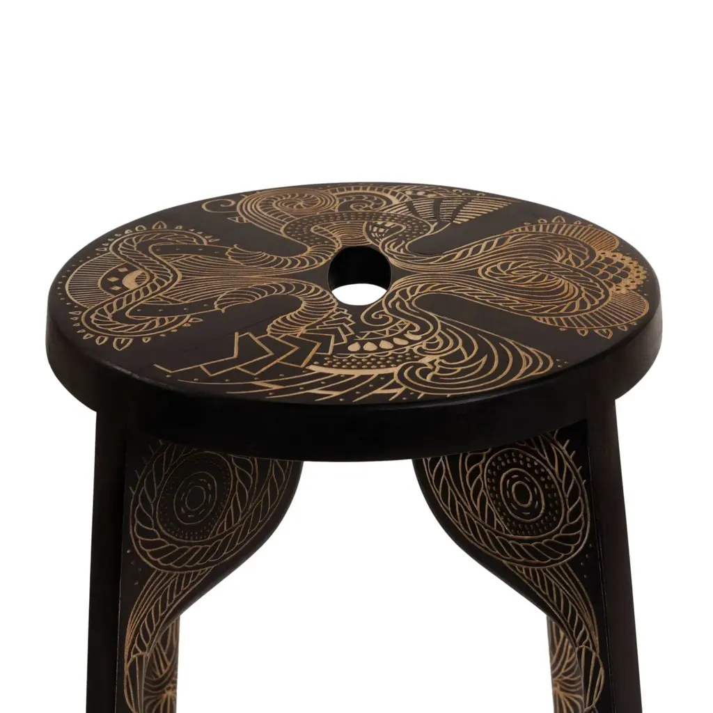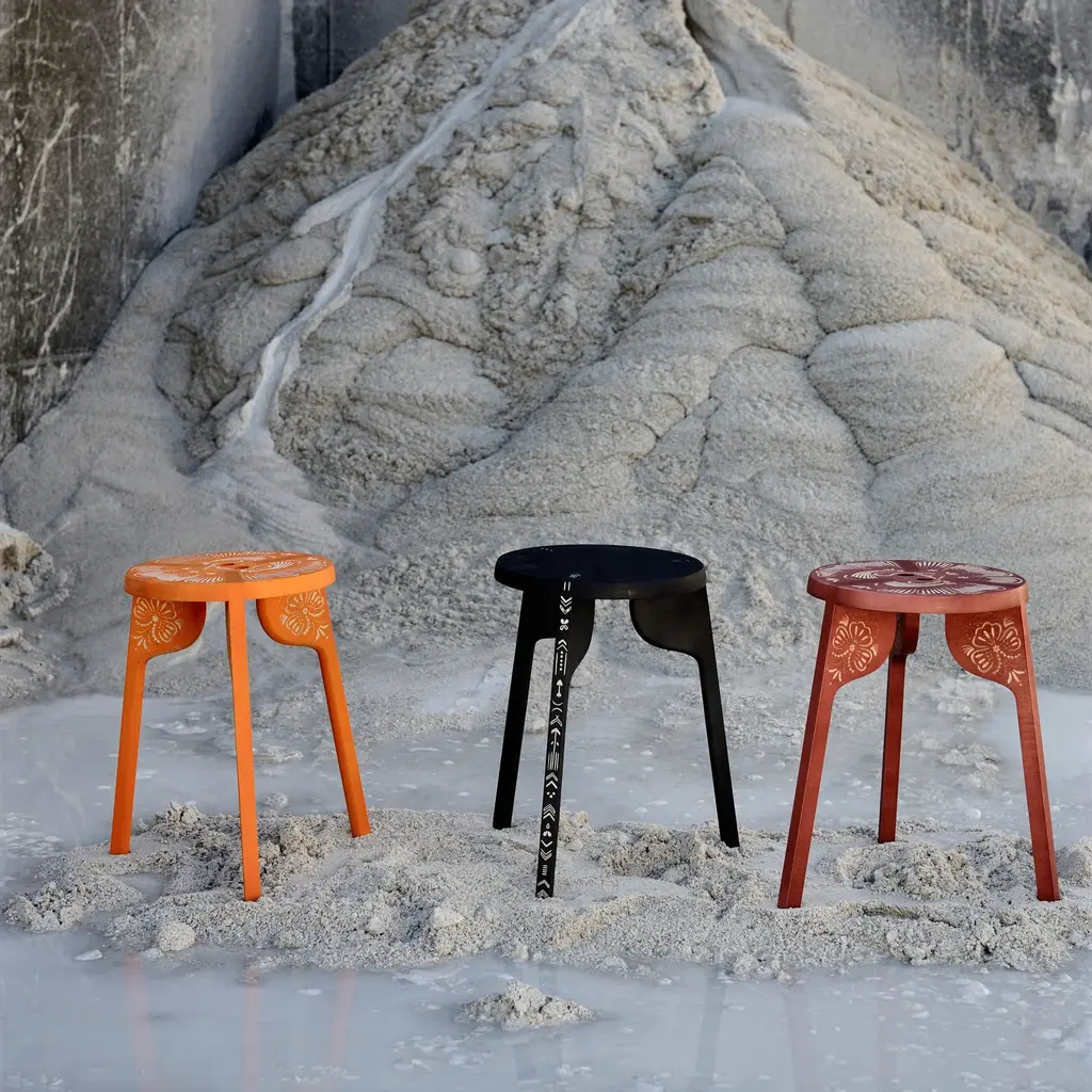 Imaginatively "inking" its solid-wood form by employing traditional Bosnian carving skills, Tattoo Stool offers a playful range of hand-chiseled patterns. Zanat's artisan heritage, cited for cultural preservation by UNESCO, carries through a range of sustainably sourced woods and surface motifs—allover Fullbody and Folk versions or Sleeve and Perla variations that run down the legs. In 3- or 4-legged models, the seat holes add to the stable and stackable stool’s character and allow for easy carrying.