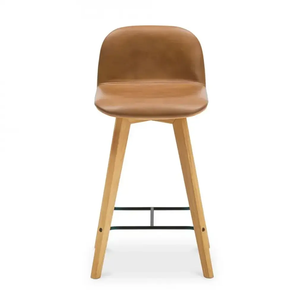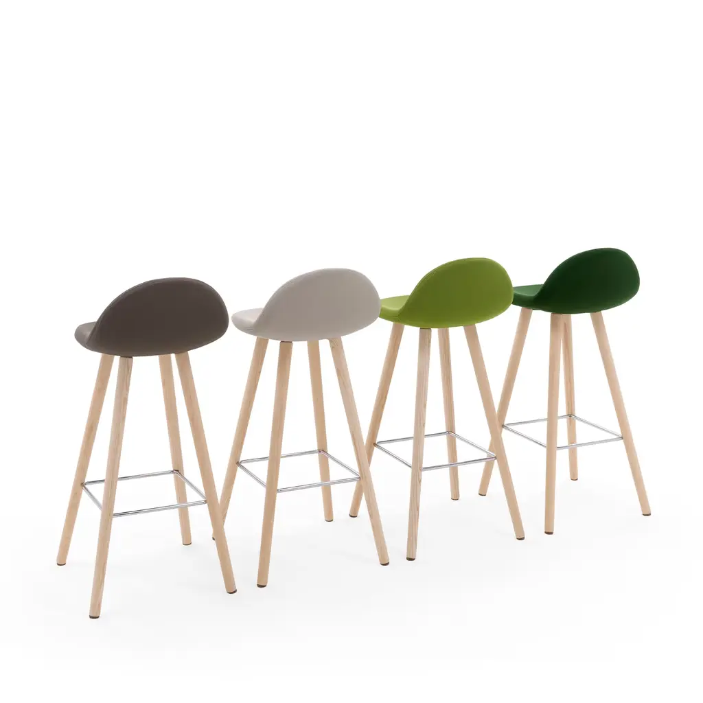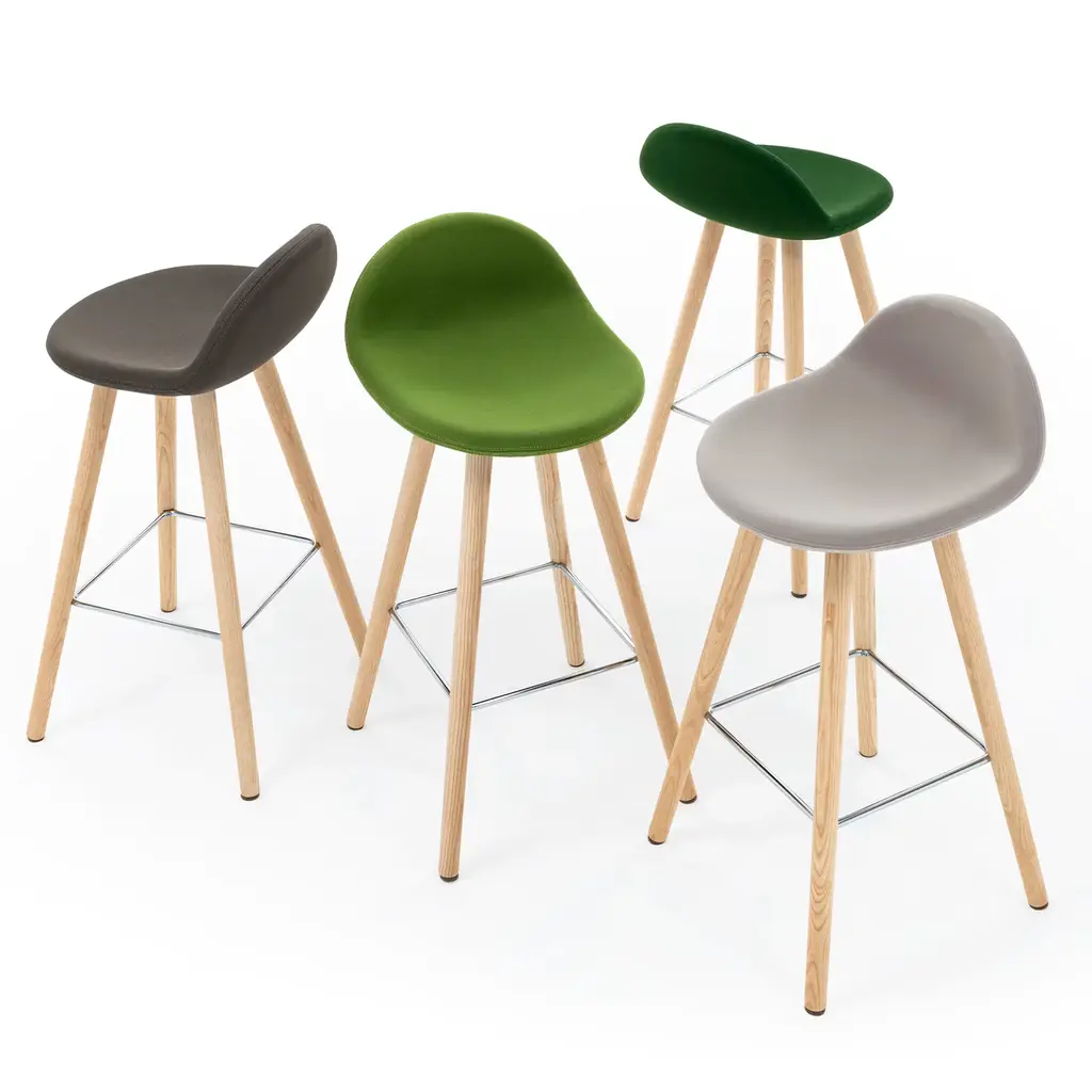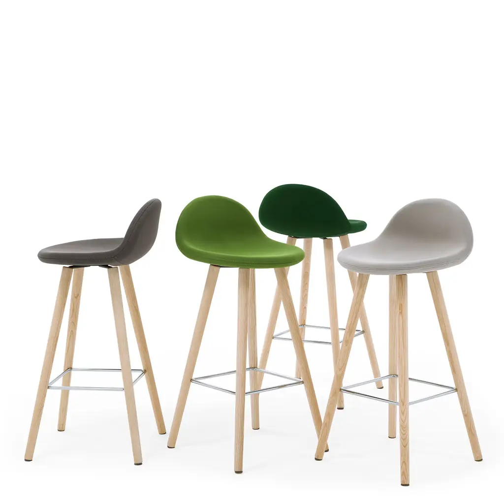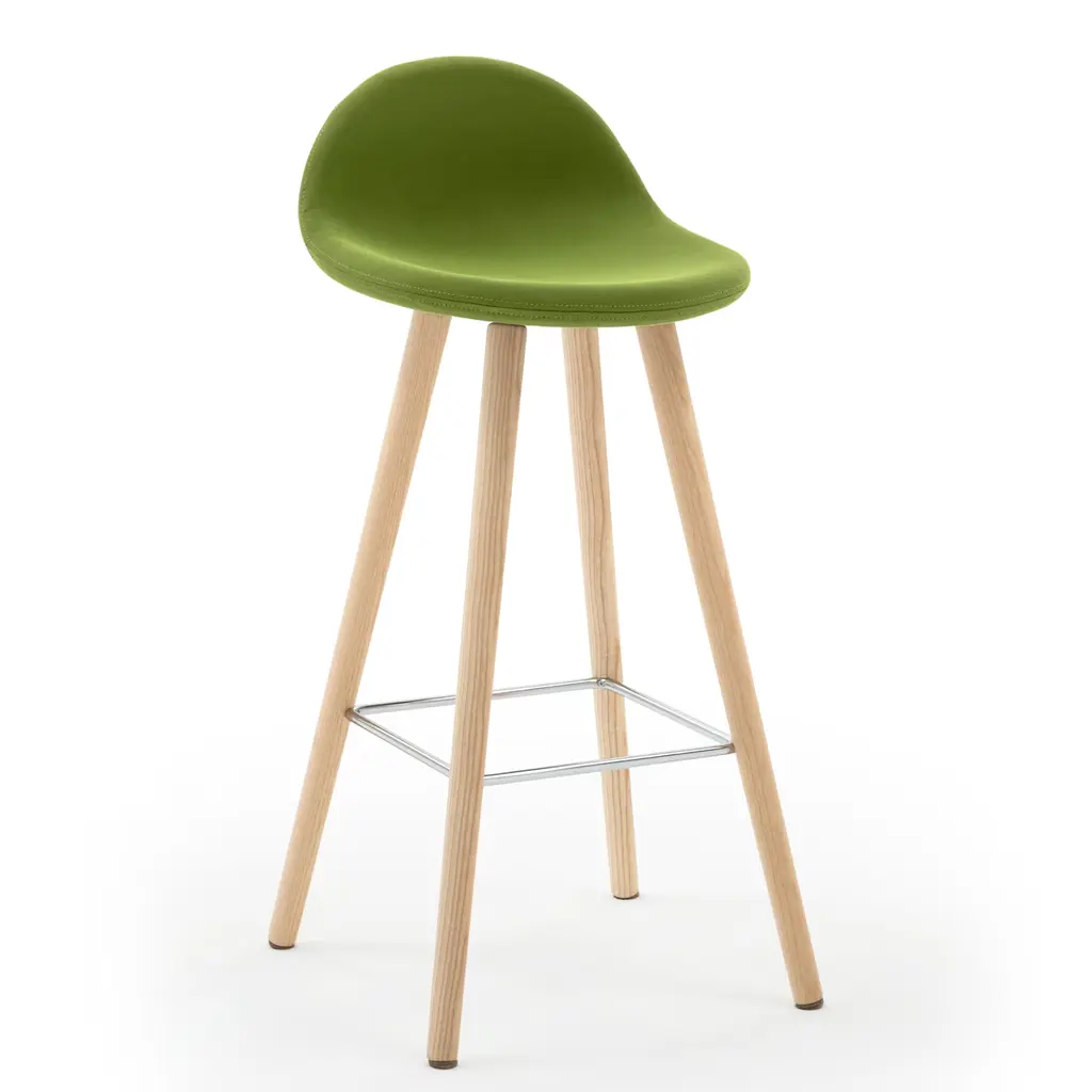 The sleek and fresh design of this contemporary-style stool emerges from the slender natural ash legs and gentle curves outlining the padded seat. Wrapped in fireproof pea-green fabric for a comfortable and safe seating experience, it is completed by a chromed steel rod footrest. Please consult the Concierge for available customization options.