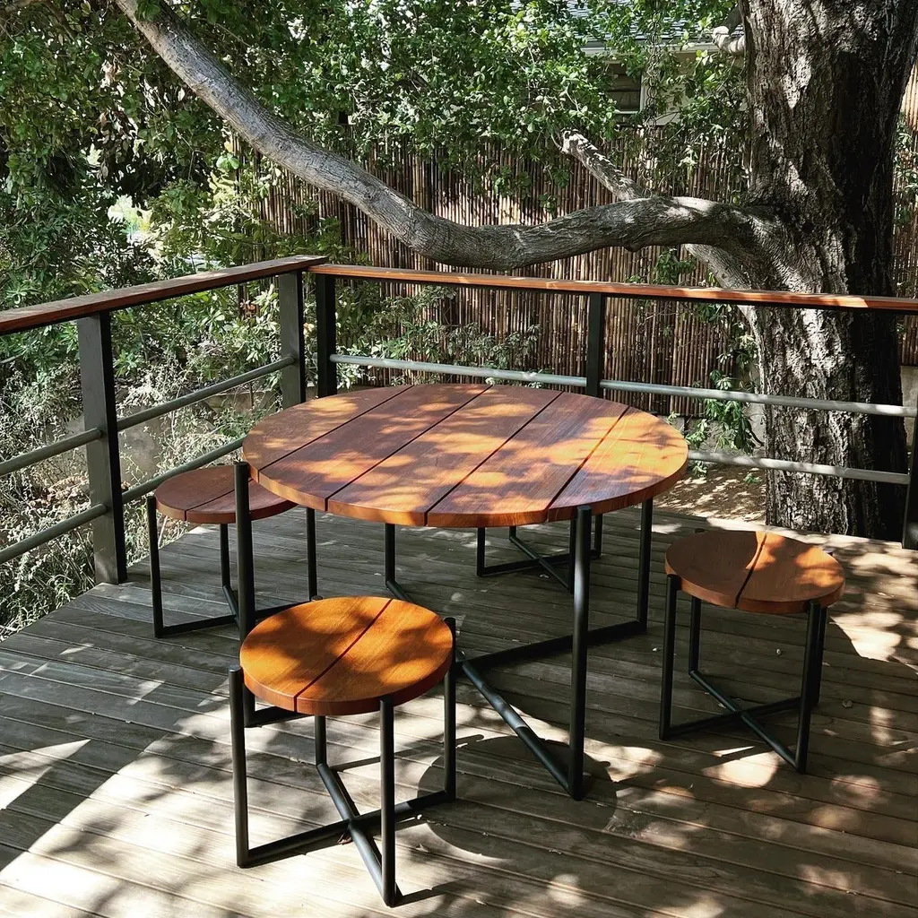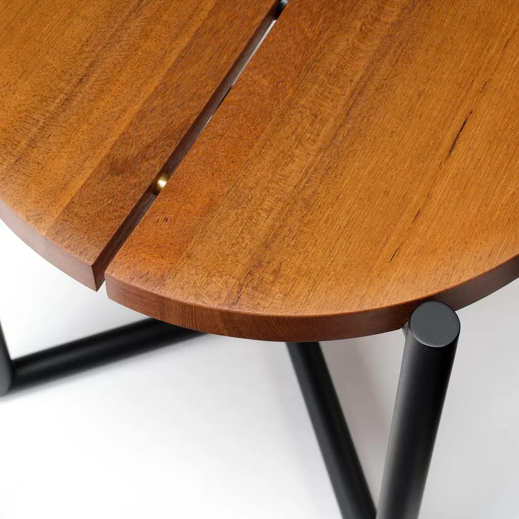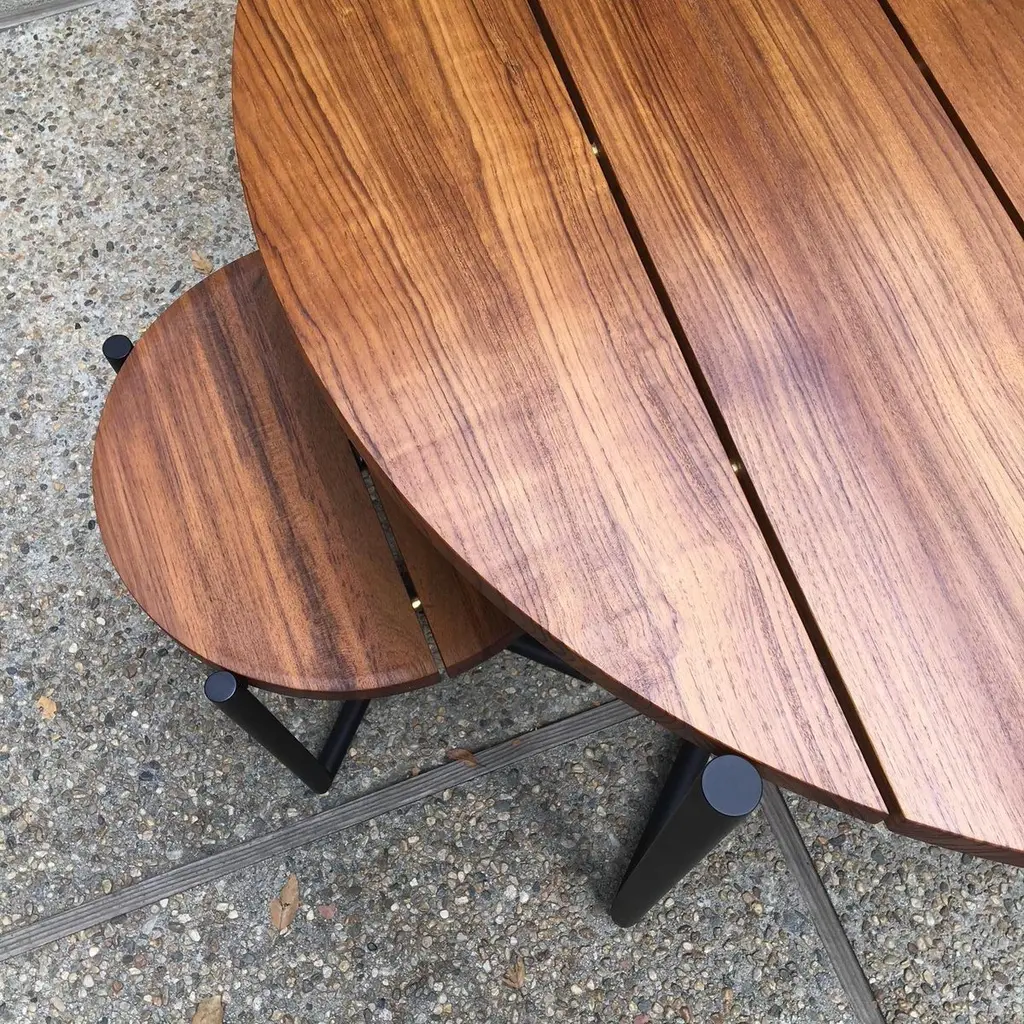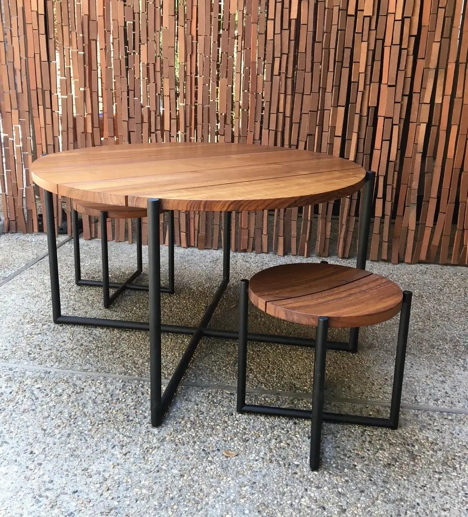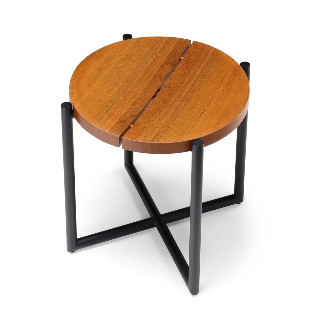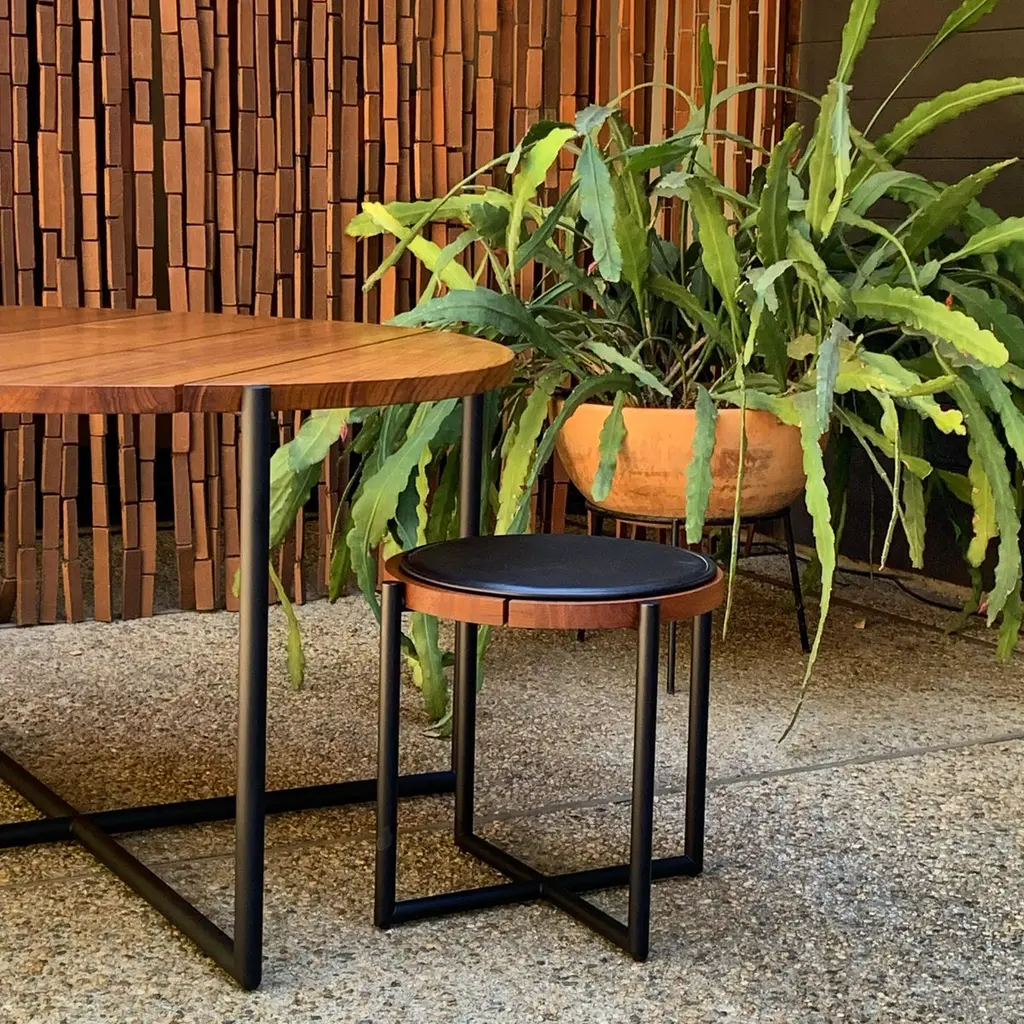 This stool is part of the Madeira Line from Ten10. There are 4 in stock, available for purchase from 1 to 4 pieces. The top is solid plank oiled teak 1 1/4" thick with brass dowels. The base is powder-coated stainless steel. Brass dowels separate the planks. The overall measurements are 17" diameter x 18" high. The stool is suitable for indoor or outdoor use. In regards to materials, the top is also available in vertical grain western red cedar. The base is stainless steel powder coated in a semi gloss black color (as shown in photos). We can also offer a matte black, oil rubbed bronze, or green color powder coat. Please inquire if you prefer another color. The seat is slightly concave. Optional cushions are available for an additional cost.