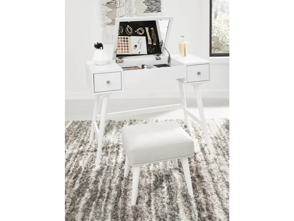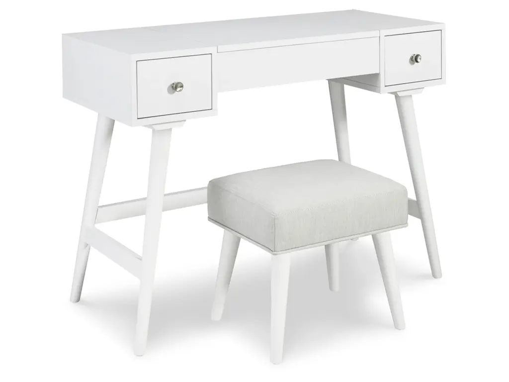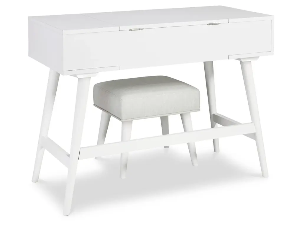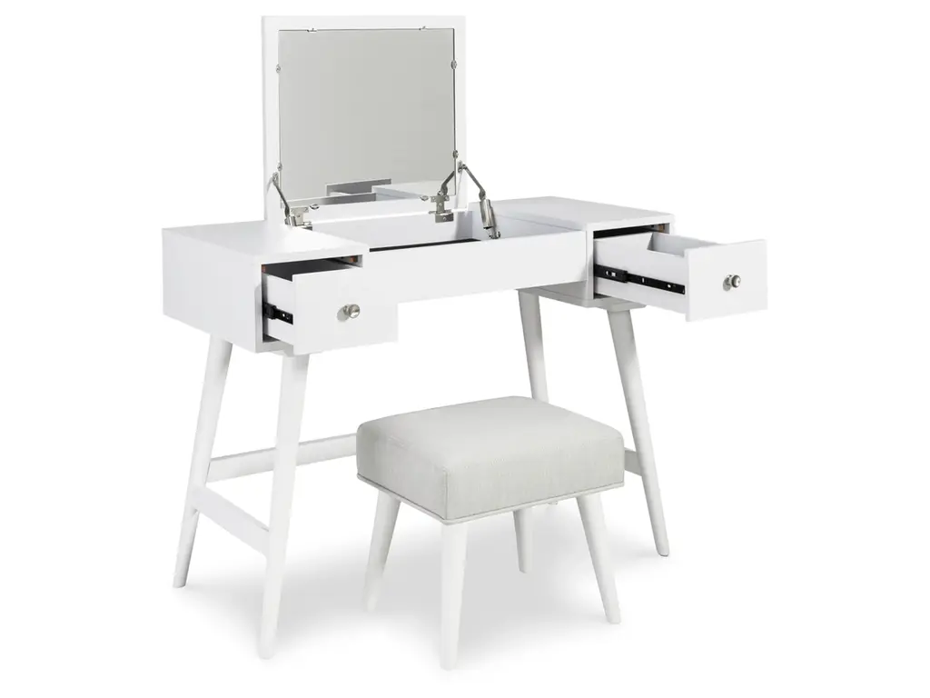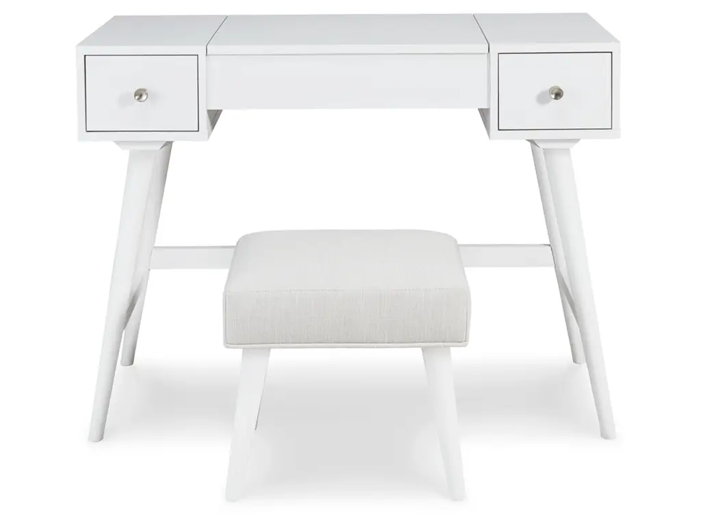 Whether in a teen’s room, master bedroom or dressing area, the mid-century inspired design of the Thadamere vanity set in white is packed with possibilities. The flip-top design makes it doubly handy as a vanity or writing table; flip it up for access to hidden storage and a mirror, and flip down for a flat work surface. Two smooth-gliding drawers offer additional storage for makeup and beauty essentials, while the sumptuously upholstered seat makes the experience complete.