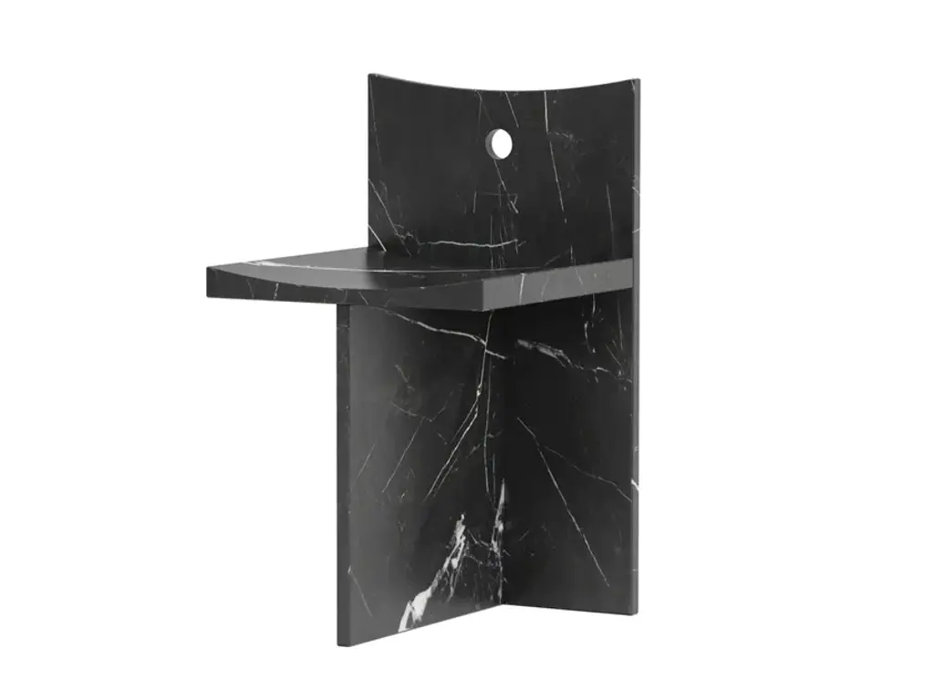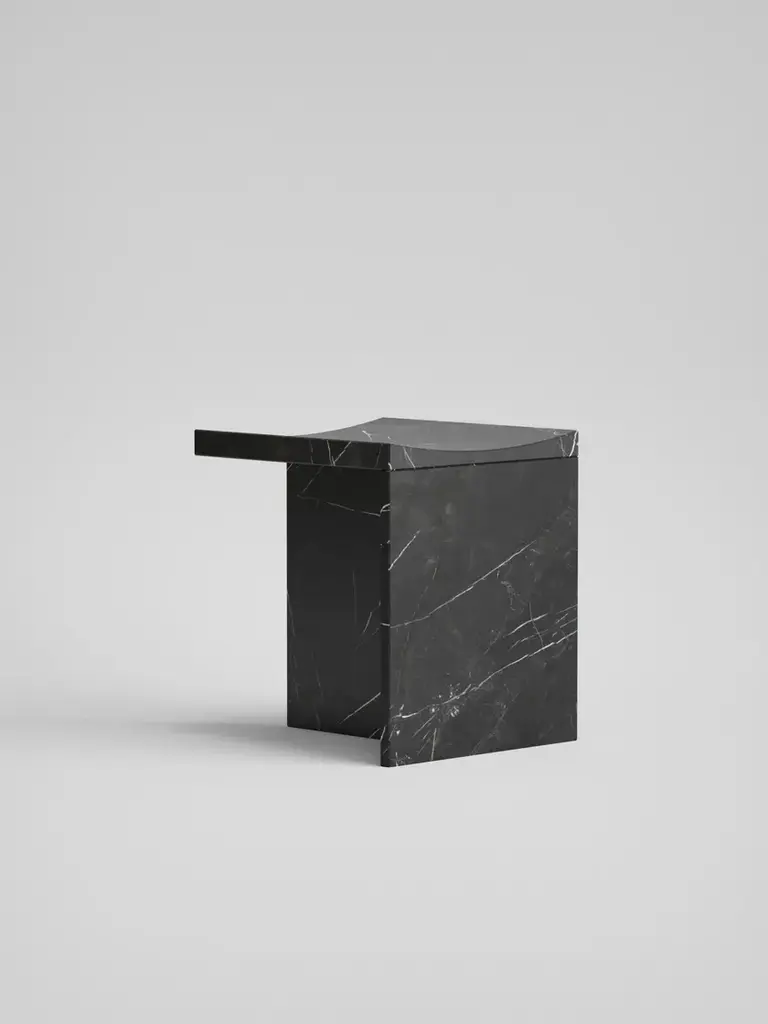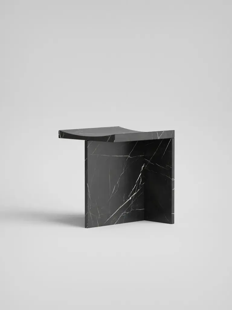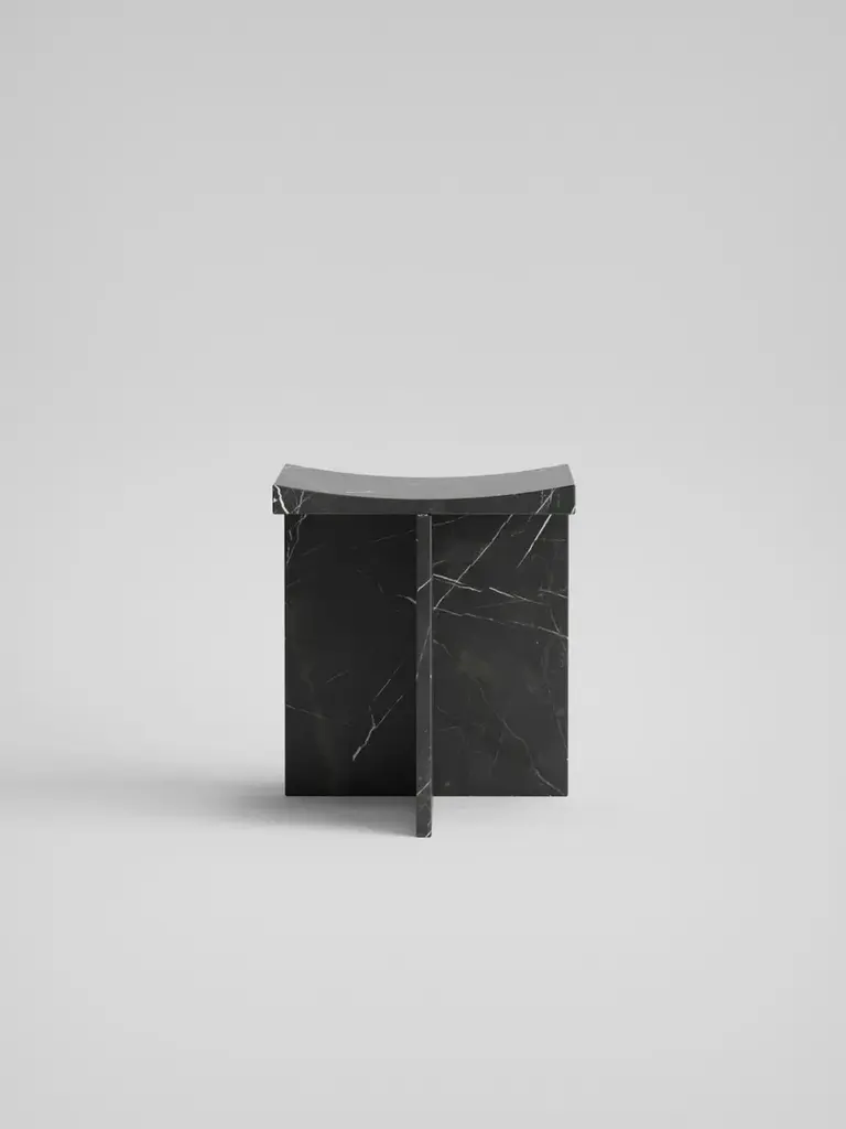 The "Thebes" stool in Nero Marquina marble is a perfect fusion of past and present.This stool embodies the essence of Italian marble craftsmanship and modern machine carving.Designers McGannon Saad wanted to emphasize the intrinsic qualities of marble as a material, to have it interpreted and worked by Pistore Marmi, renowned for its mastery in working natural stone since the 1960s in the Veneto region of Italy.The monolithic form showcases the pure beauty of each stone's metamorphosis, creating poetic textures and stories.With a curved seat for comfort, it draws inspiration from objects of the archaic period, hence the name Thebes.The durability of stone makes it ideal for both indoor and outdoor use, integrating effortlessly into contemporary spaces. It is available in two versions-a low-back chair and a stool-with finishes inRosso Verona, Travertino, Bianco Carrara or Nero Marquina.