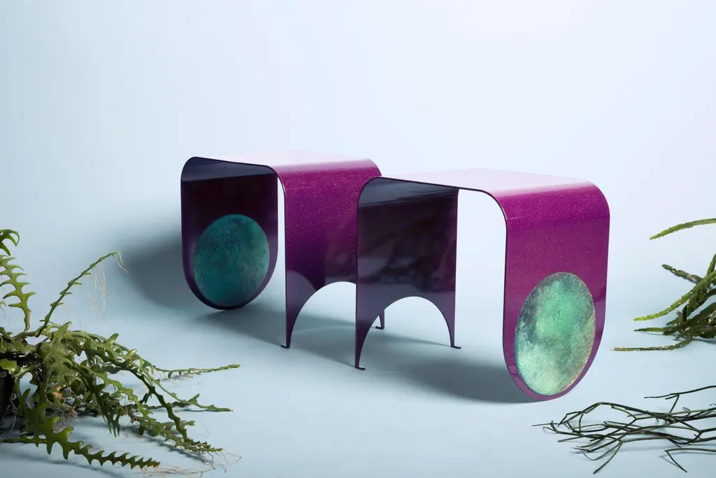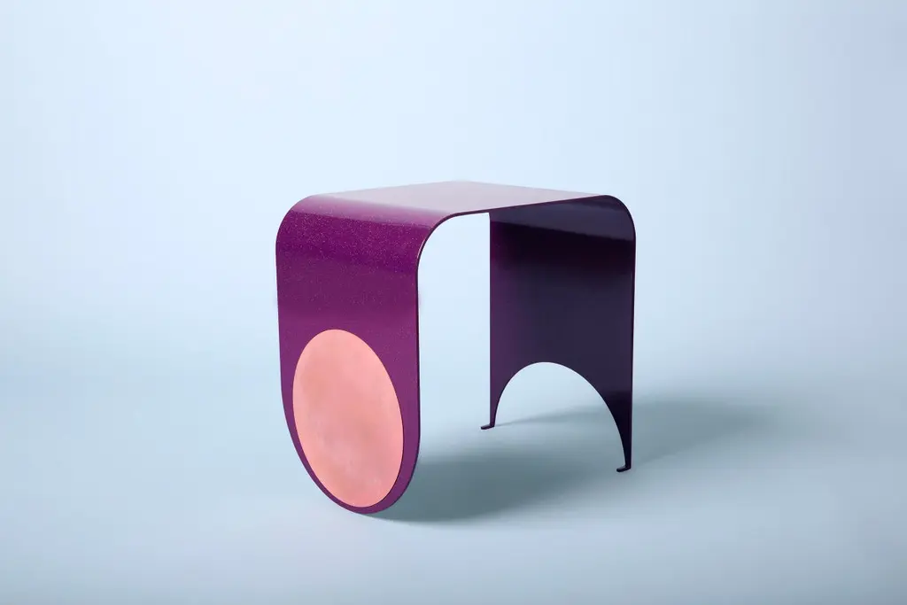 Like a tiny creature bending over, brushing her toes on the floor, the Thin stools challenge our notion of strength, urging viewers to ask, Will this support me? At times minimalist and others quite playful, each razor-thin piece is a continuous steel plate that responds to the sitter’s body. The newest iteration of their successful Thin Series, the stool adds layers of intrigue and whimsy with its shimmering purple finish and rich patina.