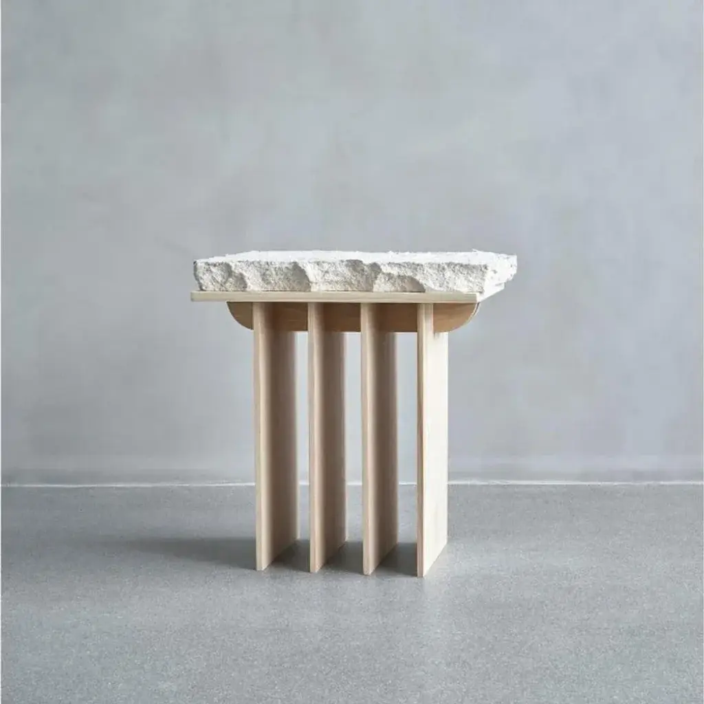 Thinking space side table and stool by Andredottir & Bobek Dimensions: W 47 x D 32 x H 50 cm Materials: Ash wood and reused foam/mattress and jesmontite hardner in color white ang green fade. Our work aims to encourage art and design as symbiotic disciplines, giving us as performers free rein to go beyond our professional background and develop a new and experimental art and design language together. We are curious about the borderland between art and design and are focused on the definition and use of the objects we surround ourselves with daily. Our artworks focus on material study, design language, object, and function. We believe that our work can contribute to society and raise social awareness of material research in design, art, and architecture. We believe that our work can contribute to engaging artworks that create less waste and focus on high quality and sustainability in objects. We believe that our works can push ourselves and others to question the definition of objects by using modern material research in hand-built shapes and structures. We see ourselves as an art and design generation of material researchers. Our works aim to explore how objects and materials are used today in products and how we can cross the borders and use materials to their full potential.