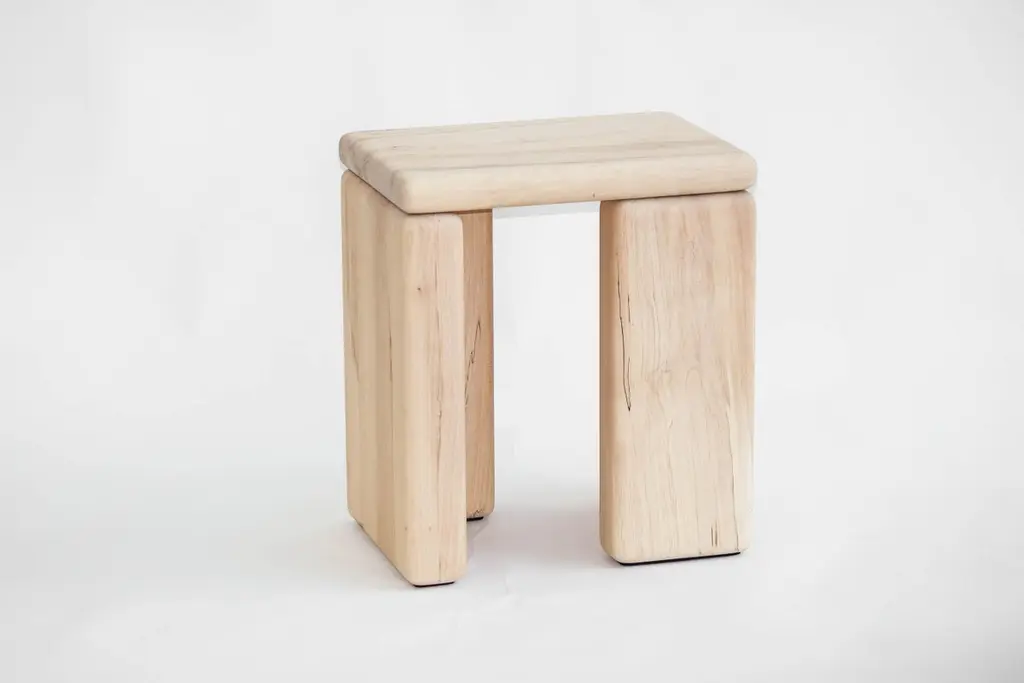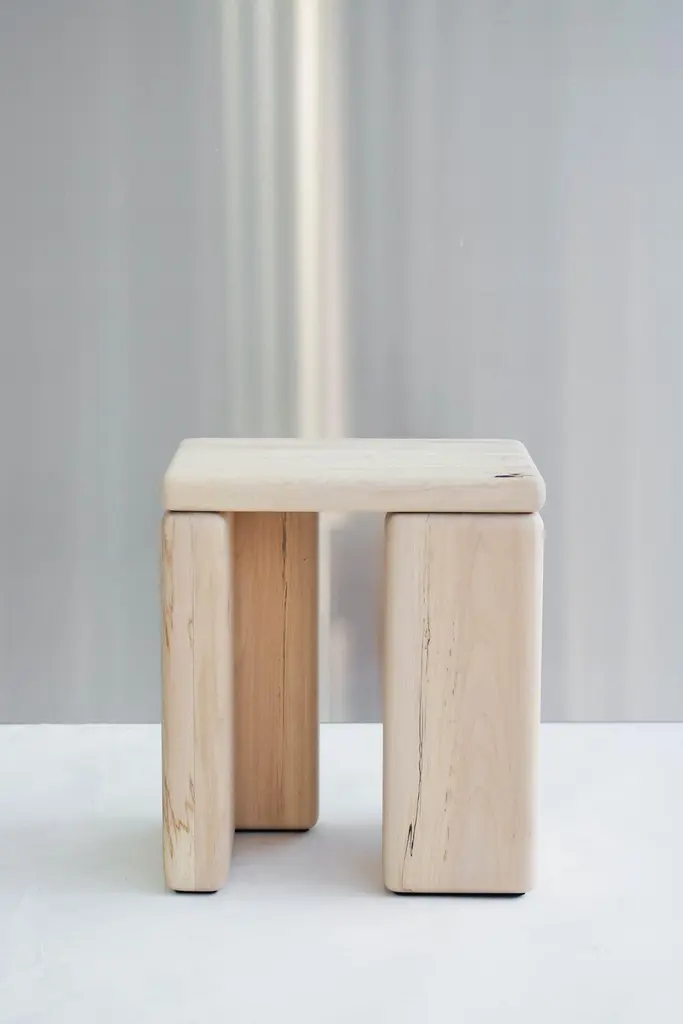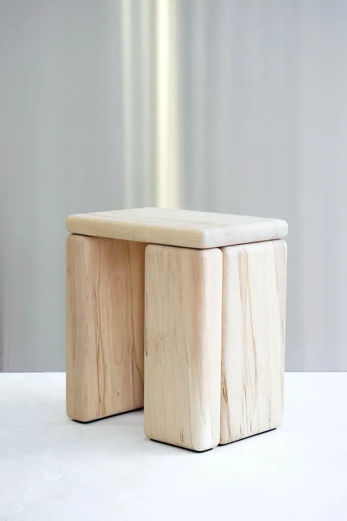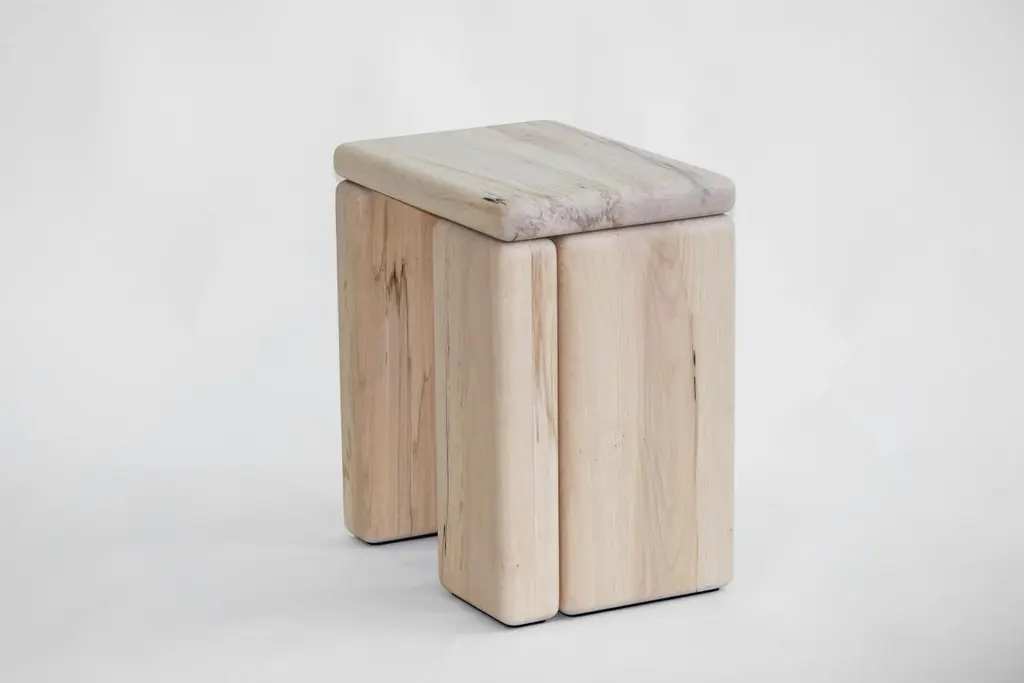 Timber Stool Maple by Onno AdriaanseSigned and numberedDimensions: D 40 x W 29 x H 45 cmMaterials: Maple wood, clear matte coatingAlso available in Color: Indigo blue, purple-red, uncolored wood, Maple, Burned Pine. More colors on request. By stacking solid wood blocks and rounding all corners, a minimalistic design is created in which the wood grains are accentuated. The use of this large-sized construction beams creates voluminous furniture with a distinctive appearance.Studio Onno Adriaanse is a Dutch design studio, based in Eindhoven and founded by Onno Adriaanse (1991). After being graduated from the Design Academy Eindhoven, the studio was founded in 2016.Studio Onno Adriaanse is a sculptural design studio making art installations and extraordinary pieces of furniture. Onno is working on the thin line between the functional aspect and the emotional experience that a design can create. His fascination for geological processes has great significance in the design of the objects. Many works are created by adopting shapes from the landscape, such as rock erosion by water or changing soil due to drought.