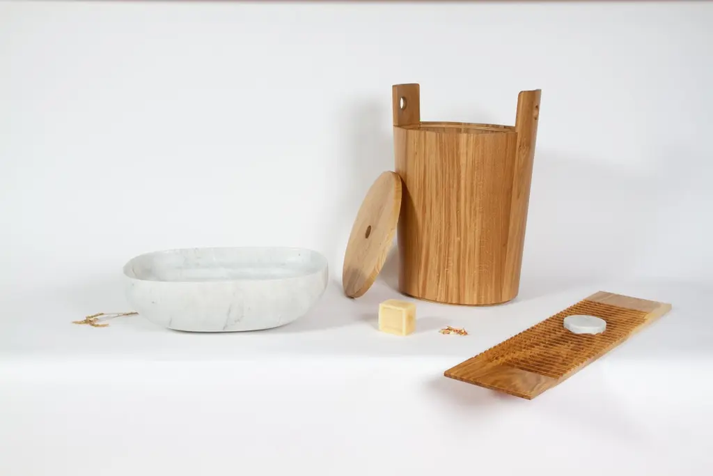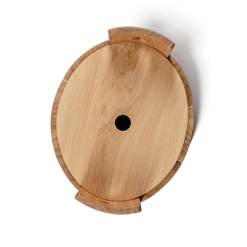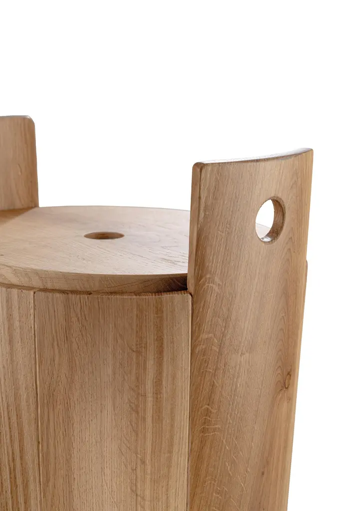 T4 BATHROOM FURNITURE COLLECTIONThe bathroom collection, which includes TOTO - washbasin, TINA - stool/container and TITO - bathtub shelf, was born from the memory of the nearest past. A time not long ago when ancient wash houses were vital hubs of small Mediterranean communities. The three elements play with characteristic signs, combining marble and wood. They are symbolic of toil and emotion, shaping three evocative forms inspired by the rural objects and architecture around which life moved. Tactile, sinuous and functional lines that transform research into objects that give us back the atmosphere and traces of territories that are part of our history, projected into the future.TINA - STOOL/CONTAINERA vat-inspired stool/container, TINA is a piece of furniture that speaks the language of its material, oak wood, and through this returns a decoration that follows the craftsmanship of the product and recalls its inspirational drive.Extra customizations available upon request.