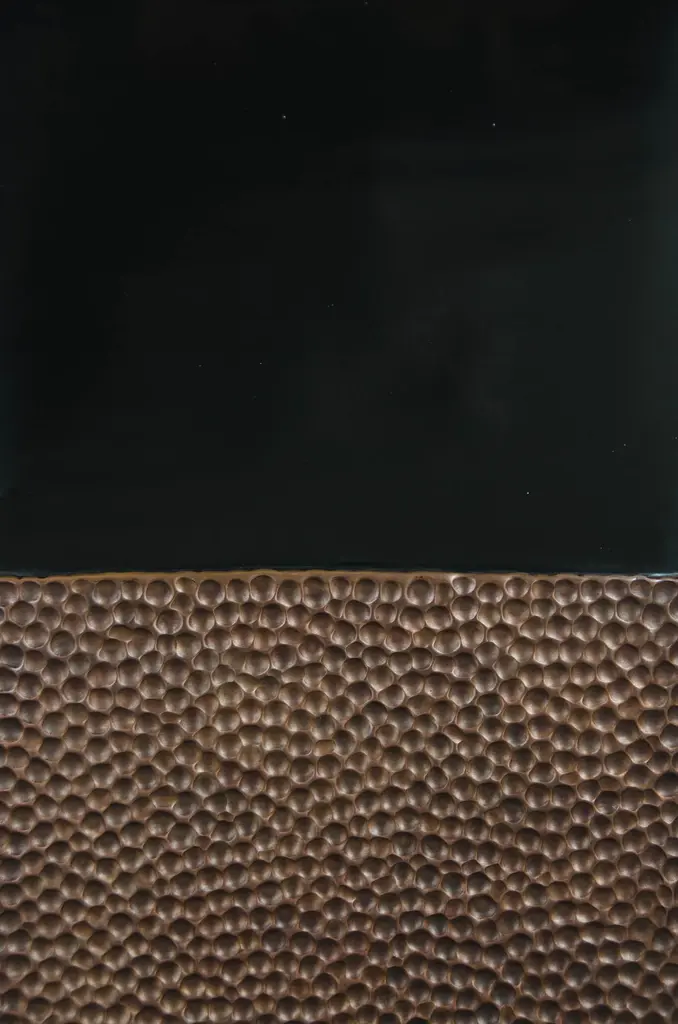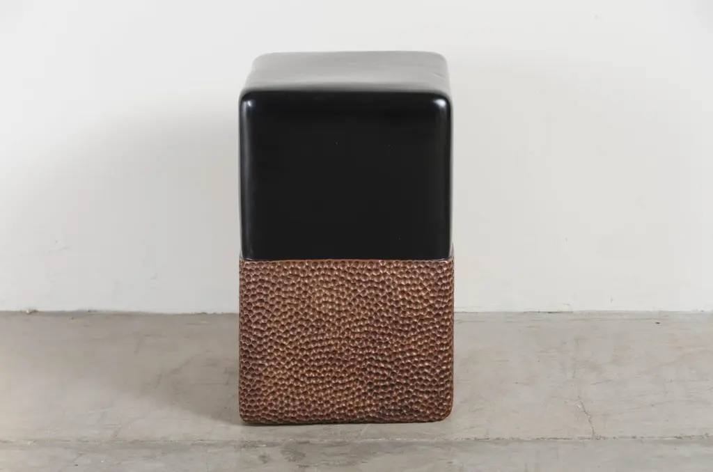 Toad skin block drumstoolBlack lacquerAntique copperHand repousseLimited EditionRepoussé is the traditional art of hand-hammering decorative relief onto sheet metal. The technique originated circa 800 BC between Asia and Europe and in Chinese historical context, it began early as the Han dynasty (206BC-AD220). The technique involves using a hammer and various shaping tools.Lacquer is a technique that dates back to the Shang dynasty, circa 1600-1100 B.C. These pieces are made with at least 60 coats of organic lacquer. Each layer of lacquer is applied with a curing period of 24 hours in between so that it can dry.