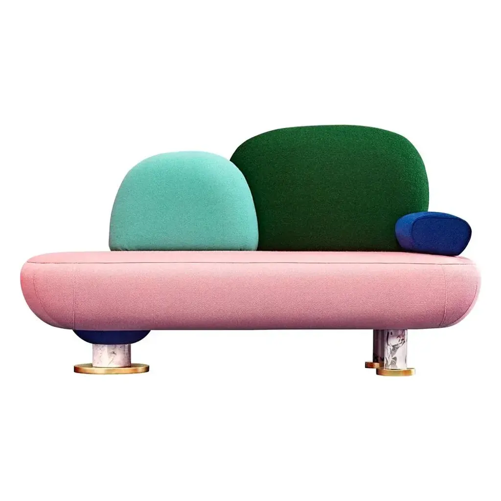 Toadstool collection sofa by Pepe Albargues Dimensions and materials: Dimensions: 88 x 160 x 75 cm Materials: Beech, pine and particles board wooden frame. Fibre coated, polyurethane 3542 seat. Fiberglass coated, HR22 polyurethane backrest. Two marble legs with golden plated iron base. One upholstered wood and marble leg, with golden-plated iron base. This collection of puffs, table and sofa bench designed by Masquespacio is inspired in the visual culture and graphic design always present one way or another in the creative consultancy projects. This piece is attributed to the mentioned designer/maker. It has no attribution mark and no official proof of authenticity, however it is well documented in design history. I take full responsibility for any authenticity issues arising from misattribution