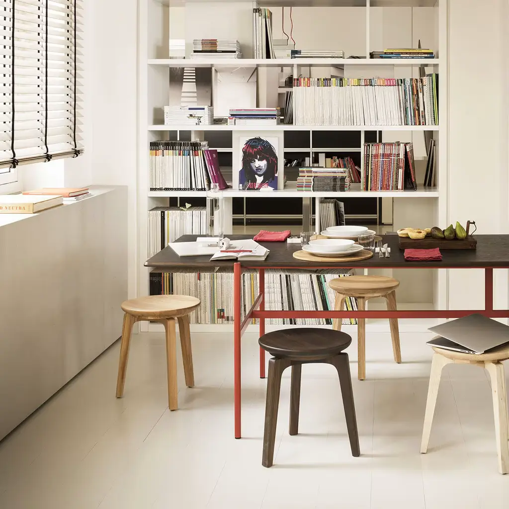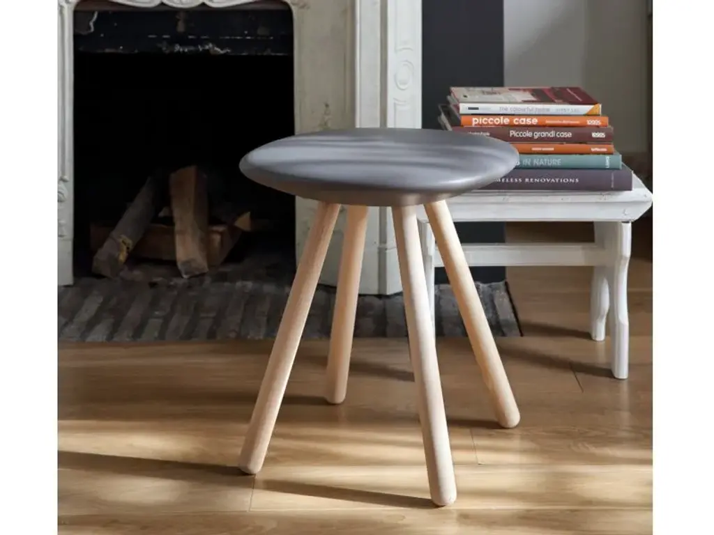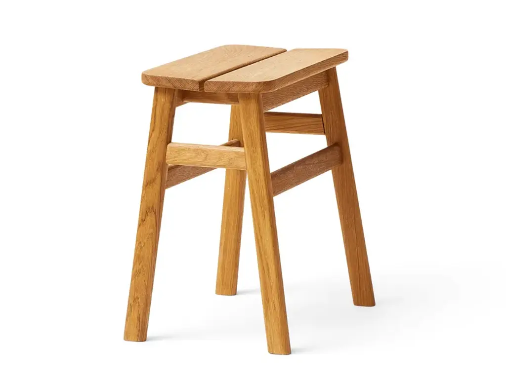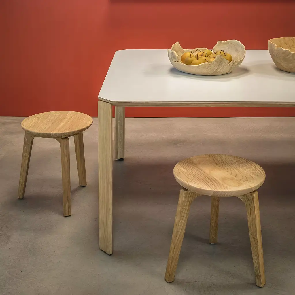 Elegant in its simplicity, this low stool is marked by a natural wooden finish showcasing elegant and fascinating grains. A modern interpretation of traditional and rustic wooden seats, it is entirely fashioned of solid ash, marked by a carved and shaped seat, and three legs mounted with a concealed interlocking system on the underside of the seat.