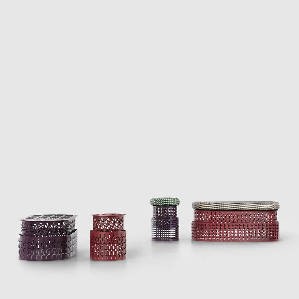 Used as a relaxing pouf or as a splendid coffee table, this red-lacquered pouf is exquisitely crafted of steel boasting a striking laser-cut work on the surface of the two cylindrical pieces making up its structure. This piece is customizable.