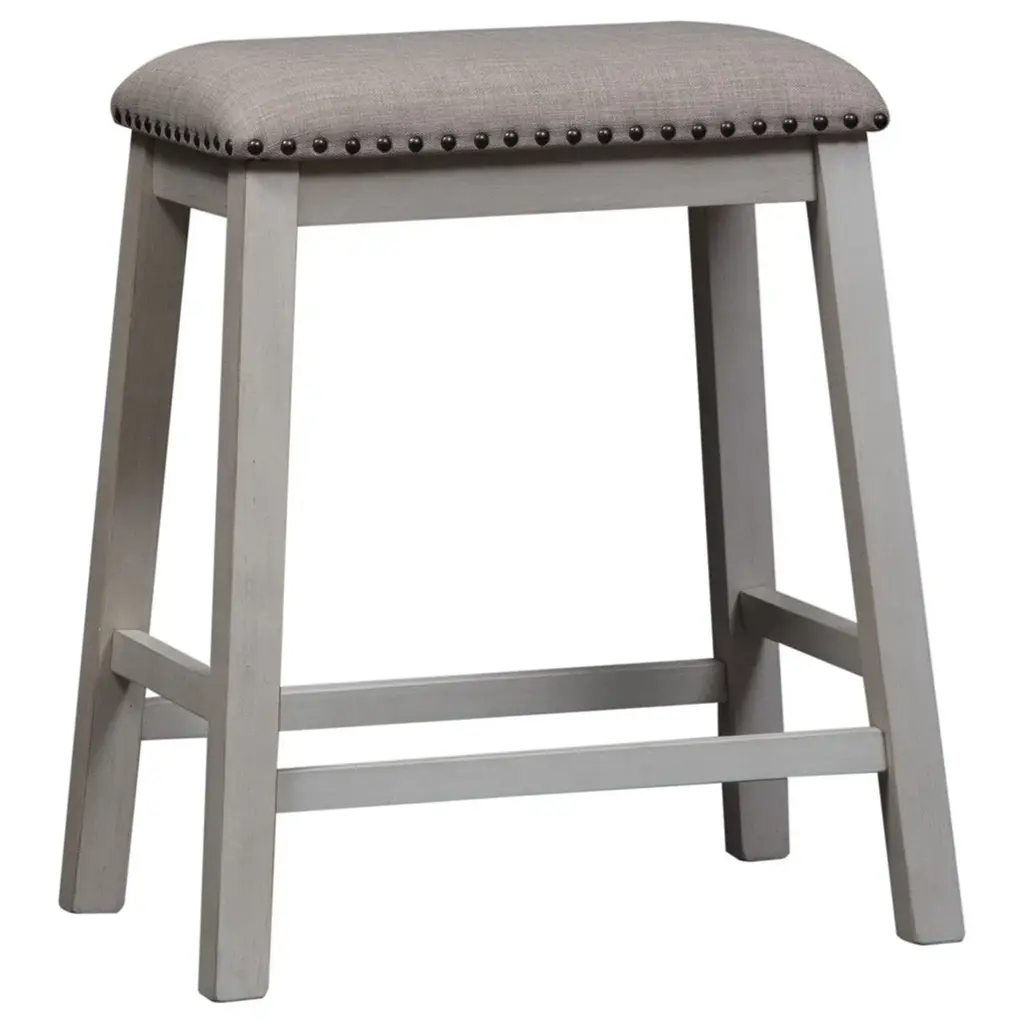 Bring a farmhouse style look to your kitchen with this stool and counter set. The kitchen counter features three shelves and clean lines for a homey look. Plus, the upholstered stools with brass nailhead accents complement its design beautifully.Counter Dimensions: W60" x D30" x H36"Stool Height: 25"