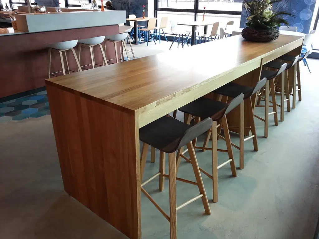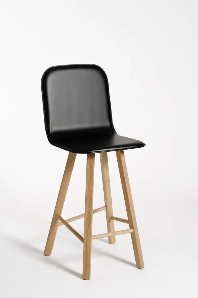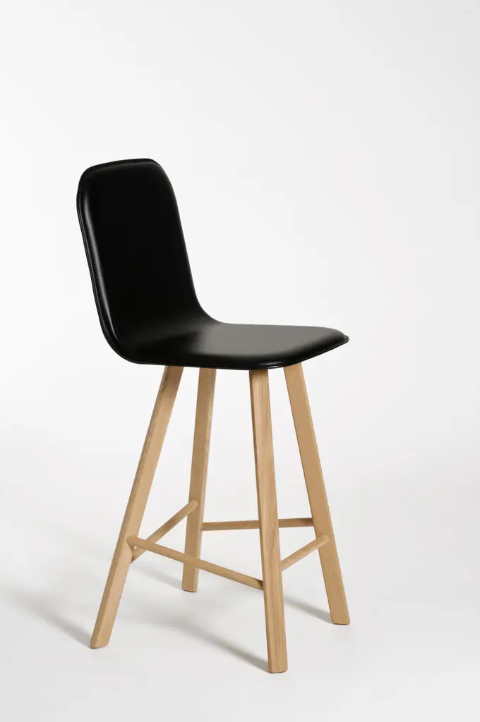 Essential and elegant stool with a bent plywood shell (High Back as listed, for a very comfortable long time seating, or Low Back). and four iconic legs with triangular shape in solid oak, joined by transversal wooden bars. The shell is wood veneered (natural oak or stained open pore in the colors black, white, red, coffee), or upholstered. Fabric lining: C.O.M fabric; cotton, mix cotton-linen; felt, wool; velvet, leather. Legs can follows the finishing of the shel or upon request remain in natural oak. It is also possible to chose for the seat, the typical kitchen height 67 cm or the bar height 77 cm.