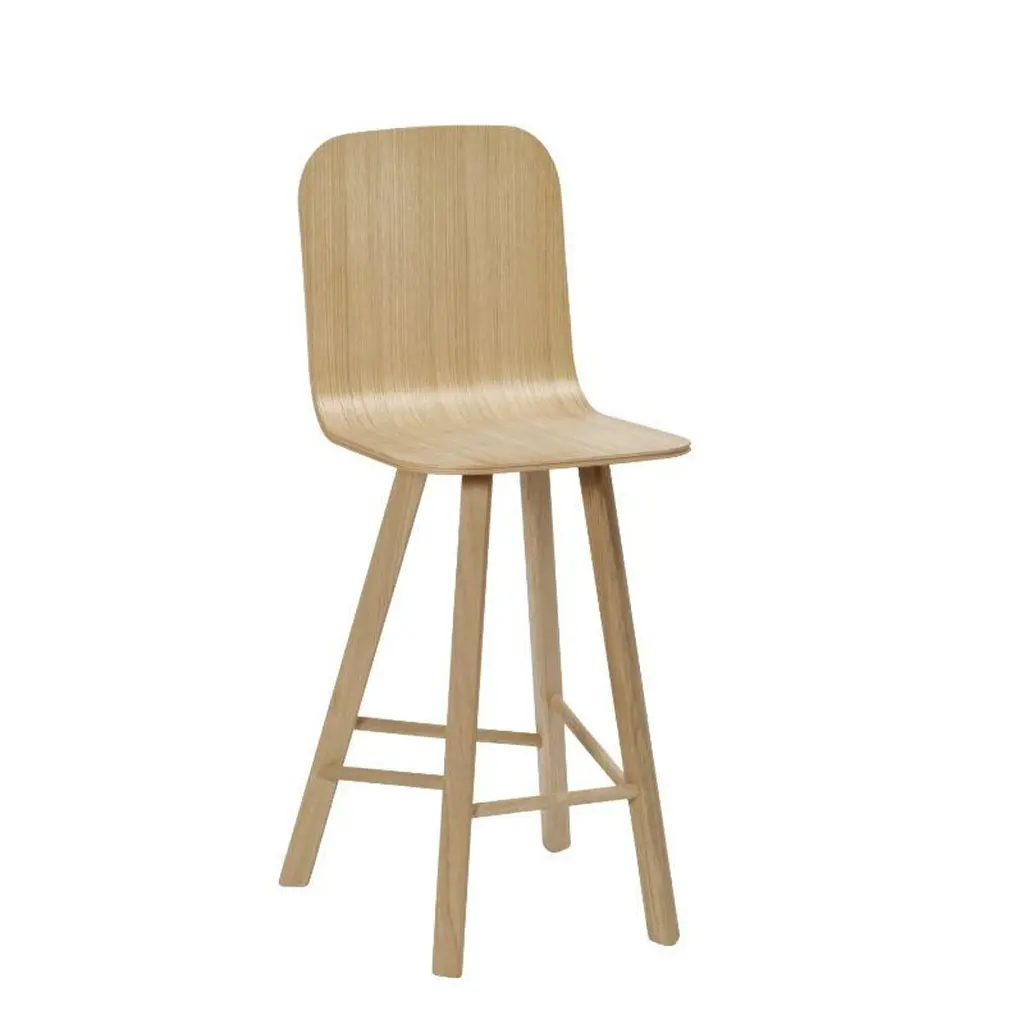 Tria stool, high back, oak contour by Colé Italia with Lorenz & Kaz Dimensions: H.seat 67/77 (H.105/115) x D.52 x W.48 cmMaterials: plywood stool with high back, solid oak wood 4 legsAlso available: tria stool upholstered, low back,TC: C.O.M. fabric - send us your own materialCA: Cat A - Angel (polypropylene), Ganesha (synt. leather), Nord Wool (felt)CB: Cat B - Tiffany (polyestere), Lana (aquaclean)CC: Cat C - Velvetforthy (Velvet), Topia (wool), Novum (Wool), Opera (felt)CP: Cat P - Milano (full grain leather) Our iconic chair designed by German duo Lorenz + Kaz. Tria is a table chair, at the same time many people place it asa sculpture, as ornament in an entrance, a bedroom or in a living room. It recalls the impossible forms of Dutch graphicartist and engraver Maurits Escher, defining itself in a game of twists and elusive leak. The corolla-shaped shell can beused in two different seating positions, center or side, in this case with one armrest. The shell is composed of three equal elements in bent plywood assembled together and veneered with a special wood finishing ivory/ black stripes.It is also available in veneered oak, natural or stained open pore in different colors, as well as customized colors (min. 4units). Available with 3 or 4 solid wood legs, or 4 metal legs in different finishings. For a better back comfort if you useTria chair in center position, for dining or studying, you can add a back cushion specially designed for it, upholsteredand coated with a wide range of fabrics.Colé is a young Italian design brand, with a high-end production 100% made in Italy. Born from the experience of Matteo De Ponti, architect, who grew up in one of the most outstanding Milanese design families, and the artistic sensibility of Laura Macagno, degree in Economics and passionate of art and design. Our Mission is to create design icons, beautiful and comfortable pieces that can Stand the test of time, furnishing houses of international and sophisticated clients, and realized with craftsmanship, thus unique. “We love objects which own deep roots, excellent quality, and a strong evocative power. Archetypal forms dressed with new beauty without losing their classical composure”.Our expressive research is inspired by the utopian force of Italian eminences grises architects and designers of the ’50s, the Scandinavian design, the Bauhaus, ethnic handcraft and houses of famous writers of the XX century, all different as a style but united by the intense soul of those who worked and lived there.