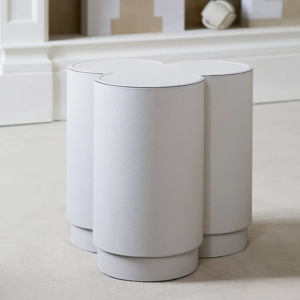 Impeccable craftsmanship and timeless charm mark this elegant stool that will be both a functional and a sculptural accent in modern interior decor. The design is inspired by the clover, with three-cylinder entirely covered in golf light gray nappa leather. It is best paired with the Binary Stool (a play of words for the stool with only two cylinders) by the same designer. Available in different colors, please ask the Concierge for details.