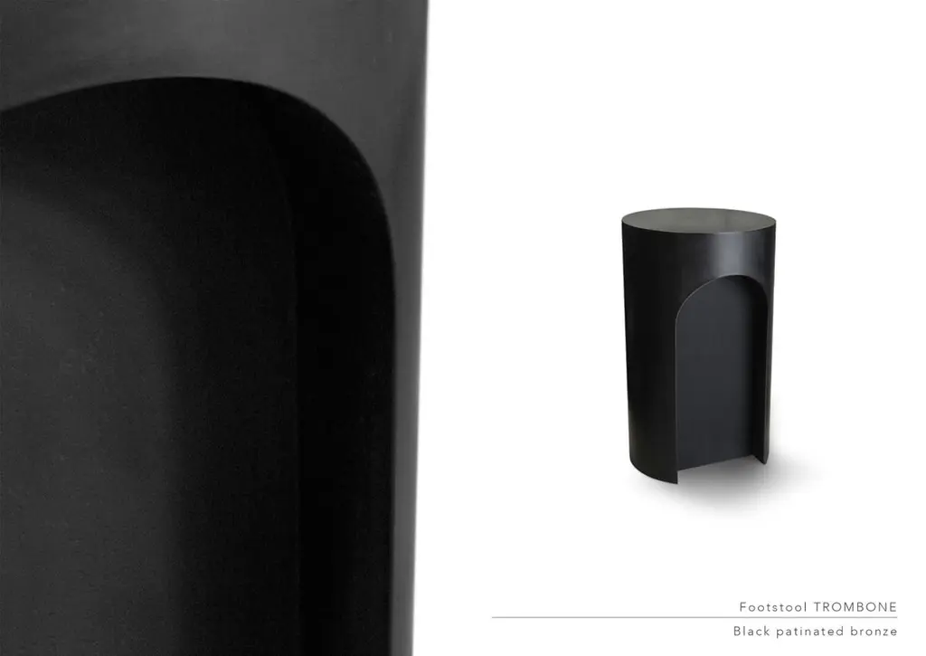 Trombone Foot stool by LK EditionDimensions: Diameter 47 x Height 30 cm Materials: Black patinated bronze. It is with the sense of detail and requirement, this research of the exception by the selection of noble materials and his culture of the French know-how, that LK has built up its principles and set up his skills. LK will meet your expectations and your requirements in residential, hotel, trade, yachts ... And custom-made furniture.LK, is a discrete French high-end decoration company working on projects throughout the world for well-to-do clients and prestigious brands. In September 2019, they are launching their first collection of furniture for the MAISON&OBJET exhibition. The pieces exhibited are a selection from models produced over the last ten years that reveal a quest for something exclusive and natural, signed by interior designer Pierre-Alexis Gilbert, in collusion with his wife and partner Katia Le Vaillant.