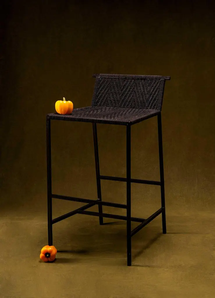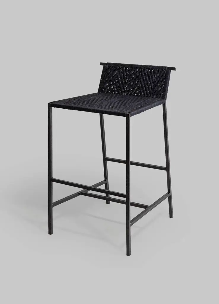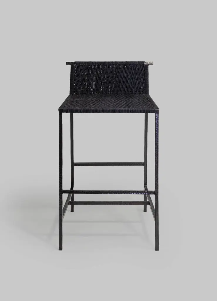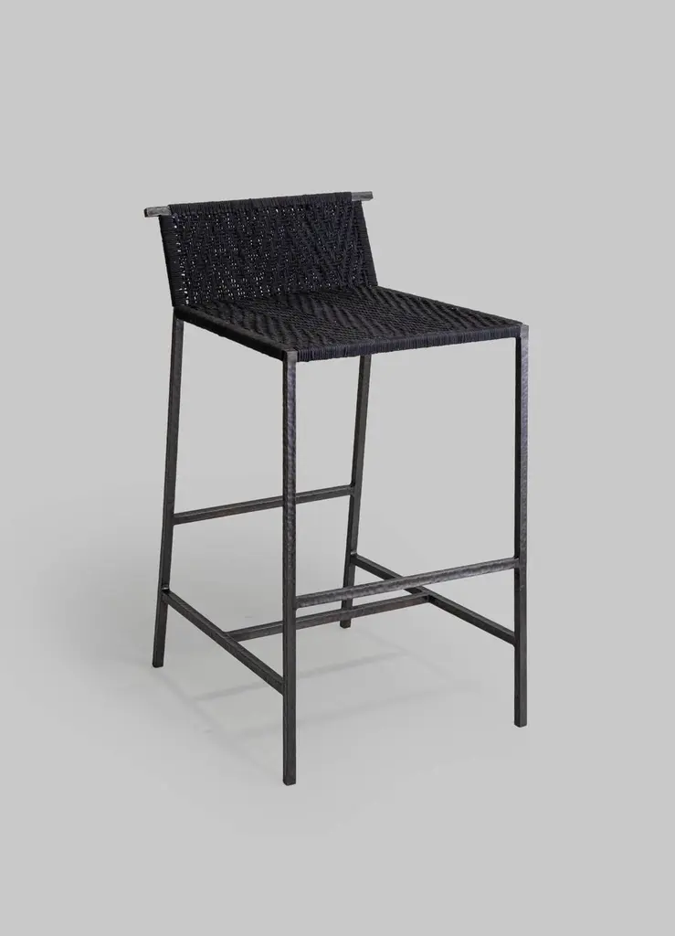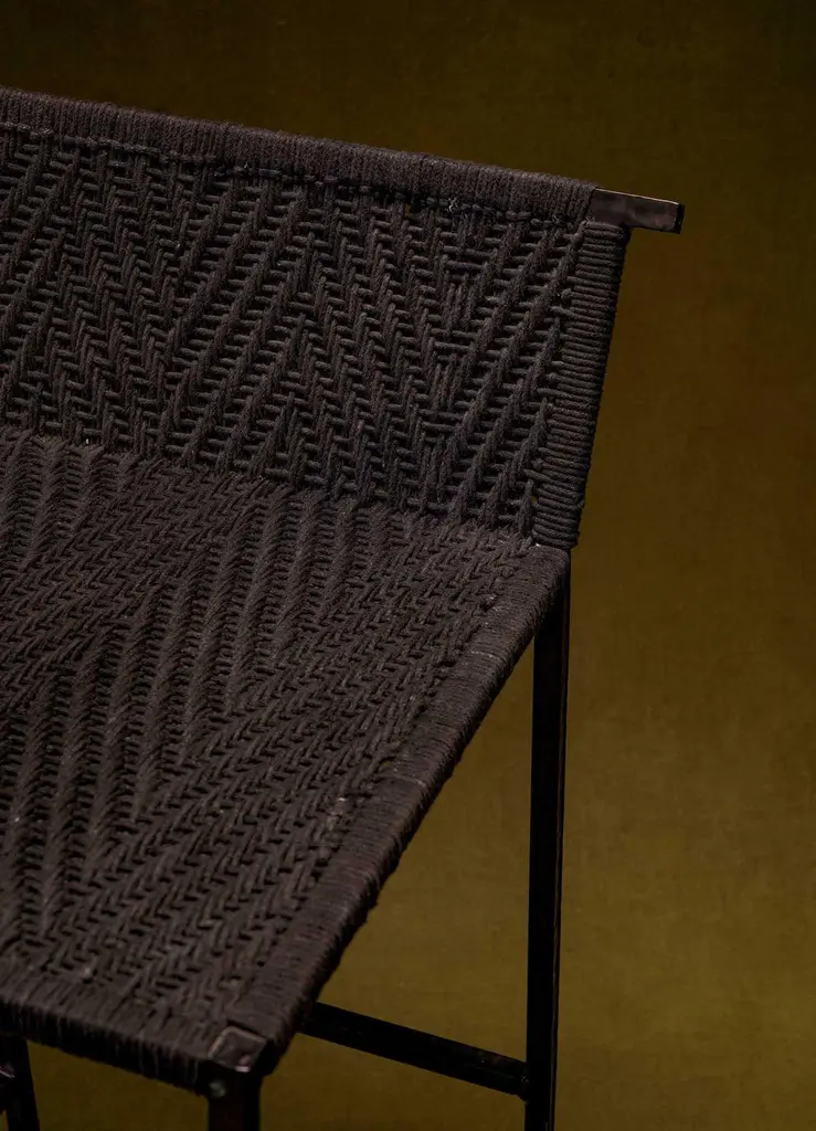 Twist & Knot Black Stool Tall in Rope with Brass Legs, Viya by Vikram GoyalImmersed in the heritage of India's ancient artistry, the humble rope transports us to the heart of craftsmanship. Drawing inspiration from the ubiquitous Charpoy, a traditional Indian cot, this collection features furniture intricately intertwined using traditional knotting techniques passed down through generations. The use of organic fibres like jute and coir echoes the sustainability deeply ingrained in India's cultural ethos, and its delicate strands, fortified through interlacing, remind us that we are all stronger together.Stool in brass and cotton rope. Handmade in India.Product DetailsMaterial: Brass, MS & CottonSize: 21"L x 17"W x 33"H 53.3 L x 43.2 W x 83.8 H cmSeat Height: 27" H 68.6 H cmWeight: 7.5 kg 16.5 lbsNumber of Pieces: 1 StoolSKU: VSL106This product has been handcrafted by local artisans. As such, slight variations are a testament to the unique character of a piece made by hand.