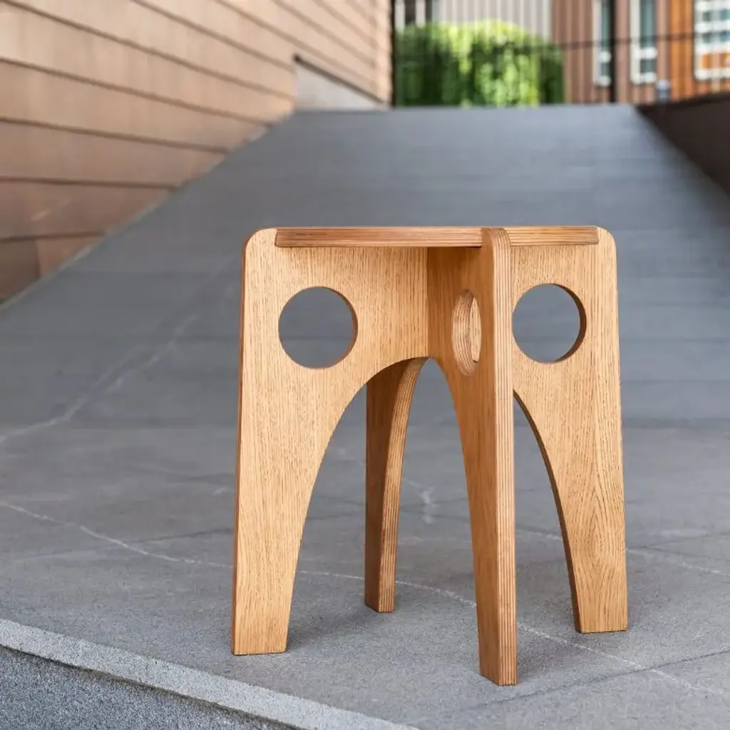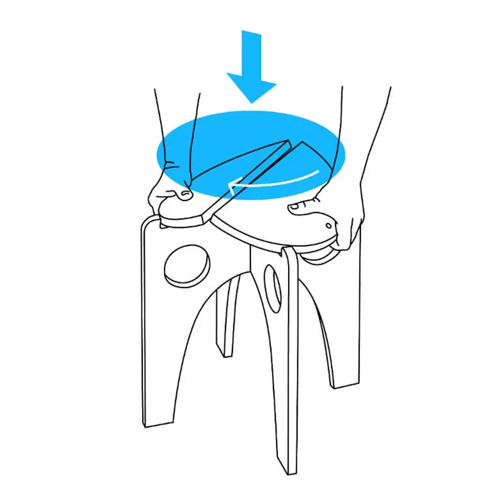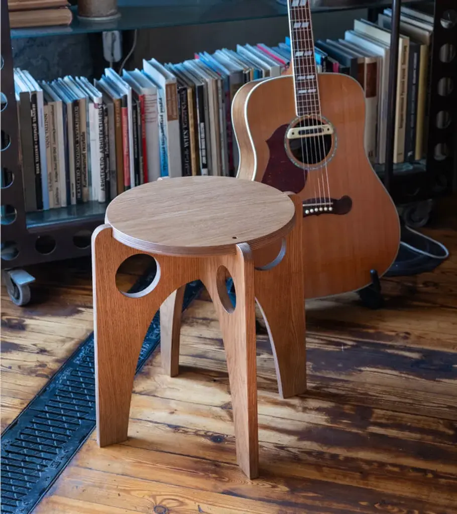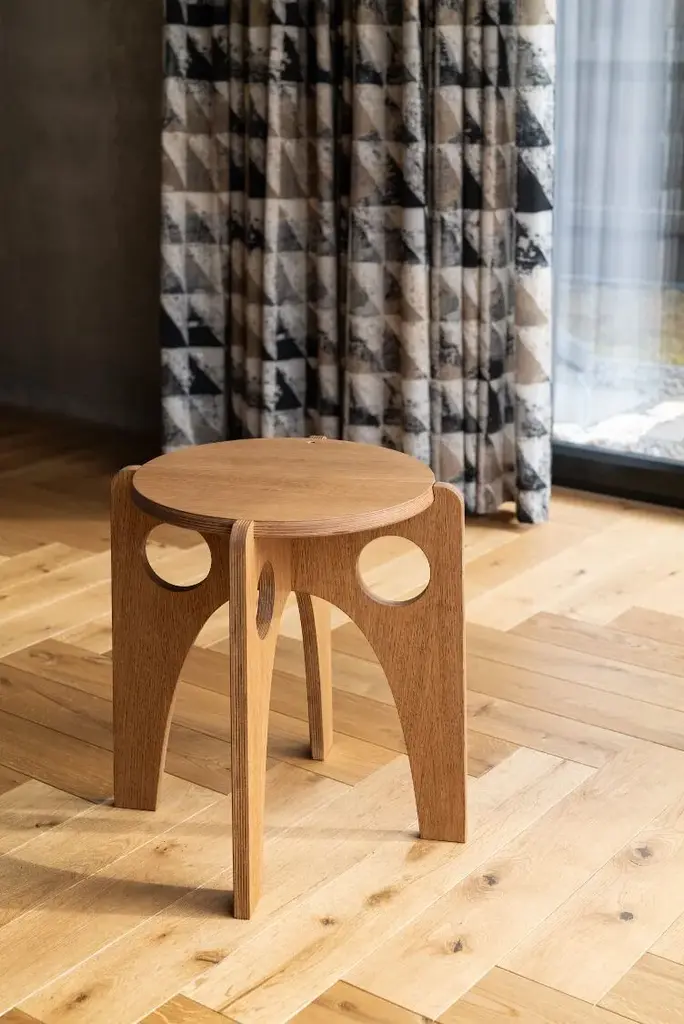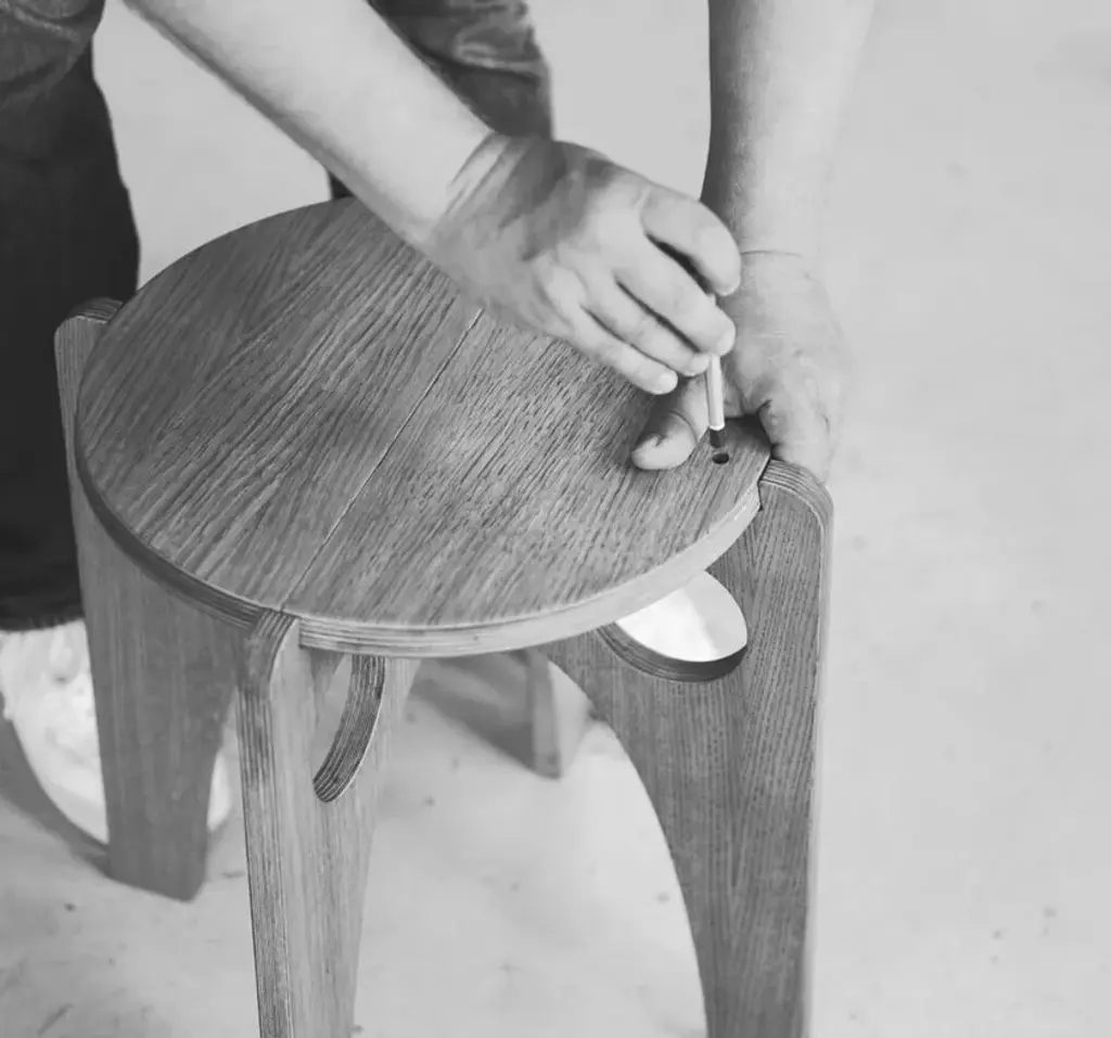 A seat that has a completely new and innovative assembly system.It reinvents the simple stool with a completely new assembly technique, combined with a touch of retro-modern style.As an inventor and designer, Martin Lazarev always aims to incorporate an original solution or clever twist into his products.HOW DOES THIS TWIST STOOL WORK?Good question… There is a cleverly hidden smart lock inside the stool, which you might not notice at first glance.This modern-retro style seat is assembled without the need for nuts, screws, or tools and can be opened by pressing the latch in the small hole with the blunt end of a regular pencil.To assemble, simply place the seat plates on the legs so that the connection line is at a 45-degree angle to the leg line. Push them down and twist until you hear a click.The TWIST stool is very stable and really comfortable to sit on, thanks to the large seat plate. Made of oak veneered birch plywood.