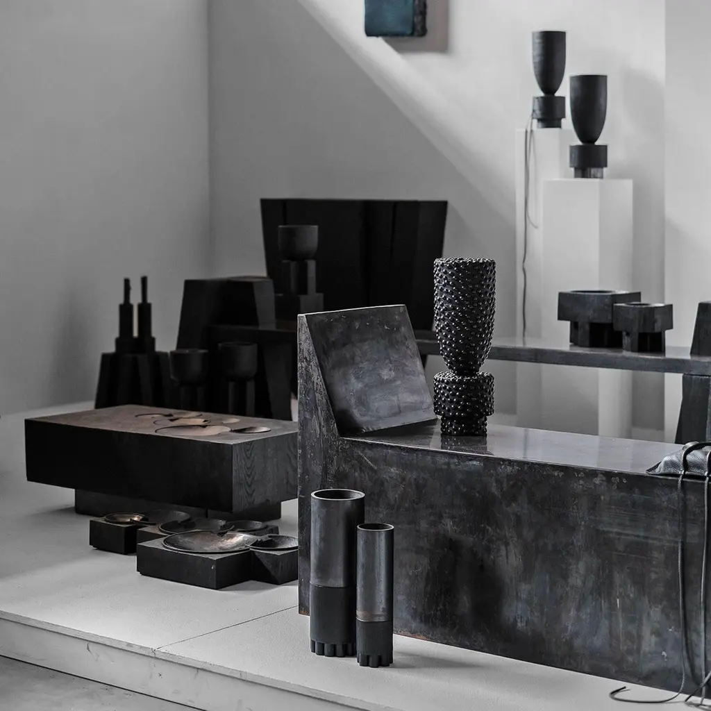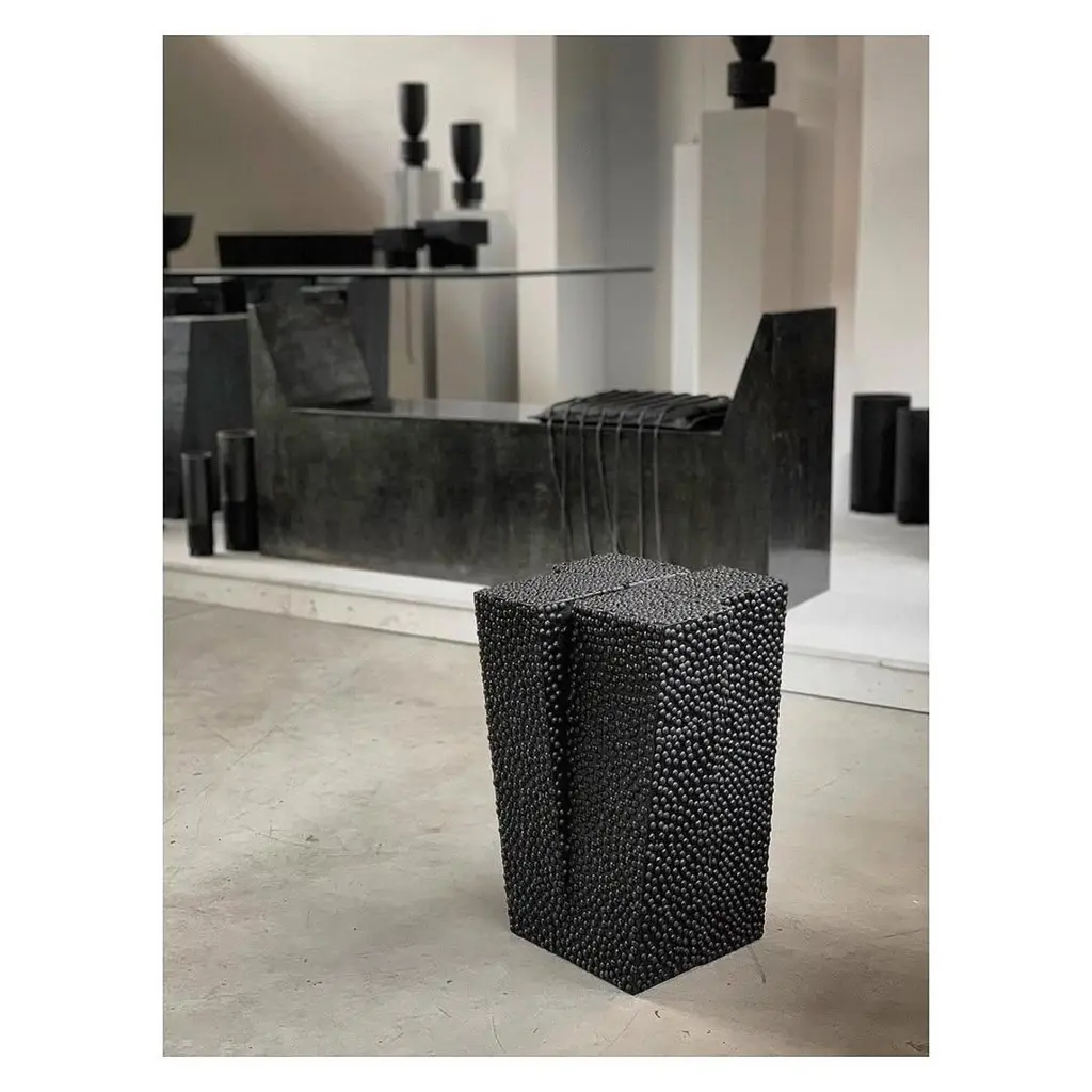 Large AD Stool 2.0 by Arno DeclercqMaterials: Burned steel and Rubber seatMeasures: W 152 x D 38 x H 69 cmArno DeclercqBelgian designer and art dealer who makes bespoke objects with passion for design, atmosphere, history and craft. Arno grew up in a family with parents who like to work with beautiful brands and objects.His father studied at the Royal Academy of Arts Fashion Department, he worked for Bikkembergs and made his own fashion brands, but has also collected tribal arts for more than 20 years. His mother, who worked with his father from the beginning, bought a shoe store in 2010 where they sold brands as Rick Owens, Ann Demeulemeester, Maison Martin Margiela, ... With the interest in beauty he learned from his parents, Arno studied interior design, after learning a lot about materials and with great knowledge of history he designed interiors and opened his own gallery for ethnographic art and design.The collection has come to the idea that there are too few interiors where they no longer have the big and static vases and candlesticks that the people had in big houses over 100 years ago. By focusing on architecture, ancient arts and design, after war buildings, defence buildings (bunkers and fortresses) and tribal arts, he created a collection that became a Classic. Each piece is unique because it is entirely handcrafted by him. Made of tropical hardwood called Iroko this he discovered after one of his many trips to West Africa interested in voodoo arts.In these strange tribal arts, the wood "Iroko" is used in many objects, according to their culture, the ancestors lives in these trees, and they also call this tree "the king of the forest".Arno also combines this with Belgian oak, that dried for more than 30 years, wood that was provided for the many furniture makers in Mechelen.By treating these objects through the Yakusugi technique or another mentioned "Shou Sugi Ban" an ancient Japanese technique where the objects are burned to protect the wood from weathering and subsequently fixed to get a patina look as long as possible. This gives each object a unique texture.