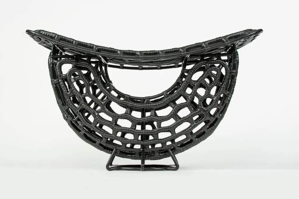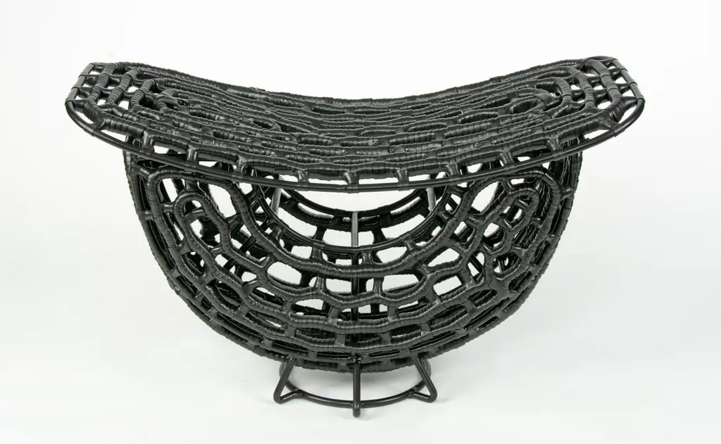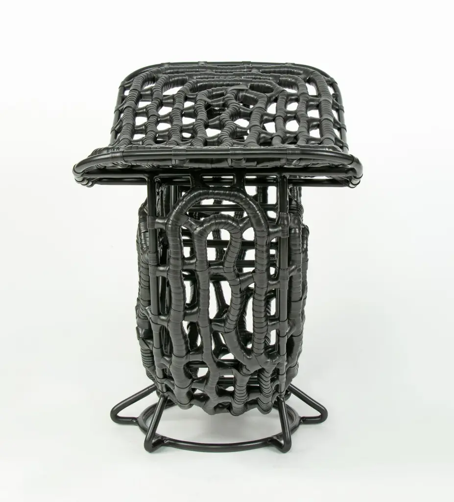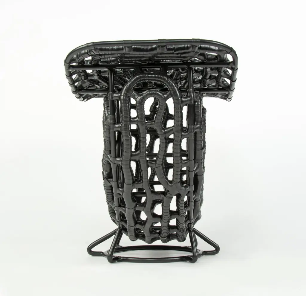 Unique Black Mamba stool by Nawaaz SaldulkerEdition 1/12020Materials: Plastic extruded strips handwoven on a mild steel frameDimensions: 60 x 30 x H 35 cm.