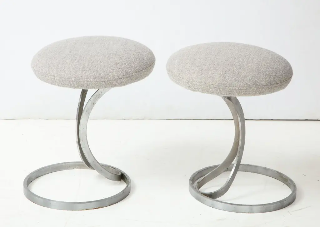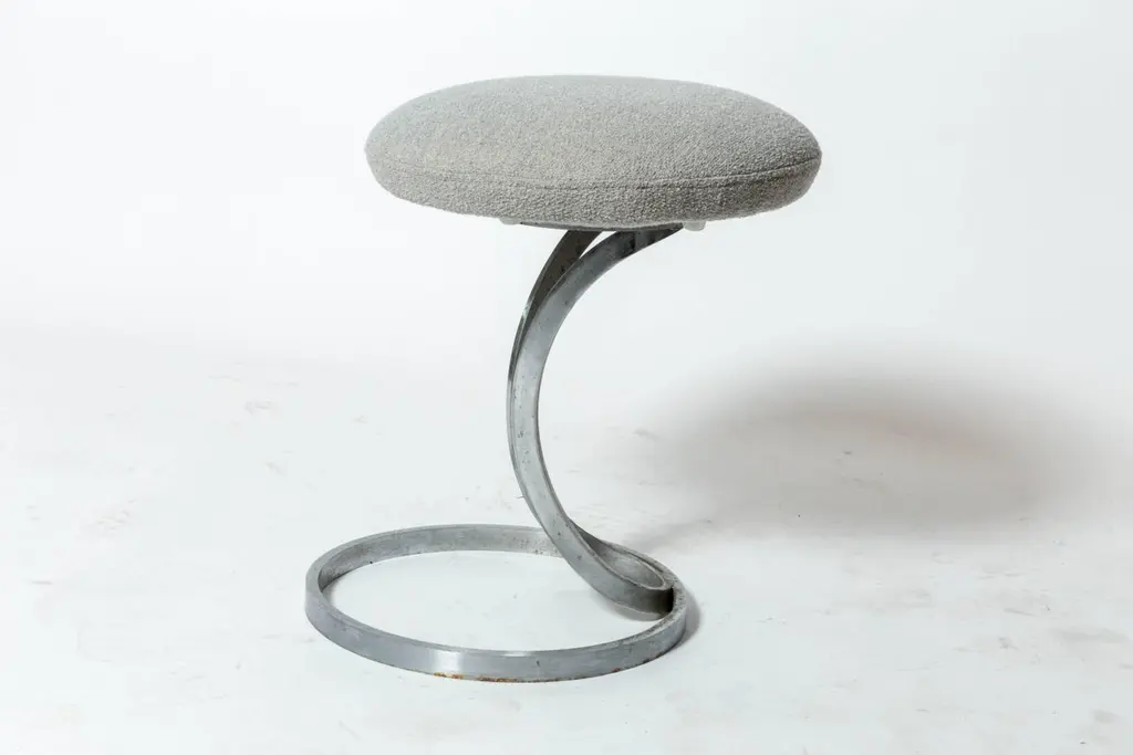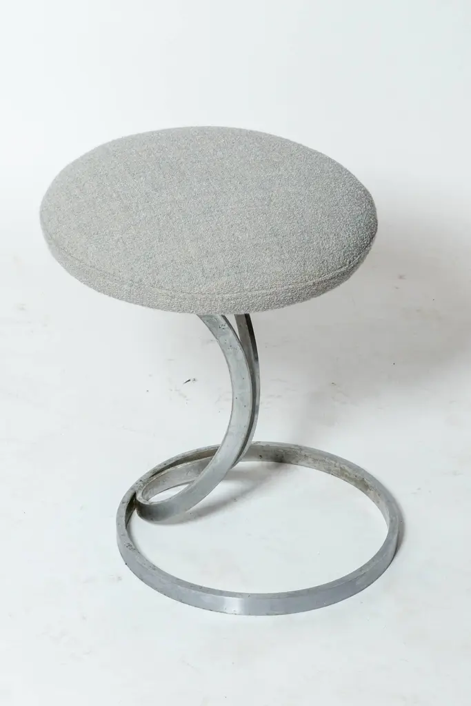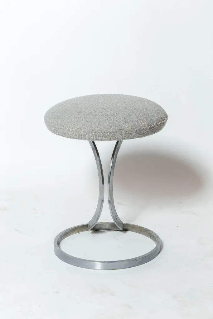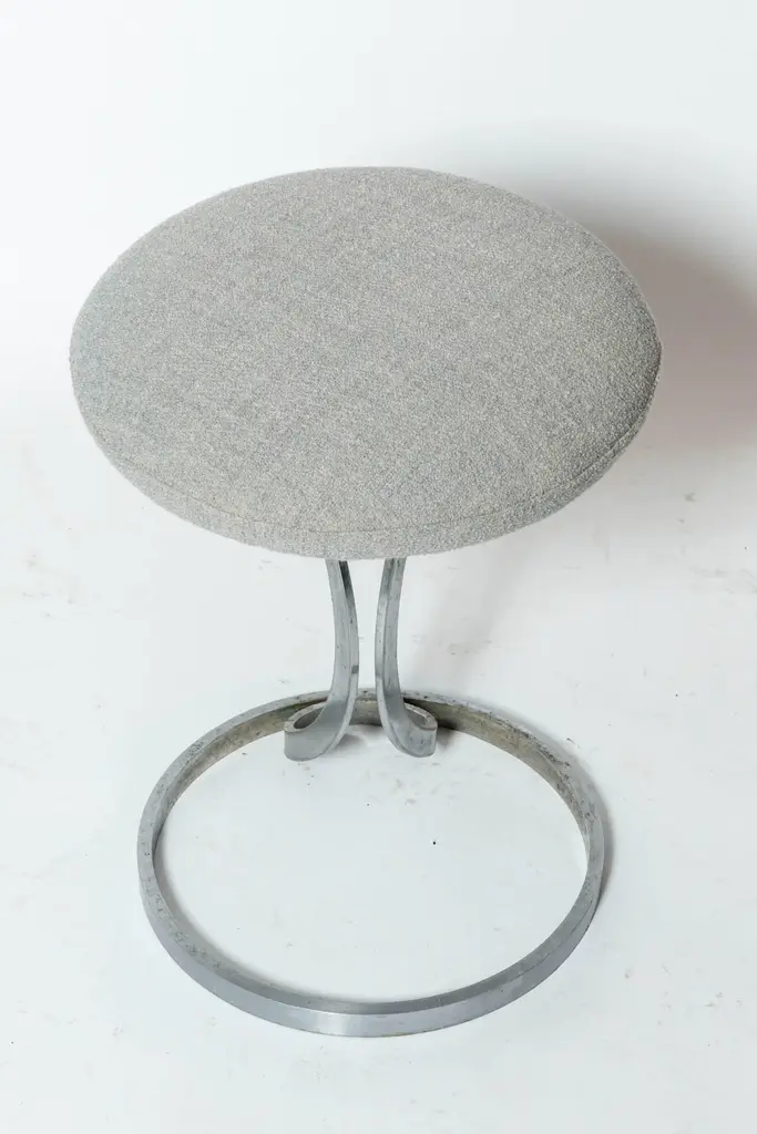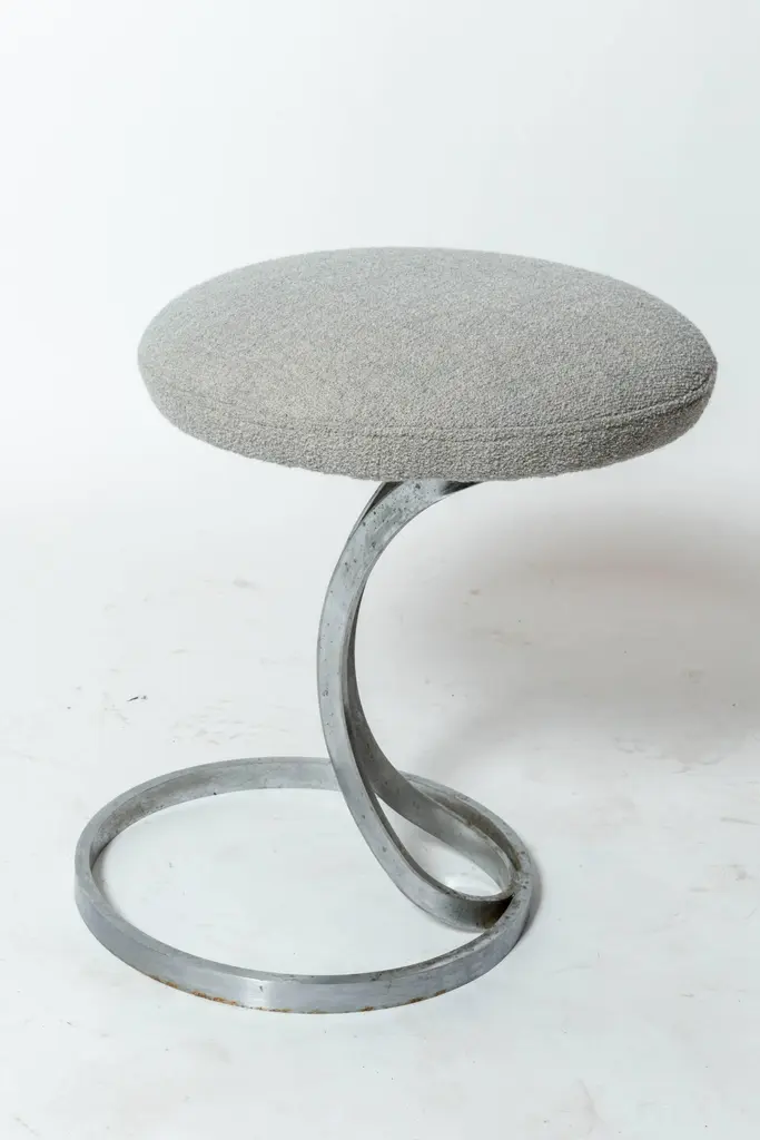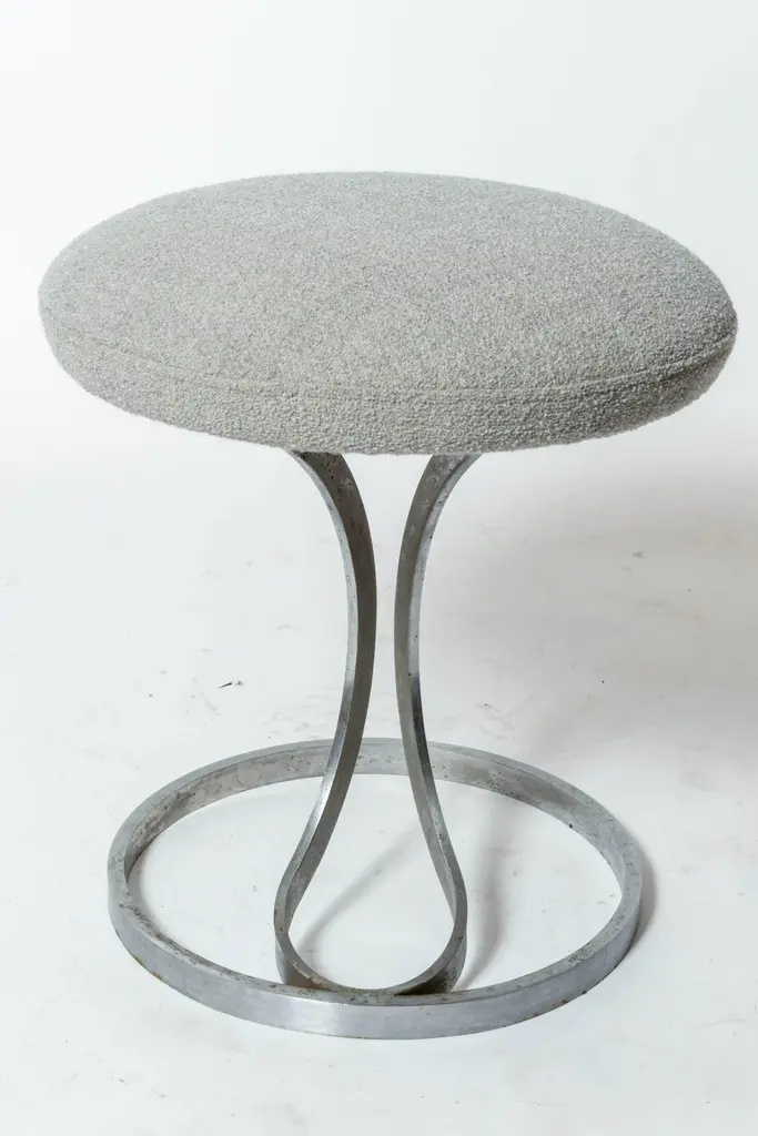 Upholstered metal stools by Boris Tabacoff, France, 1970s.These elegant stools exhibit the sinuous lines + signature sphere base typical of Tabacoff's postwar design work. The stools have been newly reupholstered in a textured light grey boucle fabric. Two available, sold individually.