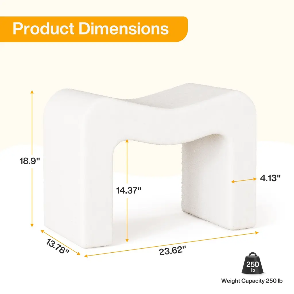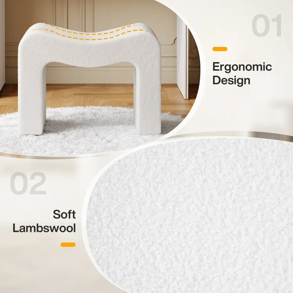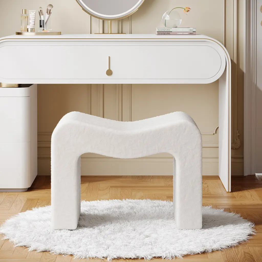 No Assembly Required: Say goodbye to a complicated installation process with this white vanity bench that arrives fully assembled. Simply place it in your desired location, and it's ready to use Ergonomic Design: The top of the stool, featuring a curved shape, is perfect for people to sit comfortably. Its ergonomic design takes into consideration your physical comfort, avoiding discomfort associated with a sedentary lifestyleSelected Material: Crafted from premium MDF and faux lambswool, this vanity stool is built with durability and sturdiness in mind. It can support a weight of up to 250 lb. The material of faux lambswool offers extreme comfortTimeless Style: Step into the realm of refined living with our vanity stool! It embodies an exclusive blend of functionality and aesthetics, elevating not just your sense of experience but also your taste in lifestyle