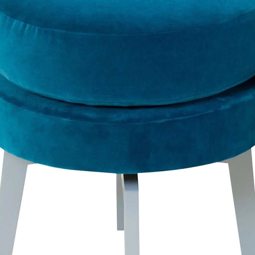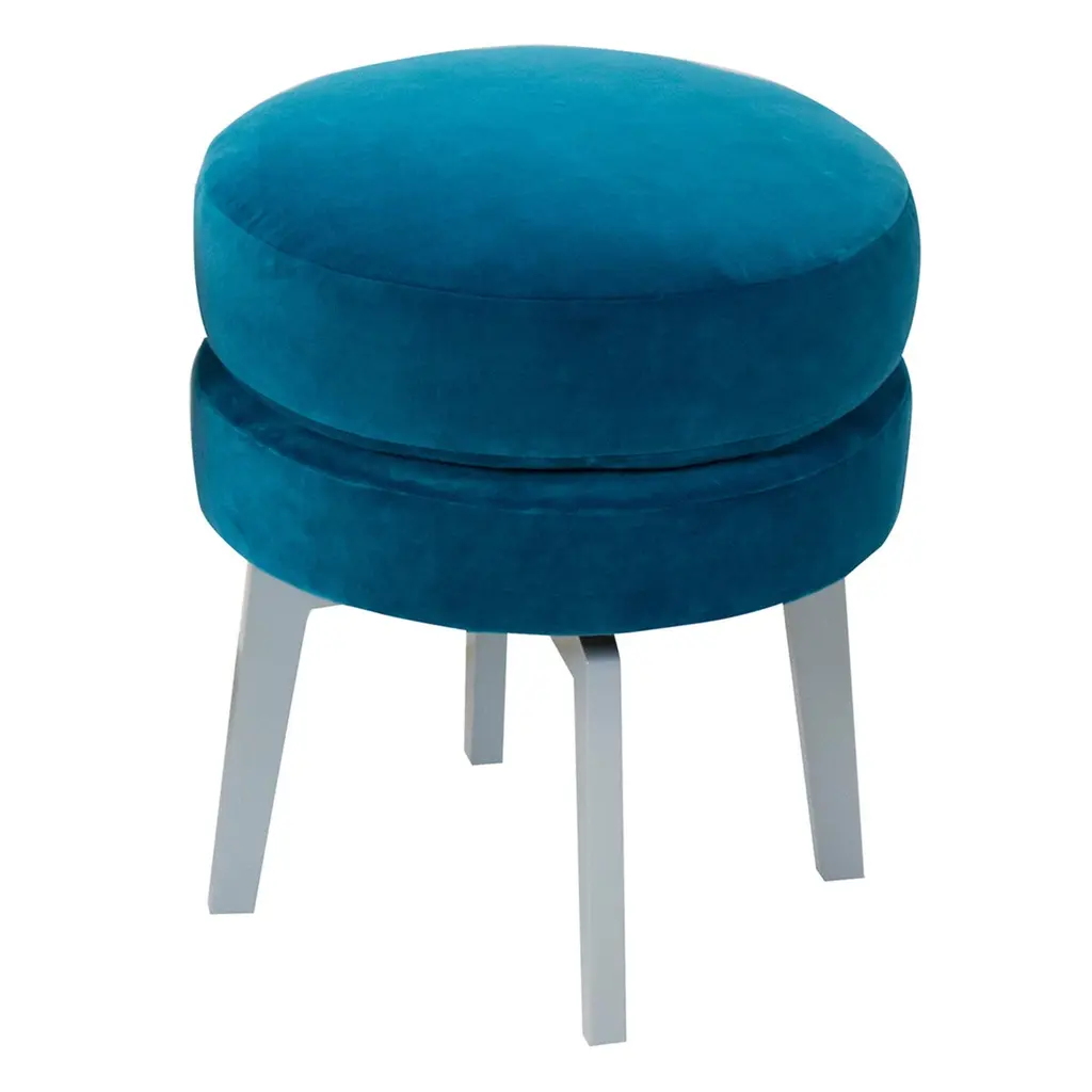This small round stool is covered in a blue teal velvet with solid poplar wood legs lacquered in gray. This sturdy base with a comfortable foam cushion seat is great for all ages. Size, finish and fabric are customizable.Measurements:Outside: 16.5" W x 16.5" D x 20" HPrice as Shown: $1,340 eachCOM Price: $1120Customization may change price.How We Work:Made to order by Connecticut-based furniture design and manufacturing company The Tailored Home.Customization Options:Dimensions can be customized.The fabric shown may come in more colors. We also carry thousands of other materials and can send you samples and fabric pricing upon request. We accept your fabric for a COM fee of 5% of the cost of the piece. Welting, piping, tape or trim can be added. Different species available for pieces with exposed wood and can be painted & lacquered in any Benjamin Moore color (for additional charge) or stained in one of our stain options. Custom color matches cost $75 per sample.We accept inspiration photos of pieces you like.