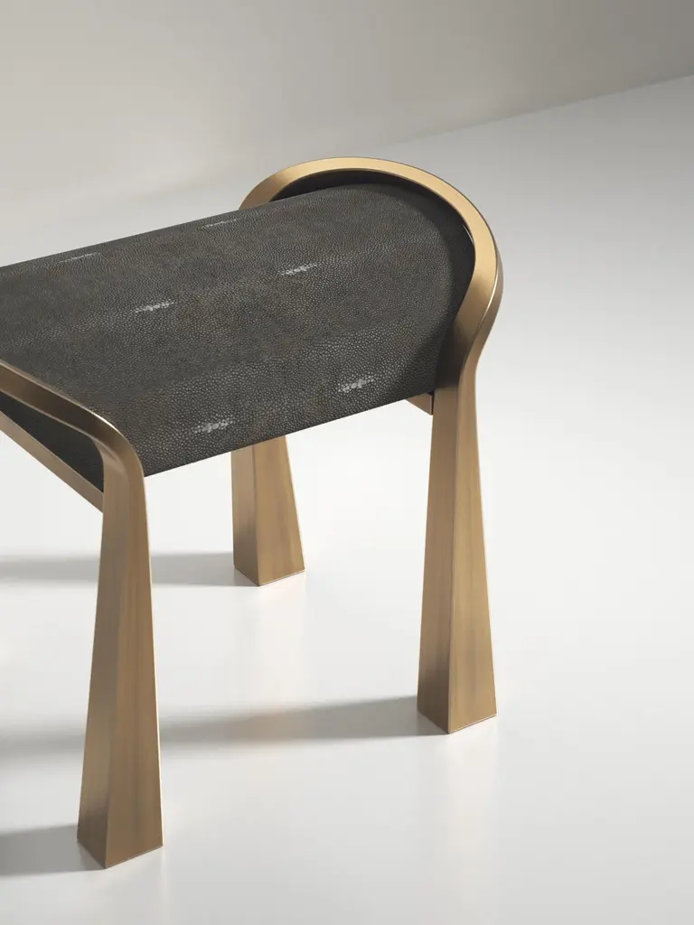 The Paris based label has distinguished themselves since their launch, with their iconic use of shagreen mixed with brass and other exotic materials. All furniture is handcrafted by skilled artisans, ultimately making each piece unique, designed in Paris and produced in the Philippines.The Arche Stool by R&Y Augousti is a stunning piece, a statement in any space. The black velvet upholstered seat is nestled in between a pair of bronze-patina brass sculptural cutout "arched" legs. This design also exists inlaid in shagreen or client COM and as a bench, see images at end of slide. Sold individuallyThe dimensions of this piece are 61 x 43.8 x 52.6 cm (seat height 37cm)All R&Y Augousti pieces are handmade by artisans, ultimately making each piece unique.Custom color/sizing available on request.Wipe clean with soft dry cloth. Acclaimed design duo Ria & Yiouri Augousti have established themselves since the 1990’s as pioneers of modern-vintage style through their luxurious art-deco inspired collections.The Paris based label has distinguished themselves since their launch, with their iconic use of shagreen mixed with brass and other exotic materials. All furniture is handcrafted by skilled artisans, ultimately making each piece unique. All shagreen-covered items should be kept out of direct sunlight, color variants may occur on the stingray and other exotic finishes, but this showcases the Parisian label's commitment to creating authentic luxurious products using natural components.
