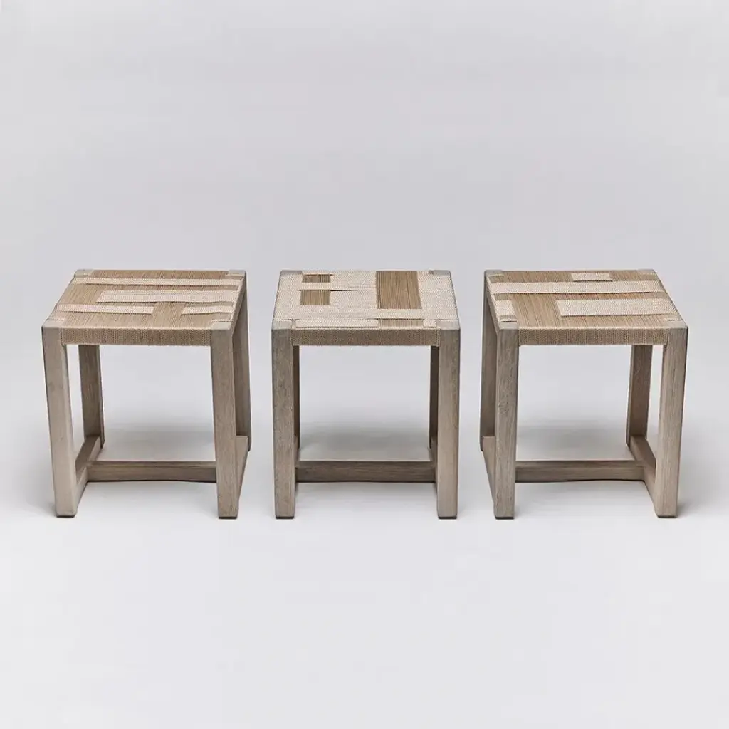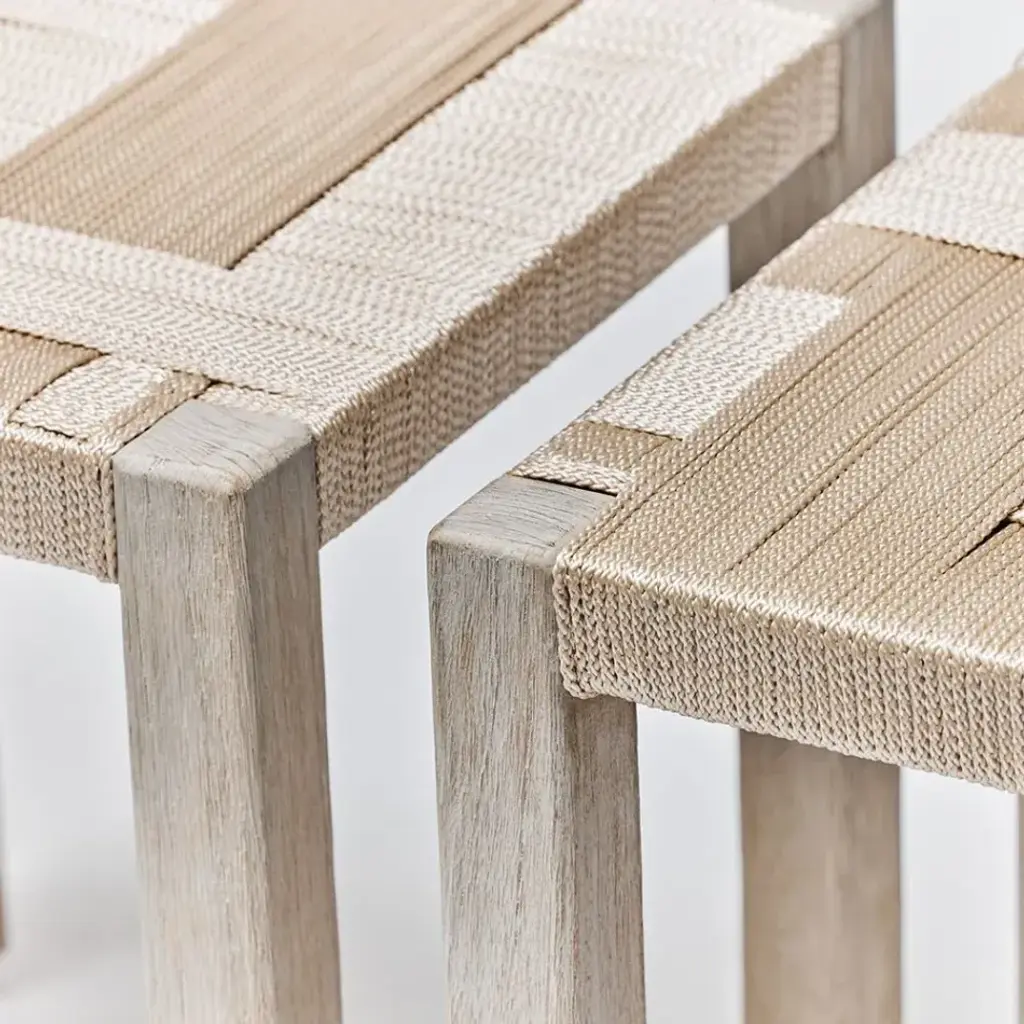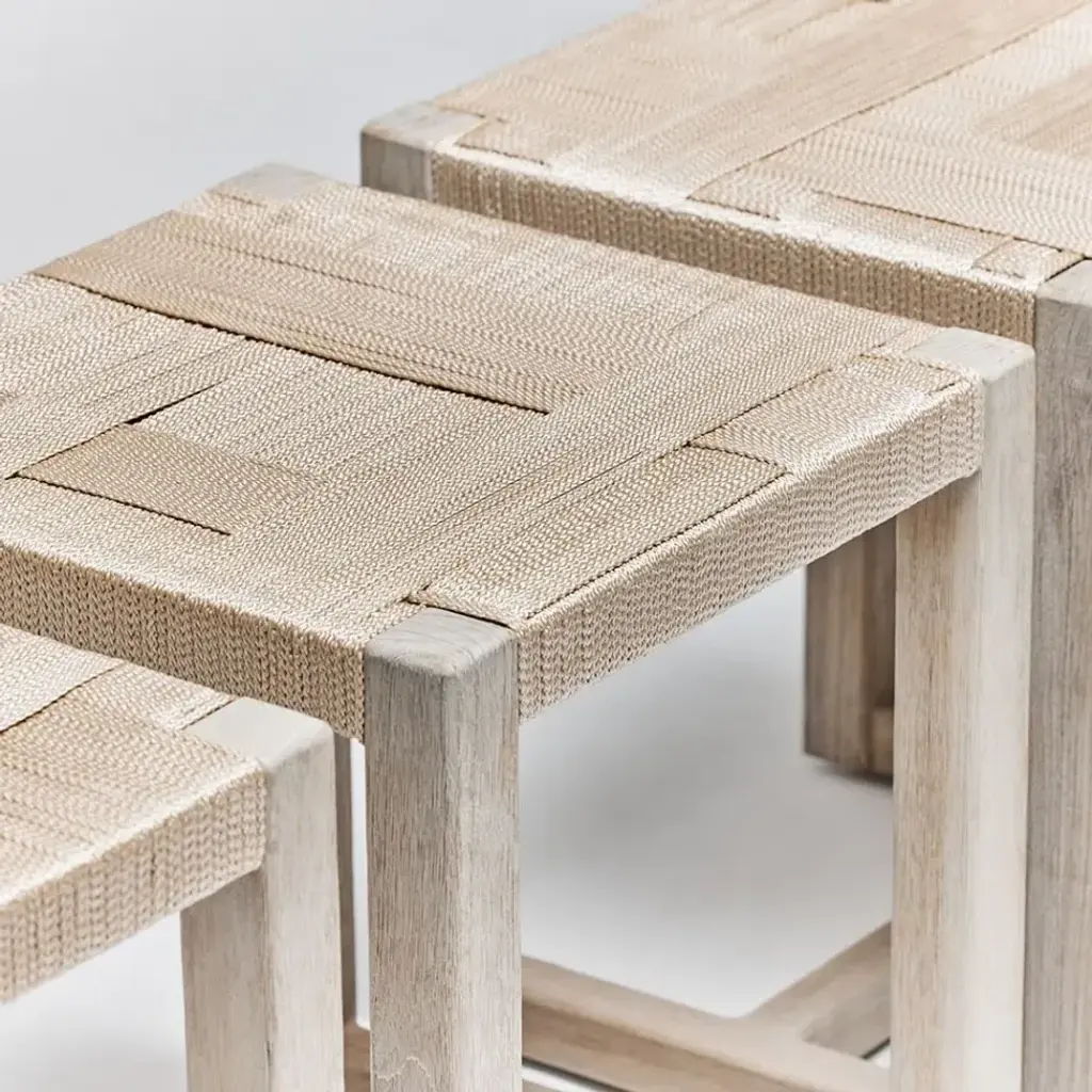 Crafted of woven champagne rope topping rustic grey teak frames, the Venice Square Stools are a super-chill trio that look as cool together as they do apart. This item is made of solid wood. Item will not be exactly as pictured, subtle deviations in hue after finishing can be expected as a result of natural variations in coloration of the base material.