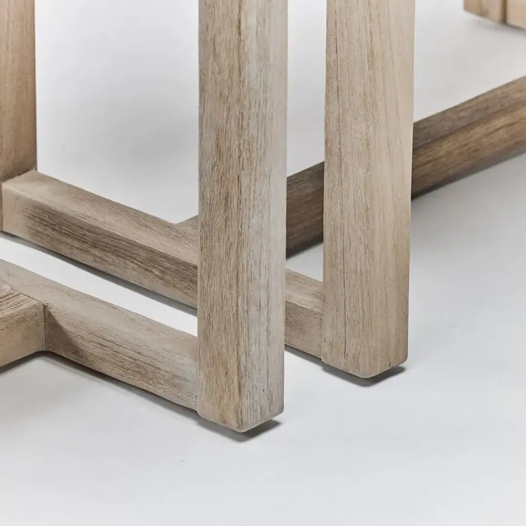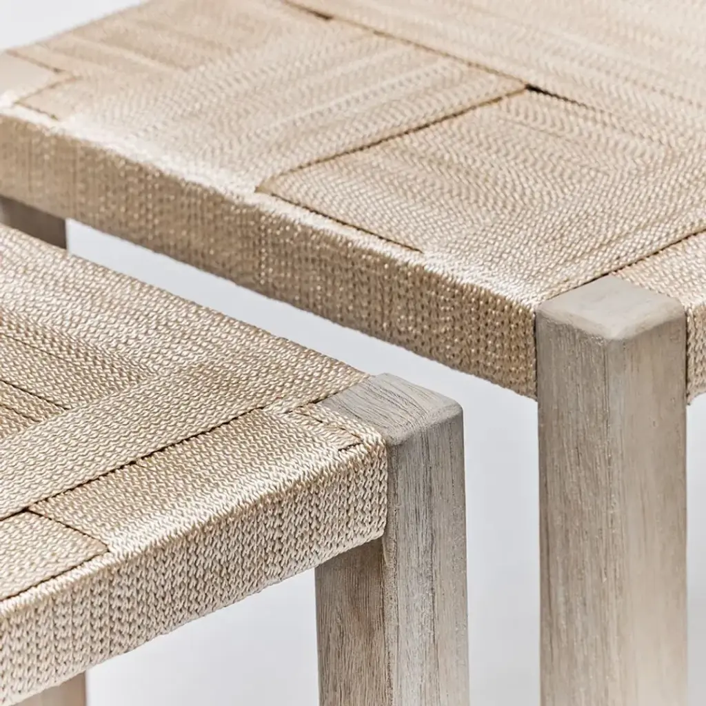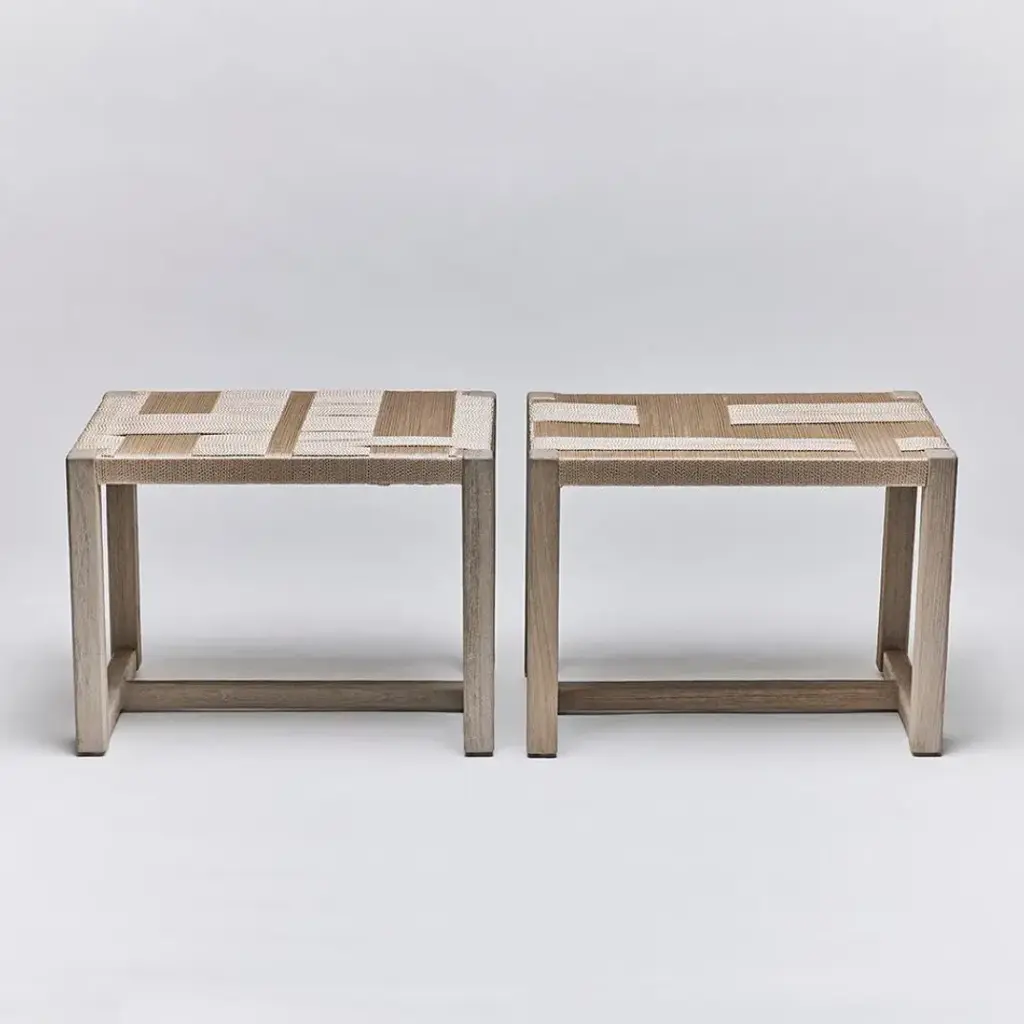 With a woven champagne rope seat topping rustic grey teak frames, the pair of Venice Rectangular Stools gives seriously cool vibes. This item is made of solid wood. Item will not be exactly as pictured, subtle deviations in hue after finishing can be expected as a result of natural variations in coloration of the base material.