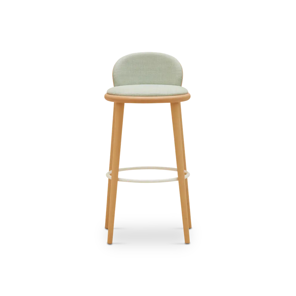 Veretta 929 is a high stool with a backrest and footrest, featuring a beech wood frame and upholstered seat and backrest.Veretta is a collection with soft lines and simple geometries, distinguished by a curved solid beech wood ring that encircles the seat and frames the backrest.The seats, which can be upholstered at the front, highlight the wood material, especially in the joint with the seat ring featuring hand-finished ends.