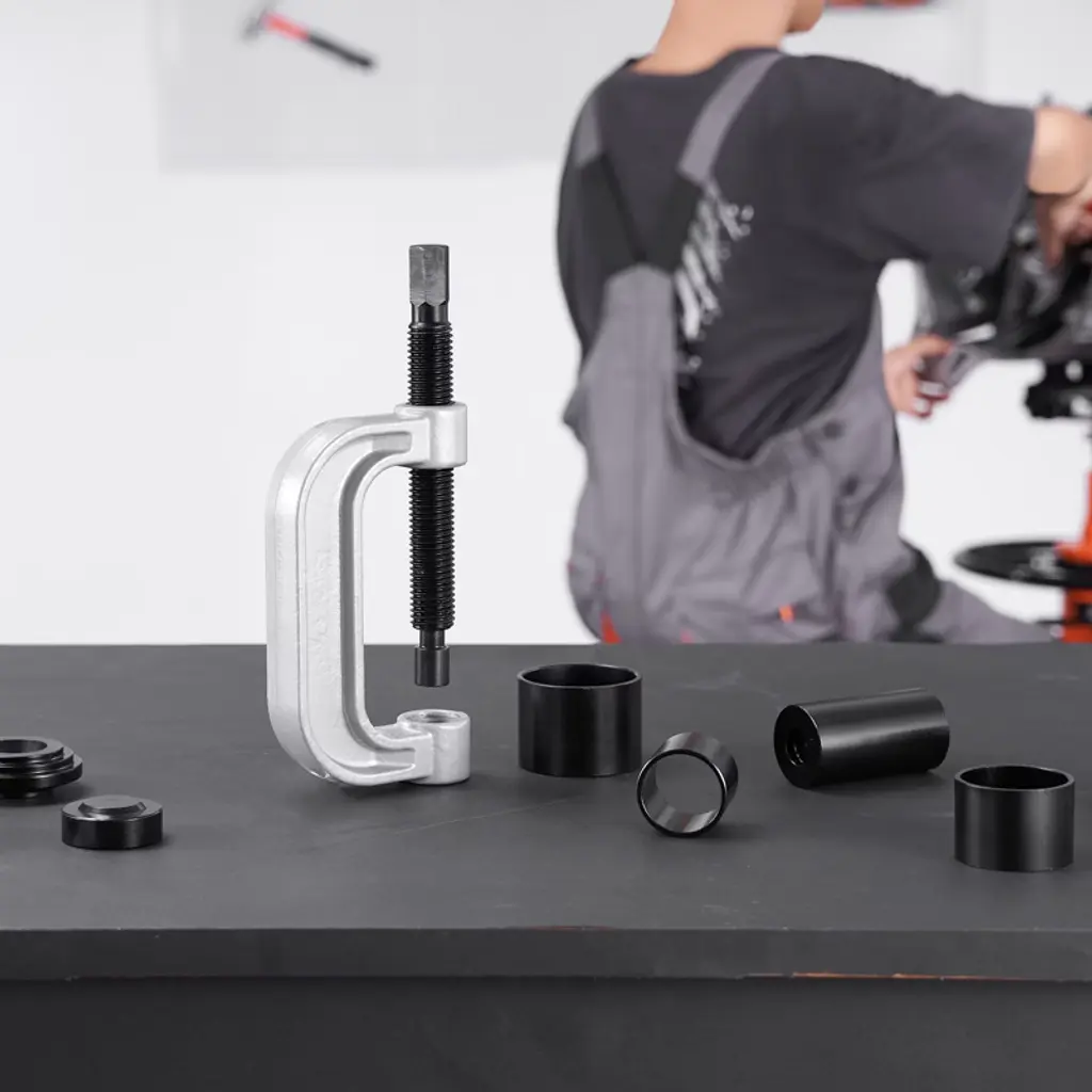 Feature: High Compatibility Tool Kit: Are you ready to get your car out of the garage? Our 25-piece ball joint tool kit is designed to fit most 2-wheel drive (2WD) and 4-wheel drive (4WD) vehicles, including vehicles with Dana 28, 30, 35, 44 or 60 front axles. It is compatible with popular car brands such as Ford, General Motors, Dodge, IHC, and Jeep. Make it Harder: Our ball joint install kit is built to handle tough tasks without bending or breaking. The C-clamp hardness is HRC32-38, and the jack screw hardness is HRC28-36, achieved through multiprocess heat treatment. This makes our kit reliable and capable of handling the most challenging and high-stress tasks. Robust & Powerful Structure: Our heavy-duty ballpoint press kit is made from high-quality carbon steel, providing the strength and durability needed to handle any task. It is coated in black, offering superior protection against water, corrosion, and rust. This ensures that the kit remains efficient and durable even in the harshest conditions. Protection for All Your Tools: The ball joint press makes it easy to remove and install ball joints, U-joints, and brake anchor pins without dismantling the control arm. Our portable carrying case kit includes 10 high-quality pieces, and it is designed for easy transportation and storage. What’s in the Package: Our 25 pcs ball joint kit includes 9 adapters, 1 plug, 1 ball joint press, 1 installation adapter, 1 installation cup, 1 installation cup adapter, 1 receiving cup, 7 receiving tubes, 1 removal adapter, 1 screw and a socket. With these tools at your disposal, you'll have a professional car repair assistant that can help you get the job done right. Package Content 1 x Suitcase 1 x Plug 1 x Ball Joint Press 1 x Jackscrew 9 x Adapters 1 x Installation Adapter 1 x Installing Cup 1 x Install Cup Adapter 1 x Receiving Cup 7 x Receiving Tubes 1 x Removal Adapter 1 x Socket