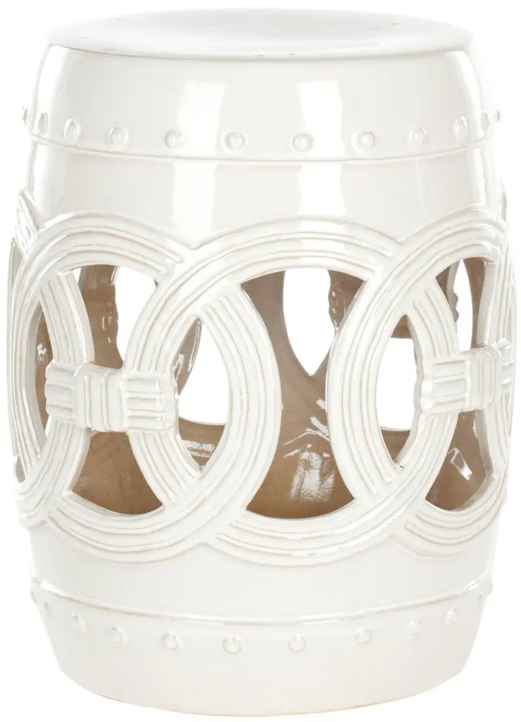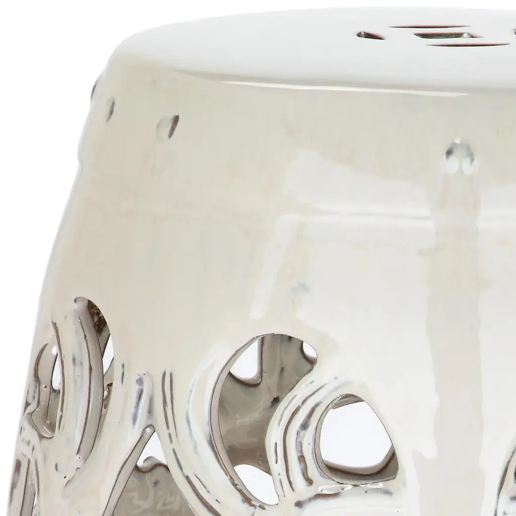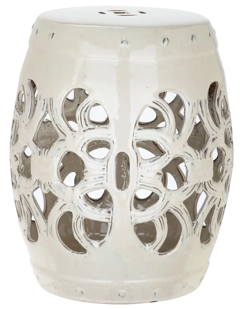 The ages-old motif of the Imperial Vine indoor-outdoor garden stool will add fashion punch to any home in a shade of cream.Crafted of glazed ceramic with the requisite double coin top and faux nailheads, it doubles as a stool or table. Wipe with damp cloth. Avoid the use of chemicals and household cleaners as they may damage the finish. Suitable for outdoor use, avoid extreme temperature and store indoors during long periods of inclement weather.