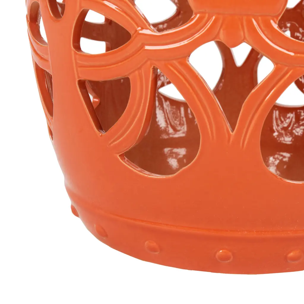 Perked up with eye-popping orange, the ages-old motif of the Imperial Vine indoor-outdoor garden stool will add fashion punch to any home.Crafted of glazed ceramic with the requisite double coin top and faux nailheads, it doubles as a stool or table. Wipe with damp cloth. Avoid the use of chemicals and household cleaners as they may damage the finish. Suitable for outdoor use, avoid extreme temperature and store indoors during long periods of inclement weather.