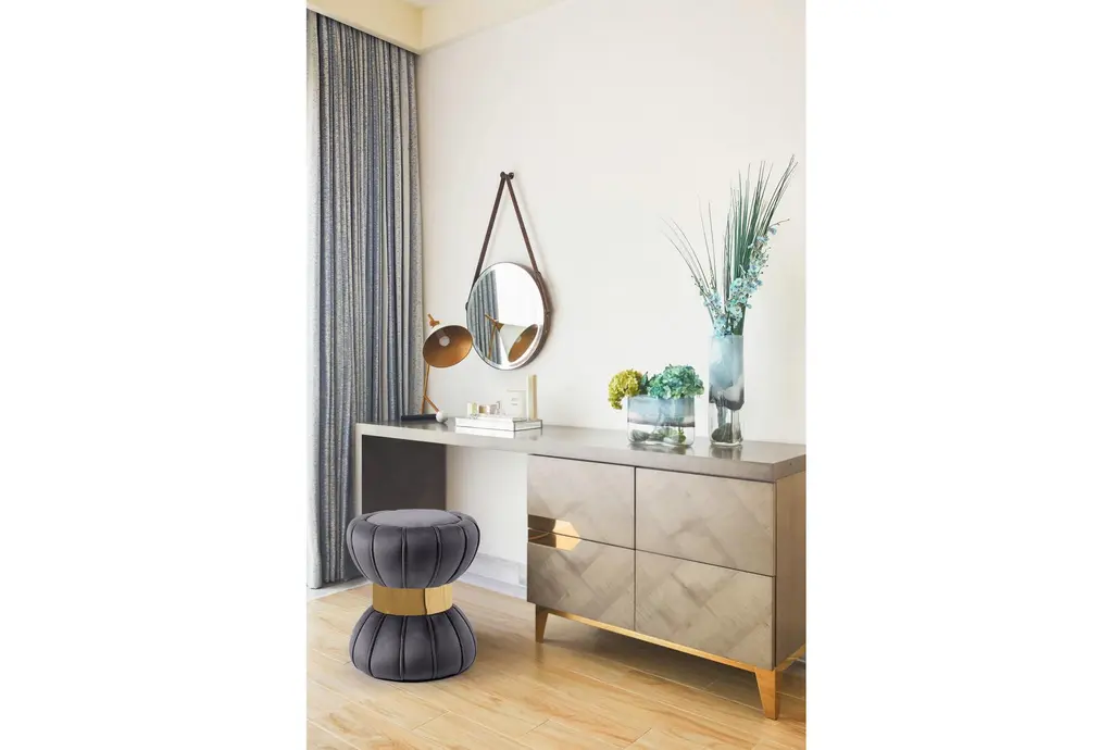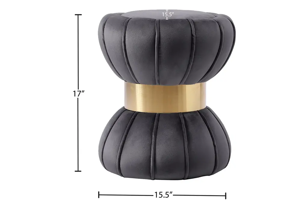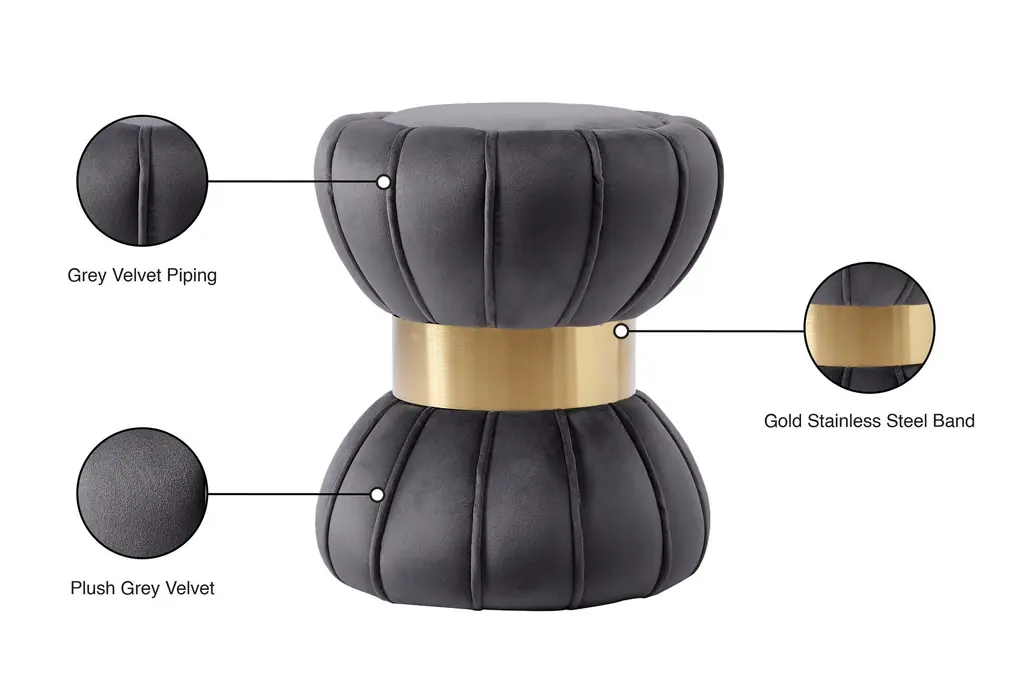 Introducing the Vino Grey Velvet Upholstered Ottoman / Stool, a perfect blend of modern style and comfort. This round ottoman is designed to enhance any living room or bedroom with its luxurious grey velvet fabric and chic gold detailing. Whether used as a footrest, extra seating, or a stylish accent piece, the Vino Ottoman is sure to make a statement in your home.
