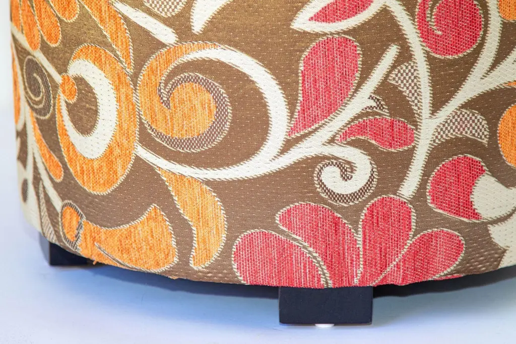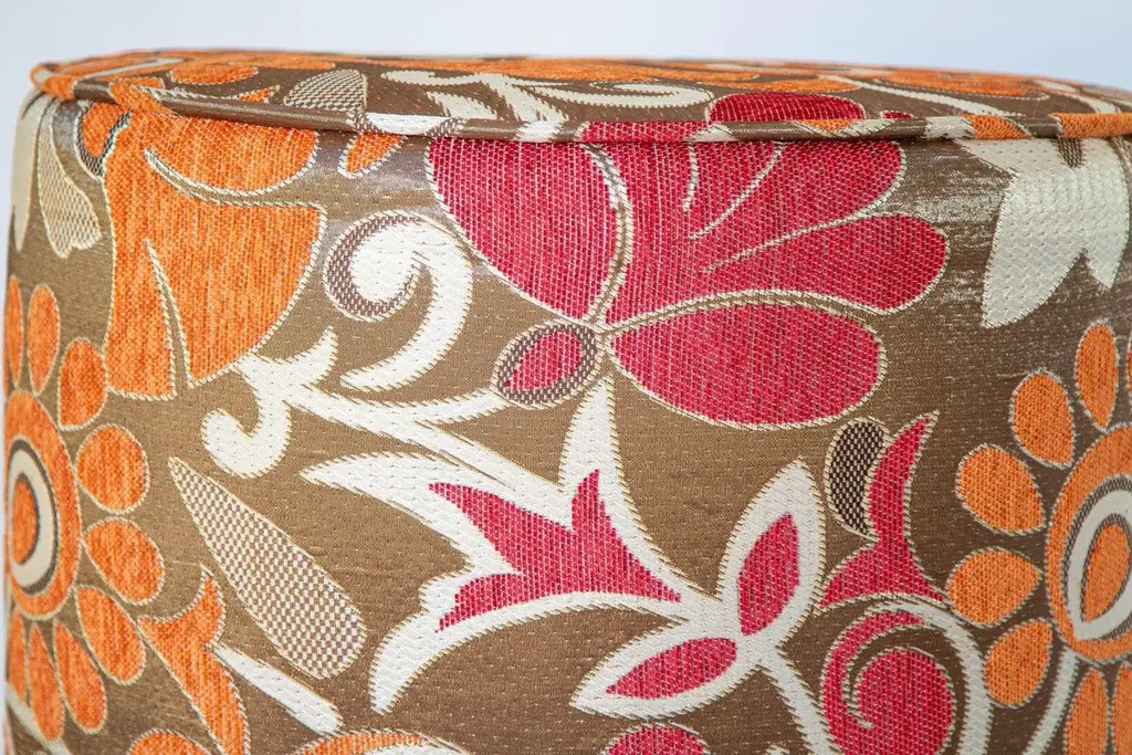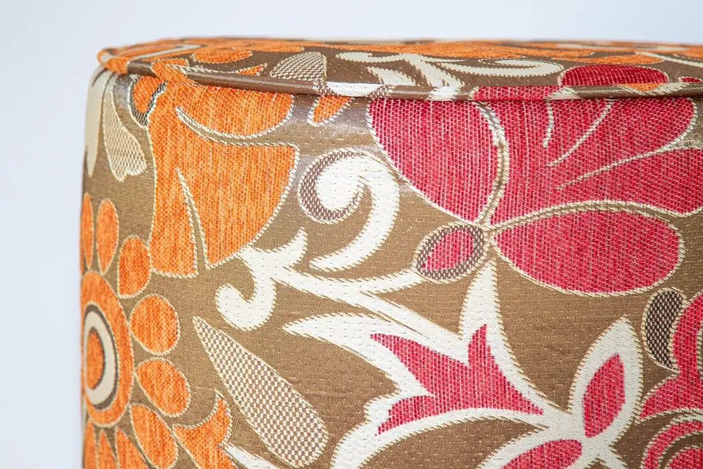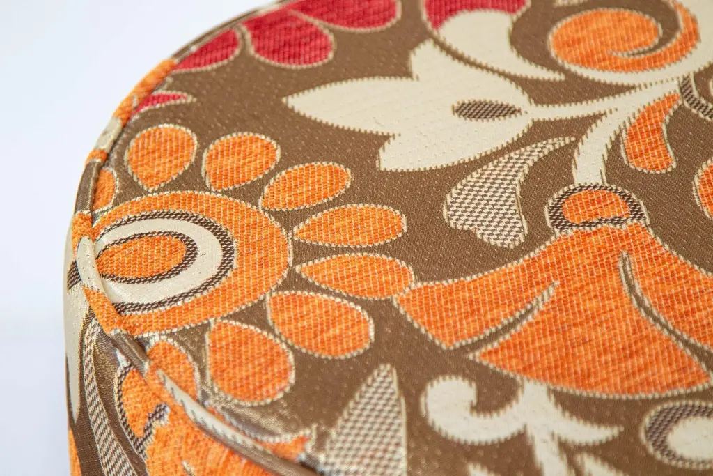 Modern vintage cylindric stools in bronze, red, white and red psychedelic velvet fabric upholstery in 1970s style.Pair of highly decorative post modern contemporary cylindric stools in multicolor fabric upholstery in 1970s Bohemian style.Art Deco style, Middle Eastern, Moroccan, Moorish little pouf hassock, upholstered footstool or modern circular ottoman.This versatile accent piece, pouf is designed primarily for seating but can be used as both seating and as a pull up tableMultiple upholstered stools available, great to use in a restaurant, for a party as extra seats, or for kids room as they are very light to carry around.Hollywood Regency Moroccan style pouf in Maison Jansen or Jean Royere, Missoni style.Measures: Size is 18 inches diameter x 17 inches height.The weight 10 lbs each.This is a highly decorative pair of Missoni Home style fabric that is no longer in production.