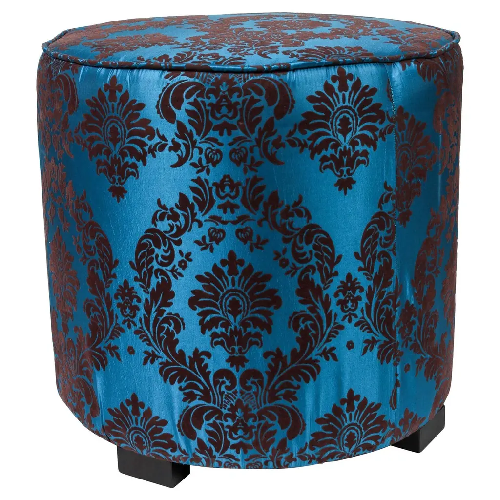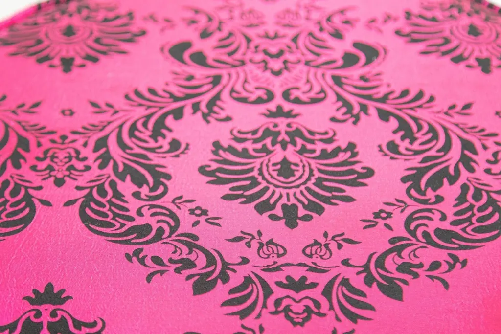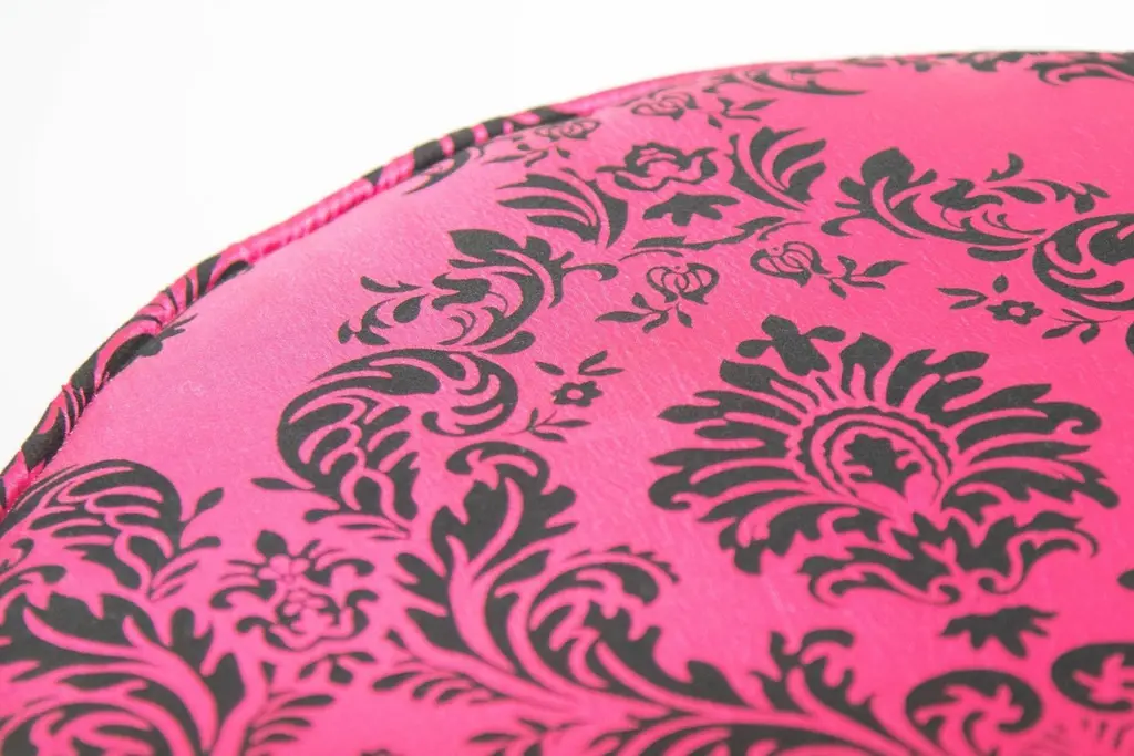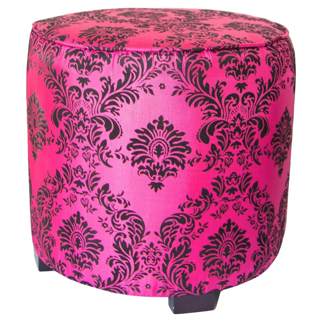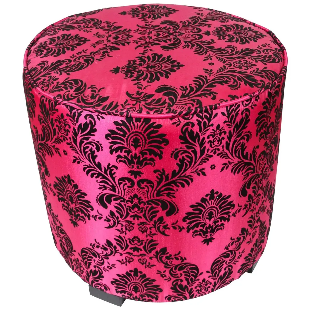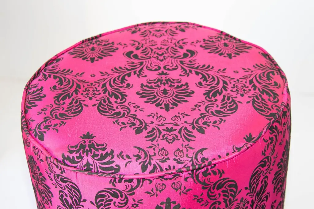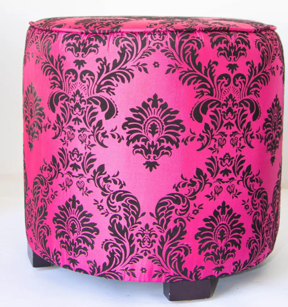 Pair of modern fuchsia and black Moroccan Art Deco Style stools. The upholstery is a damask fabric in floral taffeta with a raised velvet printed texture.Pair of modern Contemporary round Moroccan style stool in pink fabric upholstery in 1970s style. Moroccan Art Deco Style little pouf hassock, upholstered footstool or modern circular ottoman. This versatile accent piece, pouf is designed primarily for seating but can be used as both seating and as a pull up tableMultiple available, great to use in a restaurant, for a party as extra seats, or for kids room as they are very light to carry around.Please call us if you need more than two.Art Deco Style, Hollywood Regency or Moroccan style pouf in Maison Jansen or Jean Royere style. Measures: Size is 18 inches diameter x 18 inches height. The weight 10 lbs each.