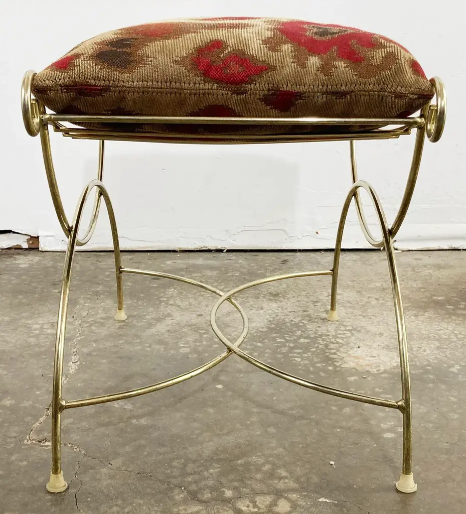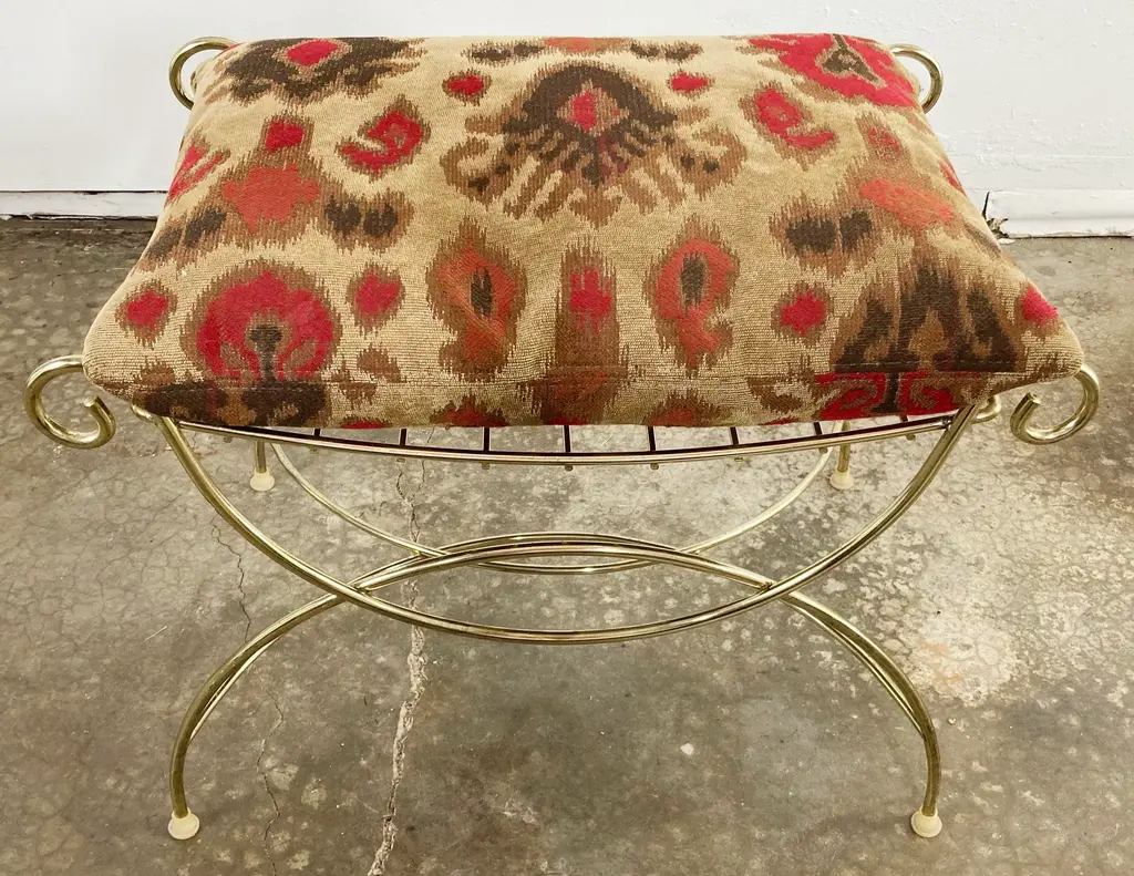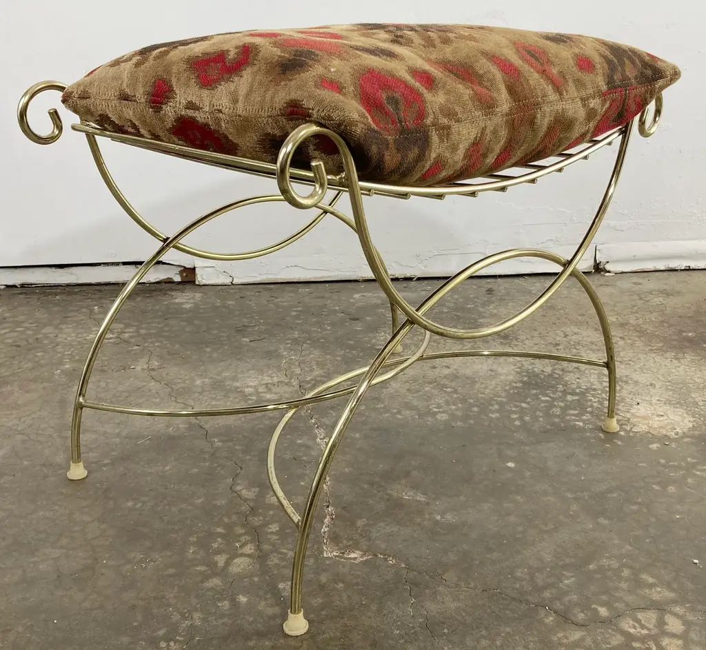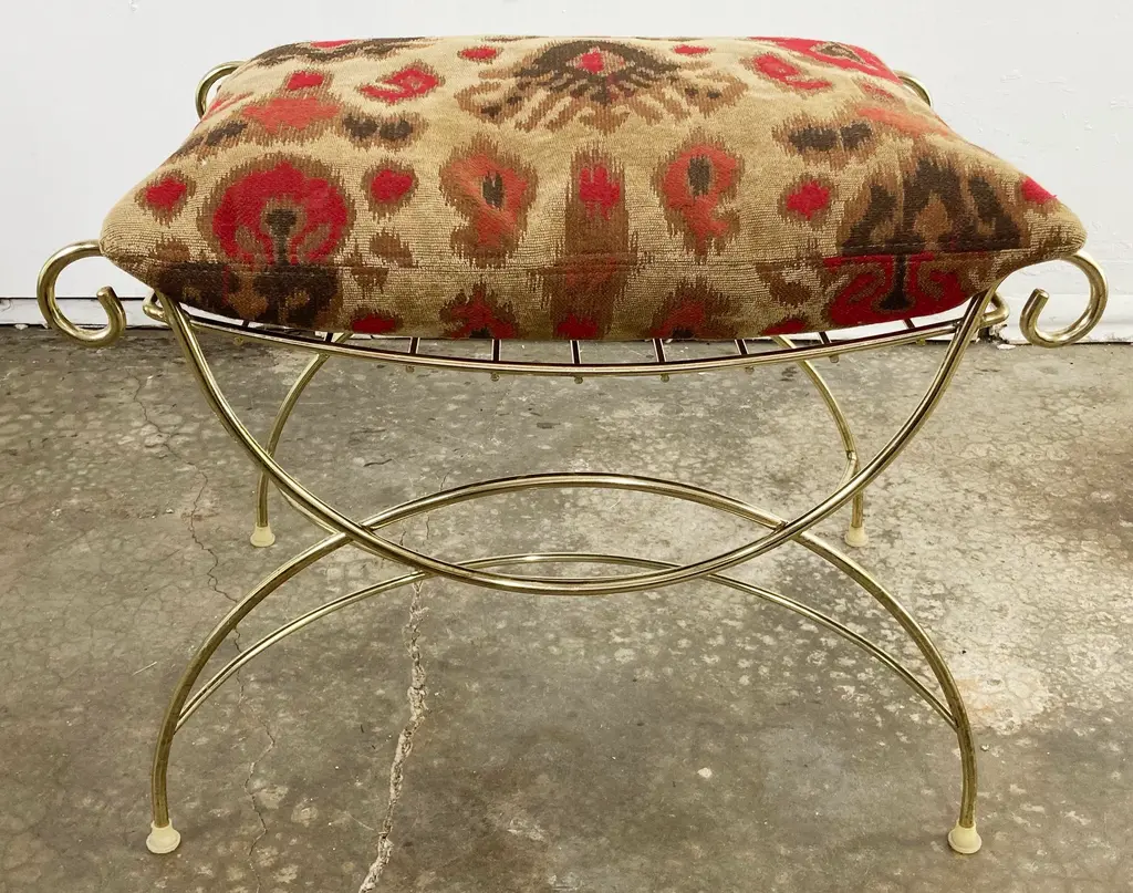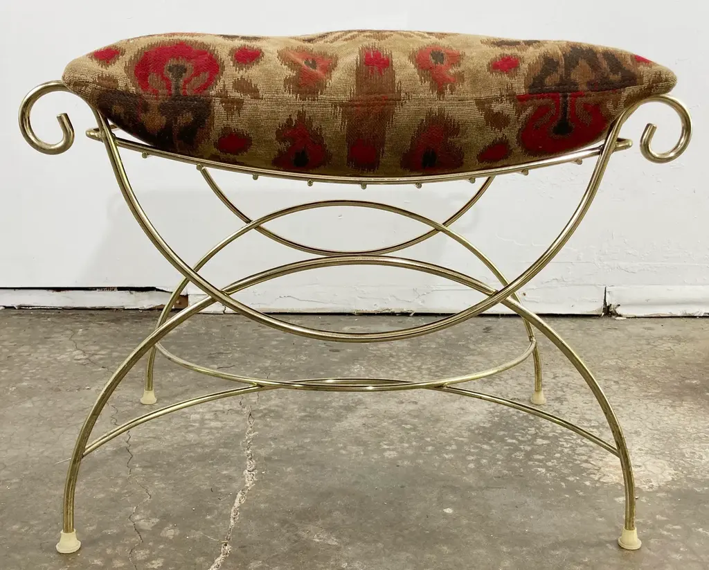 Vintage brass Hollywood Regency Curule style vanity bench stool with patterned jewel toned cushion. Patina to brass plate. Cushion free of rips or tears. Capped feet.