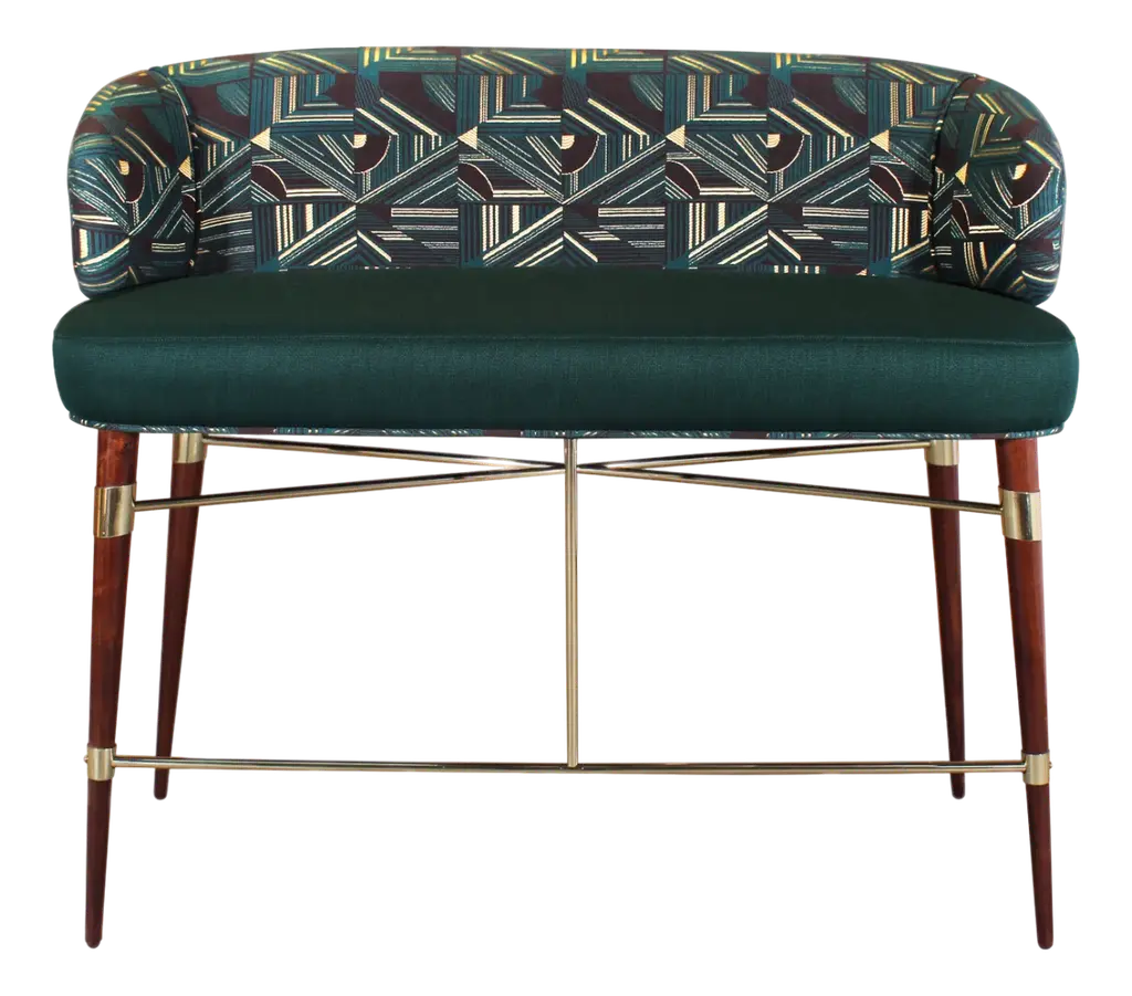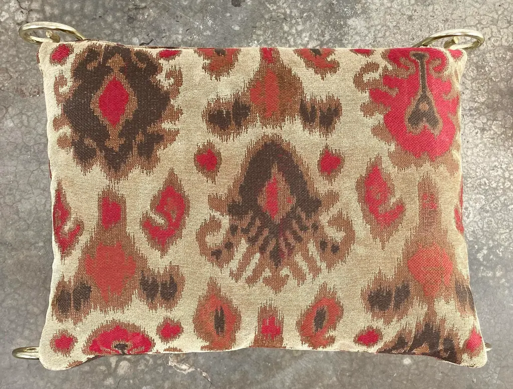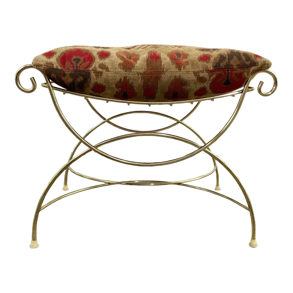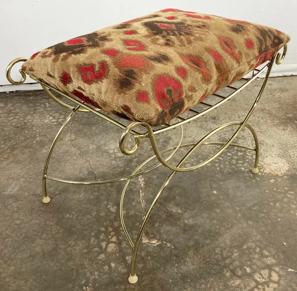 Vintage brass Hollywood Regency Curule style vanity bench stool with patterned jewel toned cushion. Patina to brass plate. Cushion free of rips or tears. Capped feet.