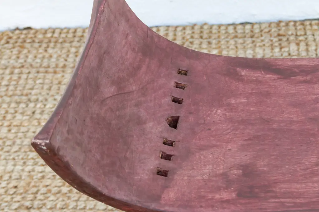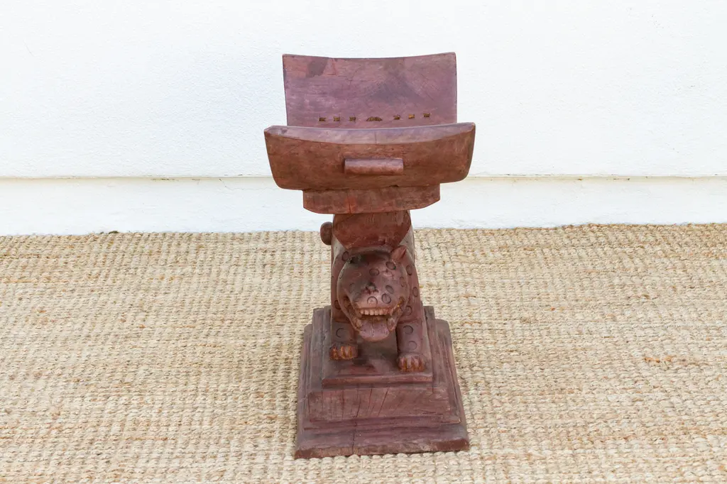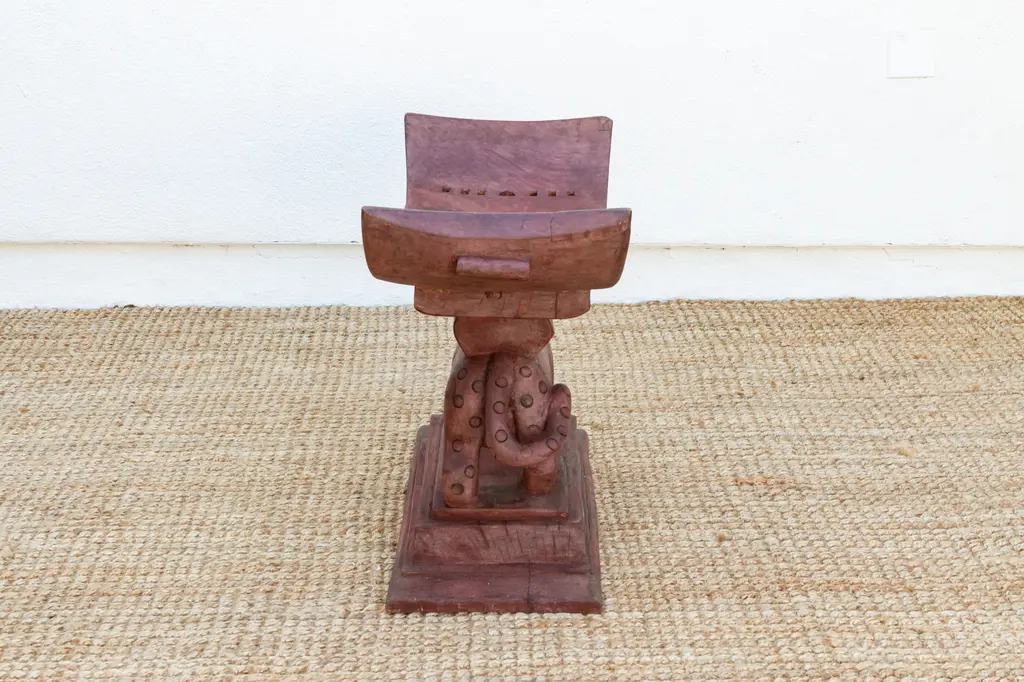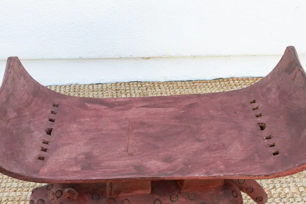 A symbol of status and power, this antique Asante stool is a must-have for collectors of African art. Hand-carved from a single block of wood, it features a traditional crescent-shaped seat, flat base, and intricate support structures with symbolic meaning. Asante stools are both practical and spiritual, representing the leadership and authority of tribal chiefs and kings. This unique carved African table can be used as an end table, nightstand, or decorative stool.