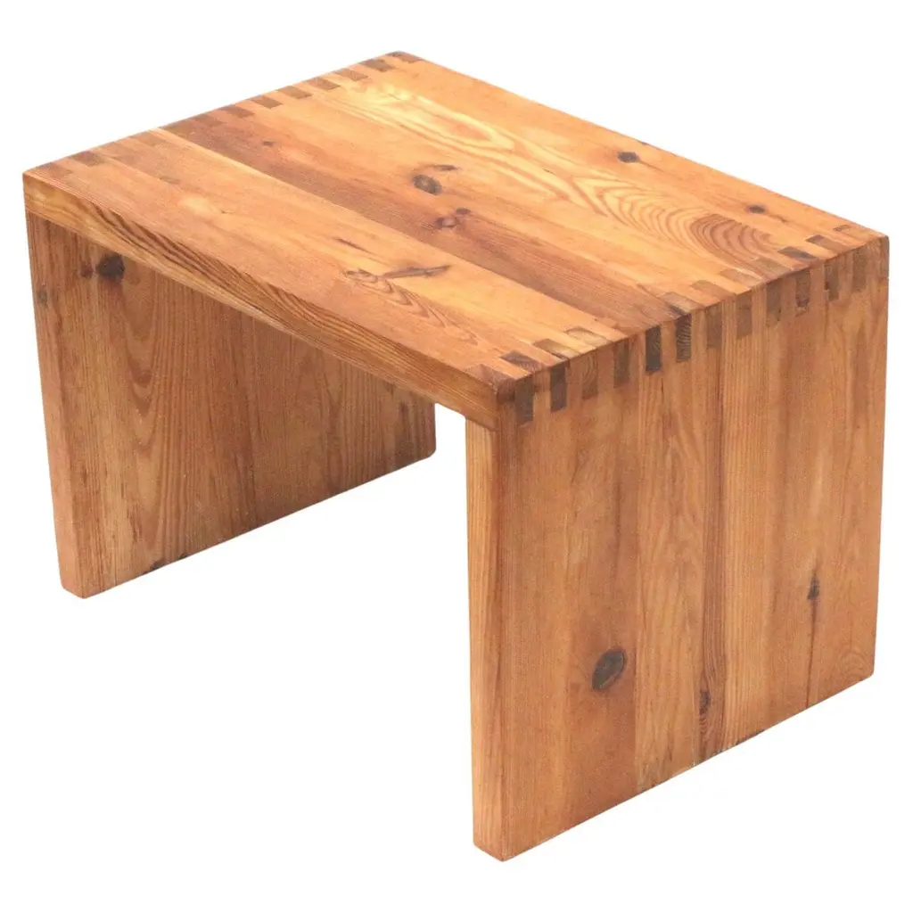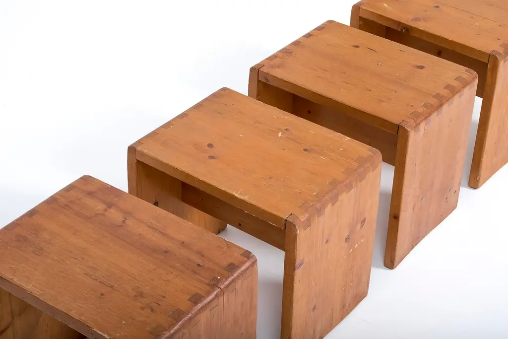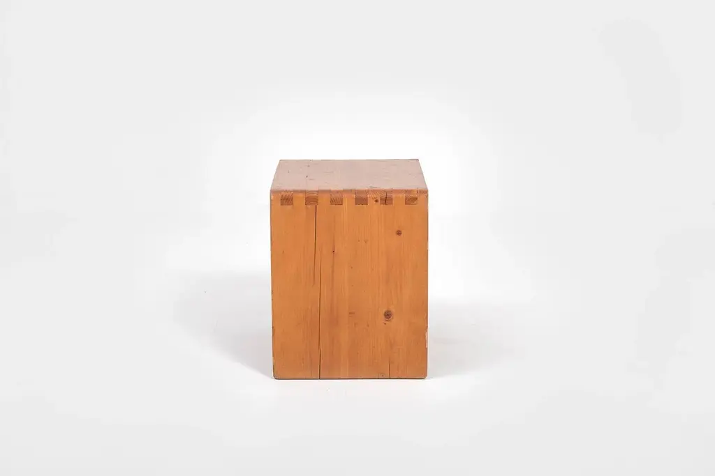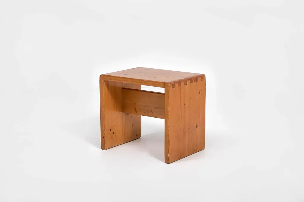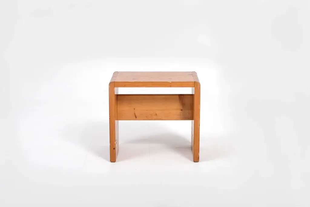The stool was originally part of a dining table set designed by Charlotte Perriand for the Les Arcs resort in France, circa 1968. The piece is made from pine. This piece is attributed to the mentioned designer/maker. It has no attribution mark and no official proof of authenticity, however it is well documented in design history. I take full responsibility for any authenticity issues arising from misattribution