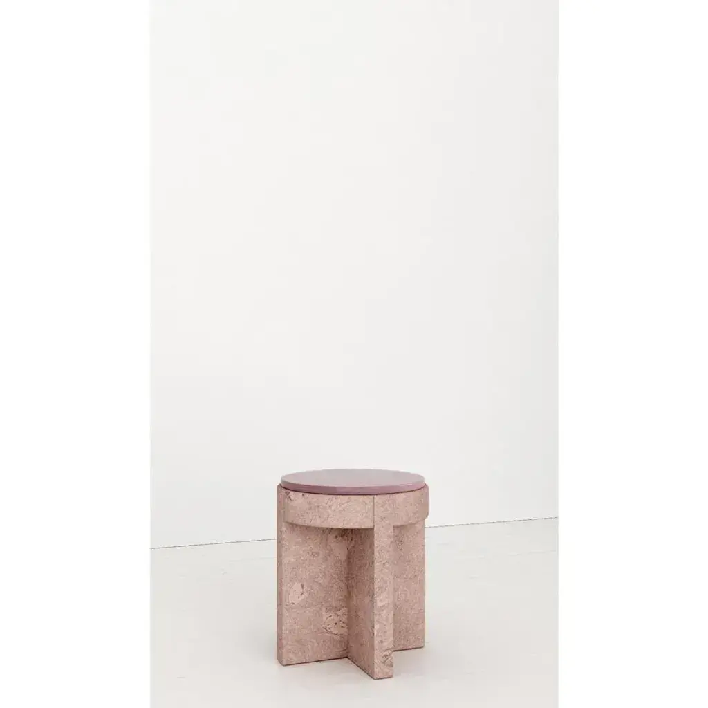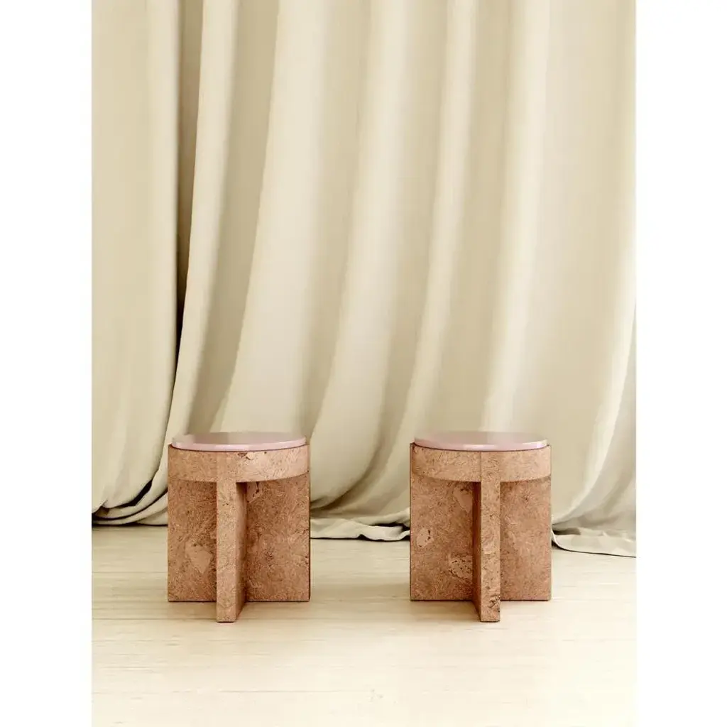 Object 05 violet seating by volta one of a kind. dimensions: d 40,5 x w 40,5 x h 47 cm. Materials: cork and ceramic. Also available in diffentent colors. the meï collection was born from the desire to highlight the cork material. A material known for its common and popular use, cork deserves special attention in terms of its aesthetic, constructive and ecological properties. Starting from cork, the volta agency has developed with the trizzano workshops several methods of compression to recycl this material. The patterns that were created then revealed all the subtlety of this material. To sublimate it even more, several colorimetric shades have been developed. The cork is thus bathed and colored, giving it a whole new image.