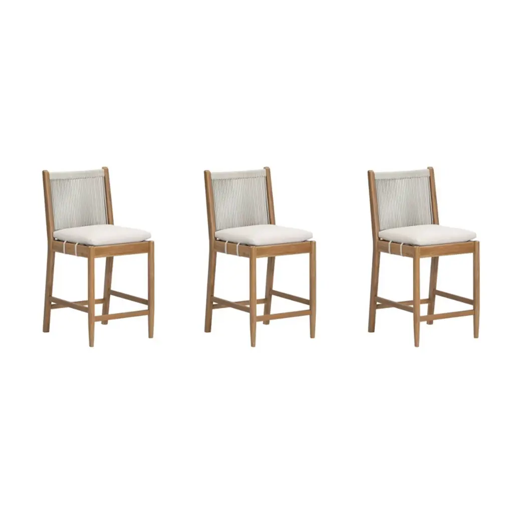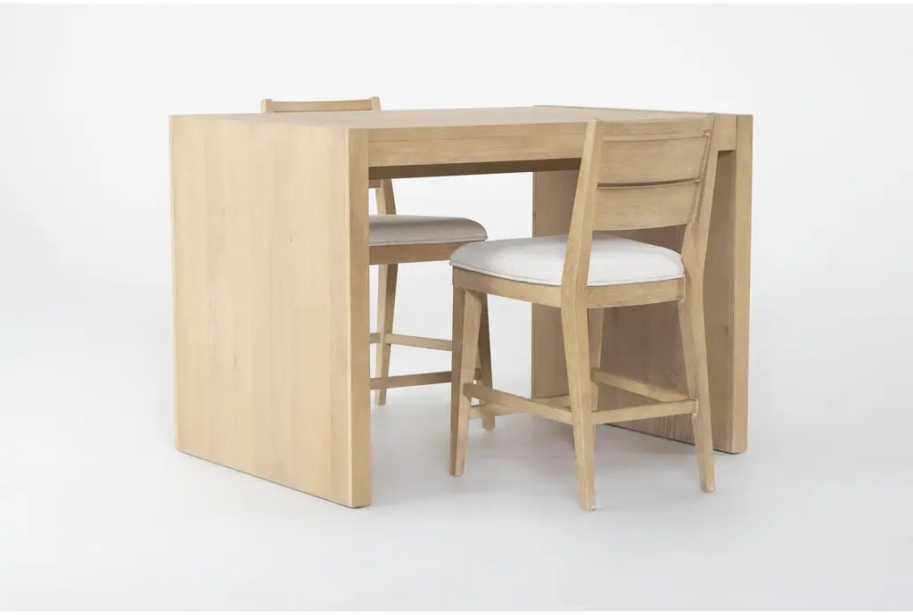 Enhance your dining room with the Voyage Natural 50" Counter Kitchen Island With Cream Upholstered Counter Height Stool Set For 2 by Nate Berkus + Jeremiah Brent. This modern, three-piece set features a natural wood finish and a comfortable cream upholstered stool, perfect for both dining and food prep. The solid hardwood construction ensures durability and timeless appeal.
