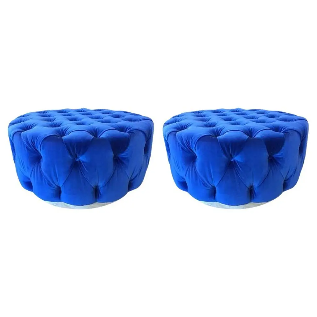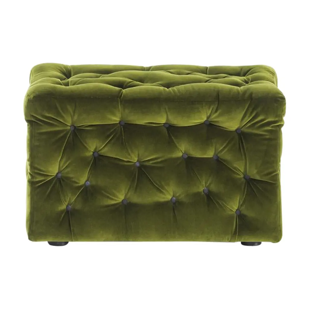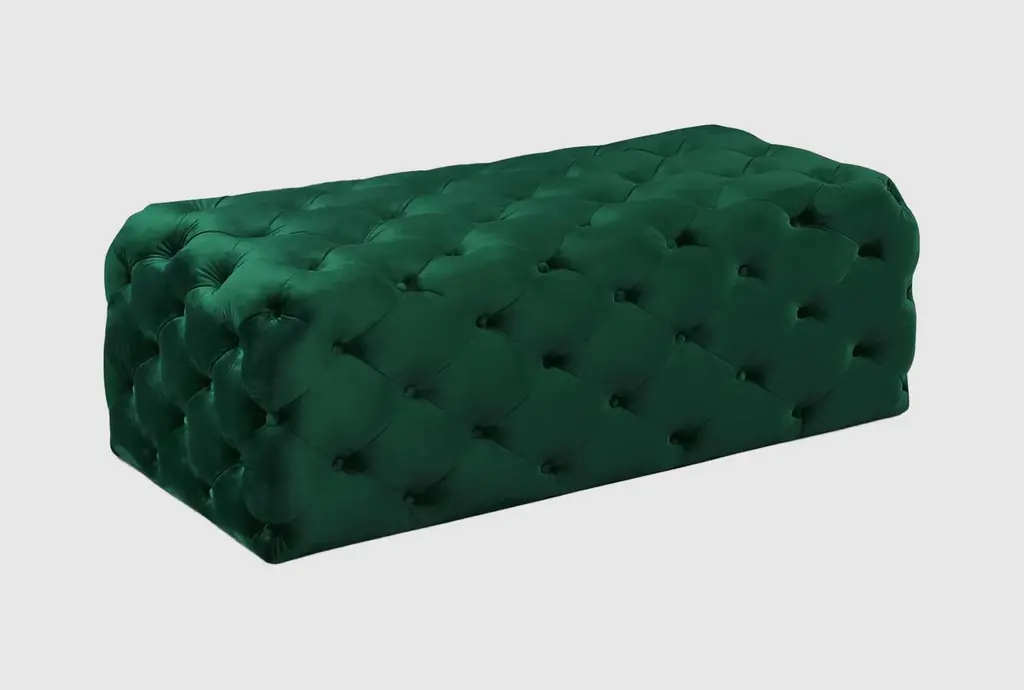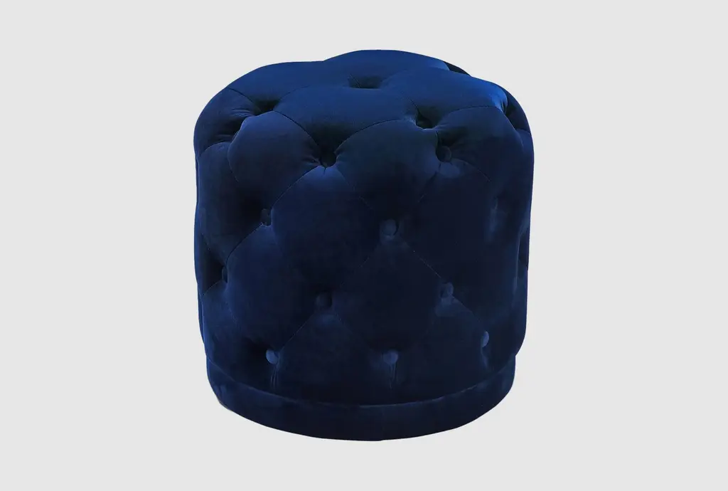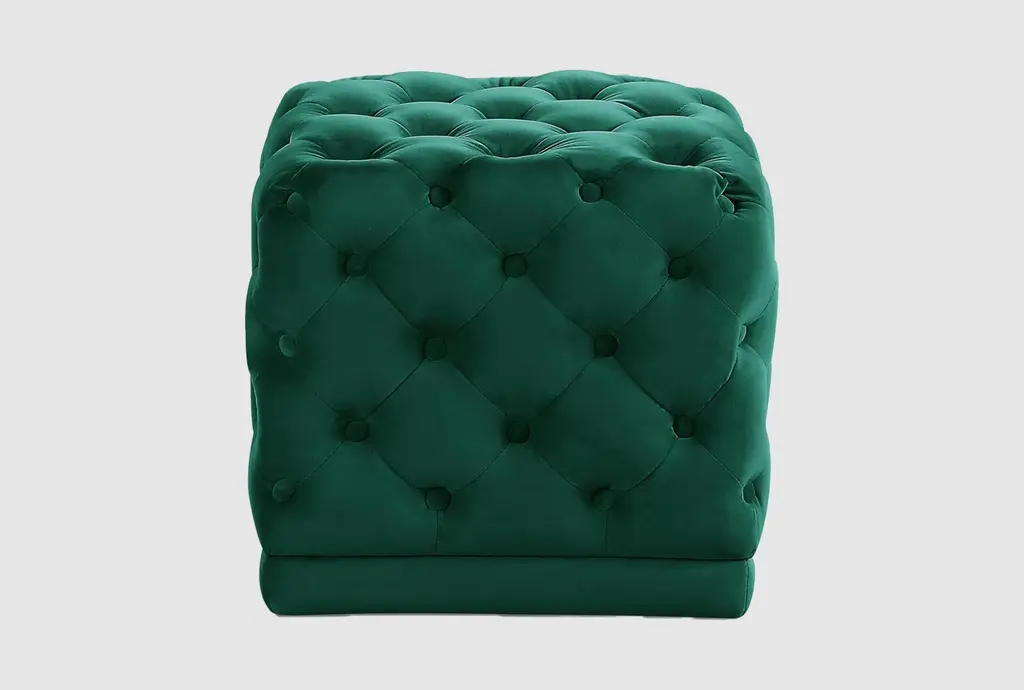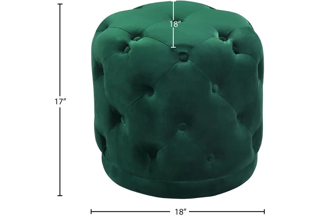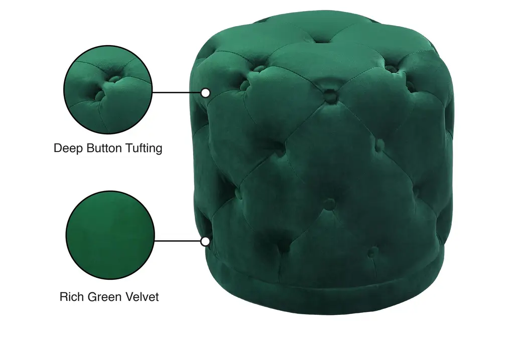 The Warrick Green Velvet Ottoman/Stool brings luxurious comfort to modern spaces. Its round silhouette features rich green velvet upholstery with deep button tufting.