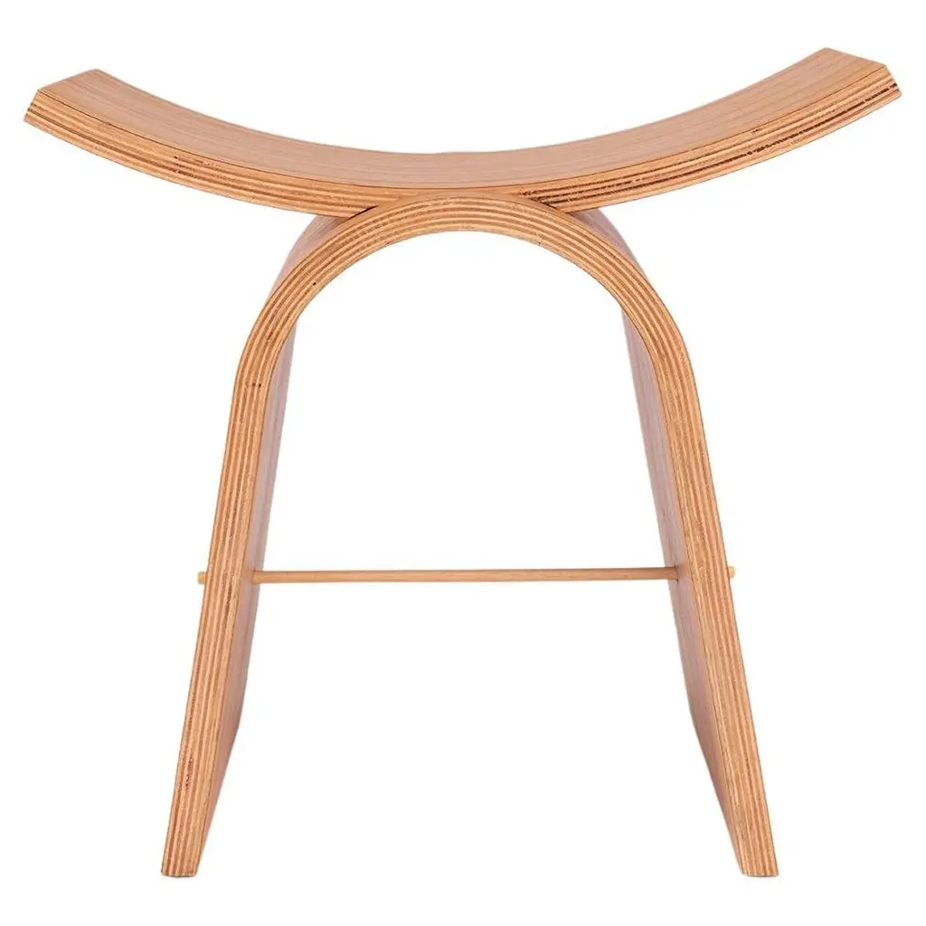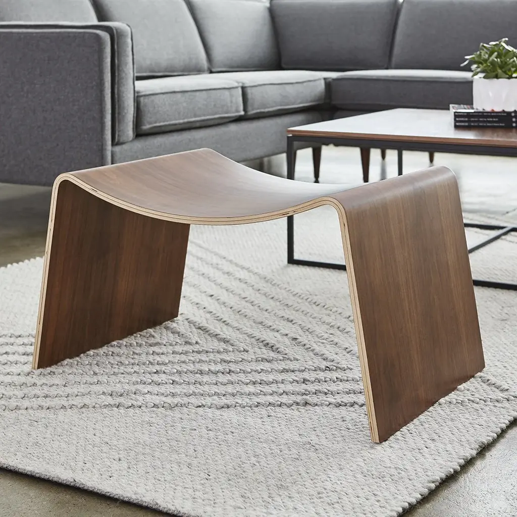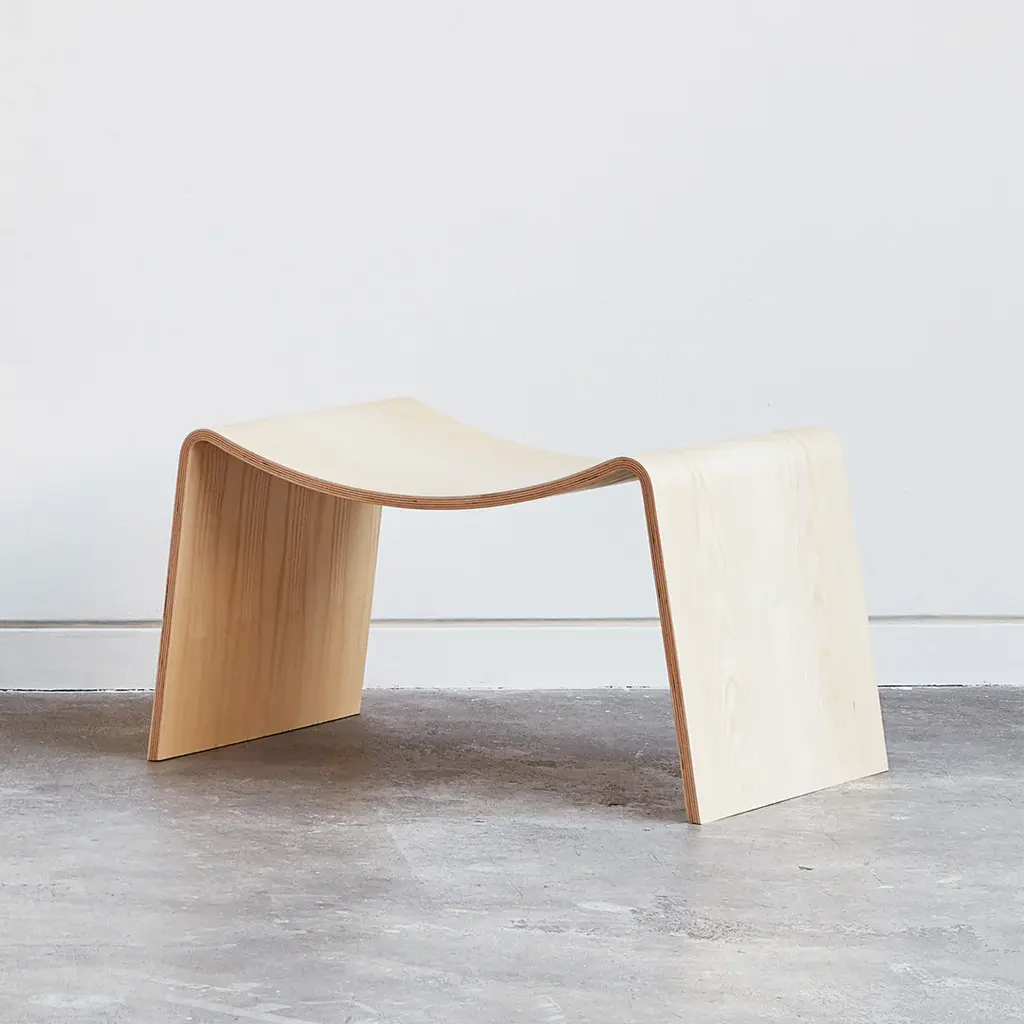 The Wave Stool’s smooth, flowing lines are an ode to the waters of Canada’s countless lakes and rivers. The cut edge reveals layers of exposed-ply, and the stool’s wide curve allows for a generous and accommodating seating area. Small-scaled and extremely versatile, the Wave Stool is perfect in living rooms, bedrooms or front hallways. Layers of plywood are pressed and molded into a 'wave' shape and finished with a real wood veneer. • Clear coat finish. • Features exposed plywood edges. • Plastic bumpers on bottom to prevent floor damage.