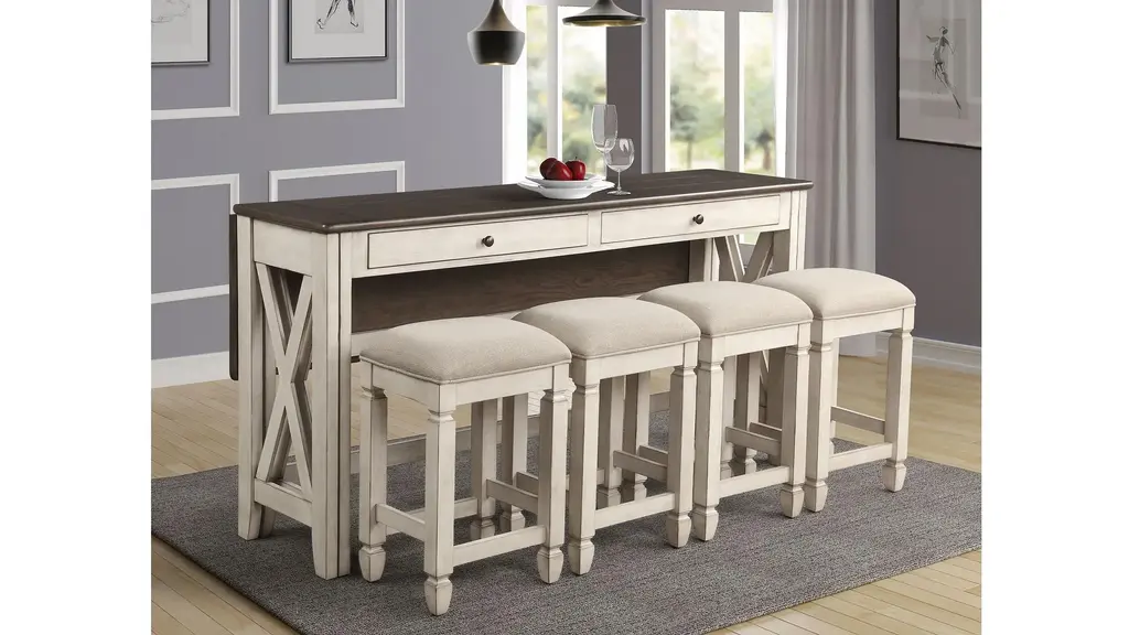 The Waverly counter height dining console with 4 stools offers a dedicated space for communal gatherings. Constructed with high-quality materials, this collection ensures durability and longevity. The smooth tabletop offers ample surface area for dining essentials, decorative items, or even a laptop, making it a versatile addition to your living space. The Waverly counter height dining console is not just limited to behind-the-sofa placement. It also seamlessly integrates into other areas of your home, such as compact kitchens, breakfast nooks, or even open concept living spaces. Its multi-purpose design makes it an excellent choice for those seeking flexibility and adaptability in their furniture choices.